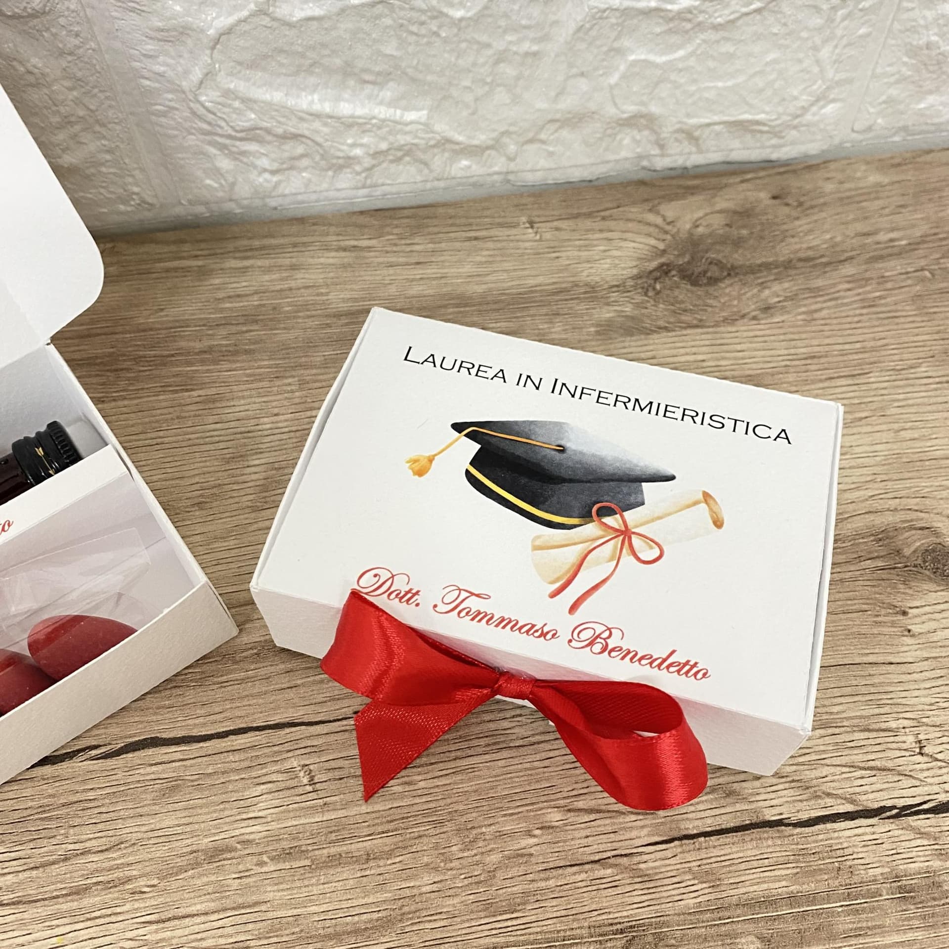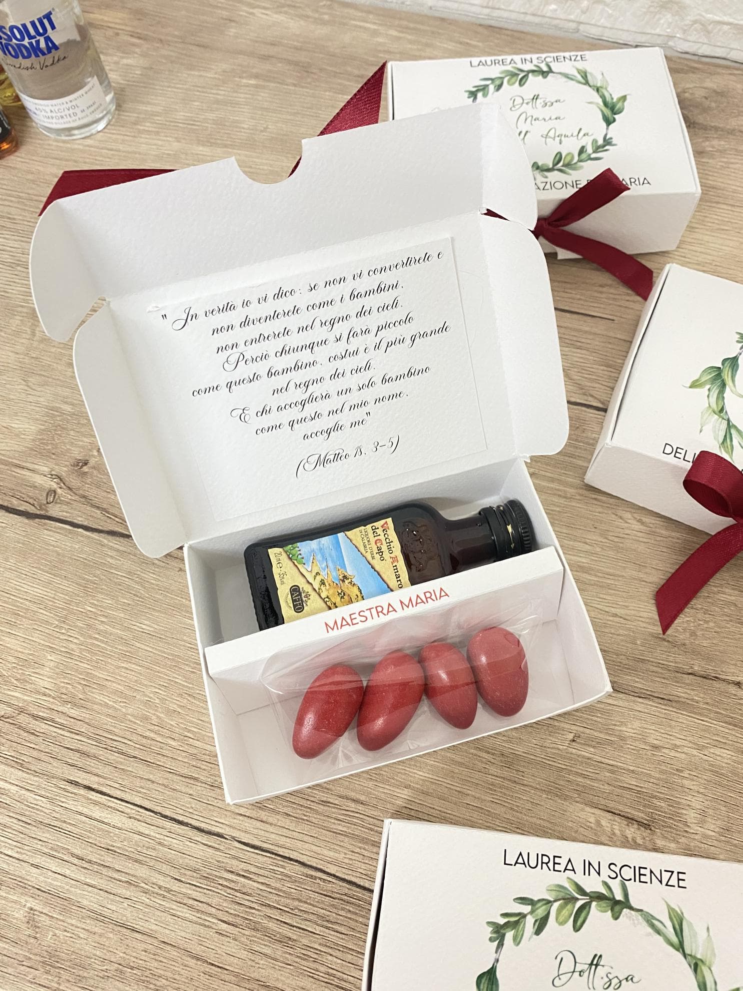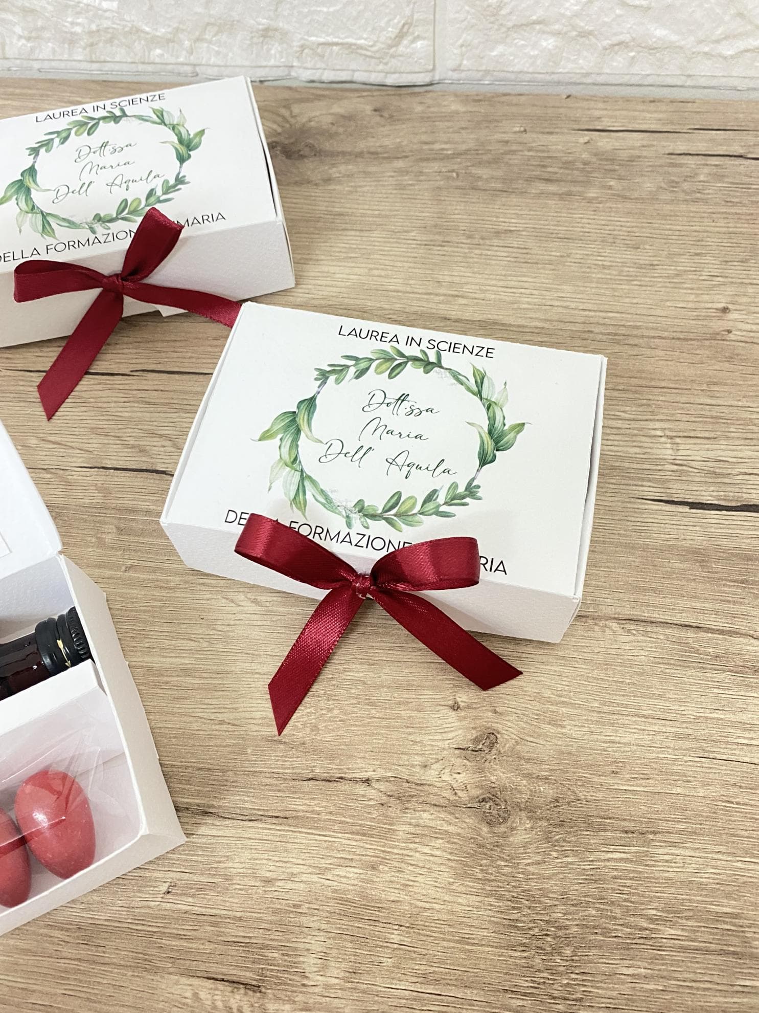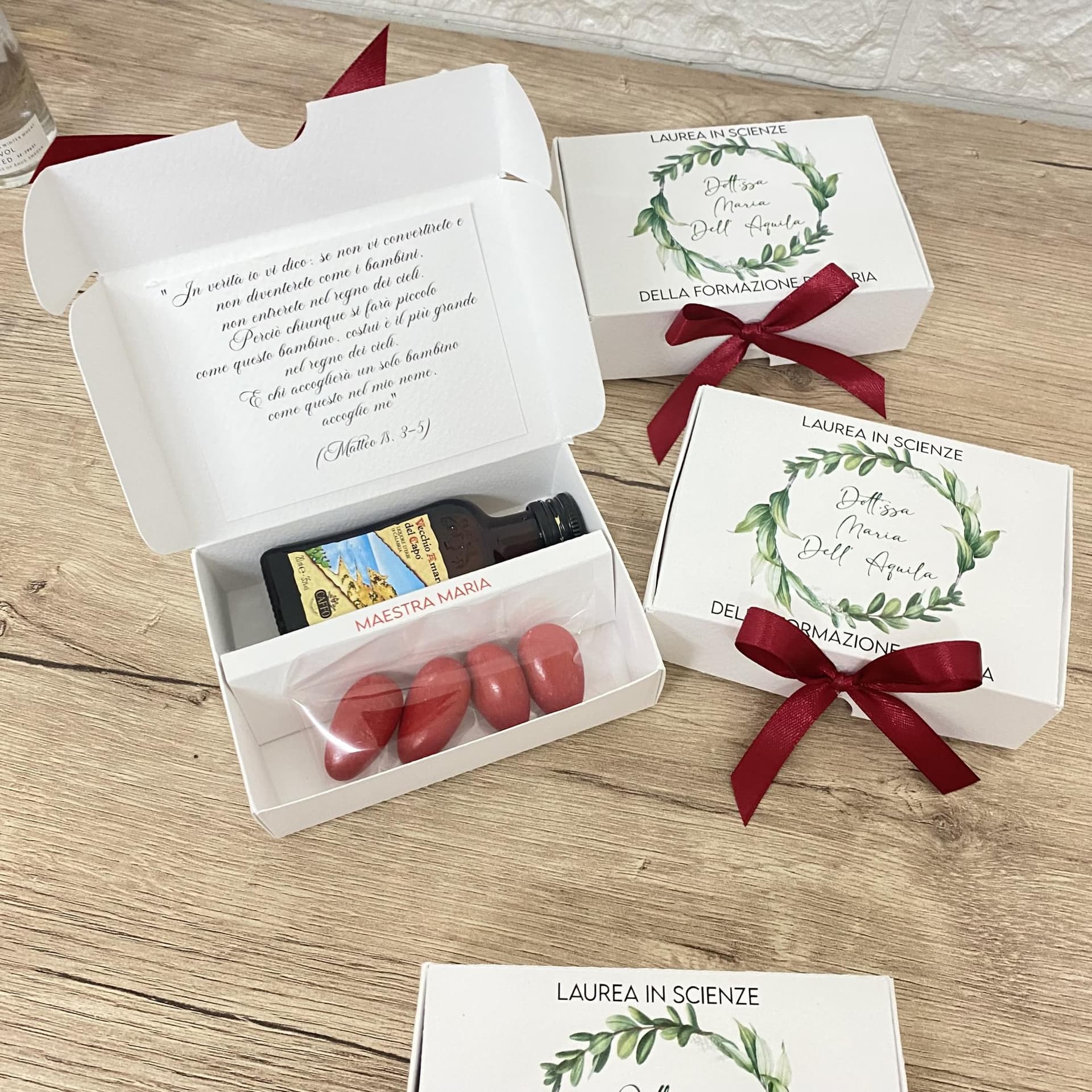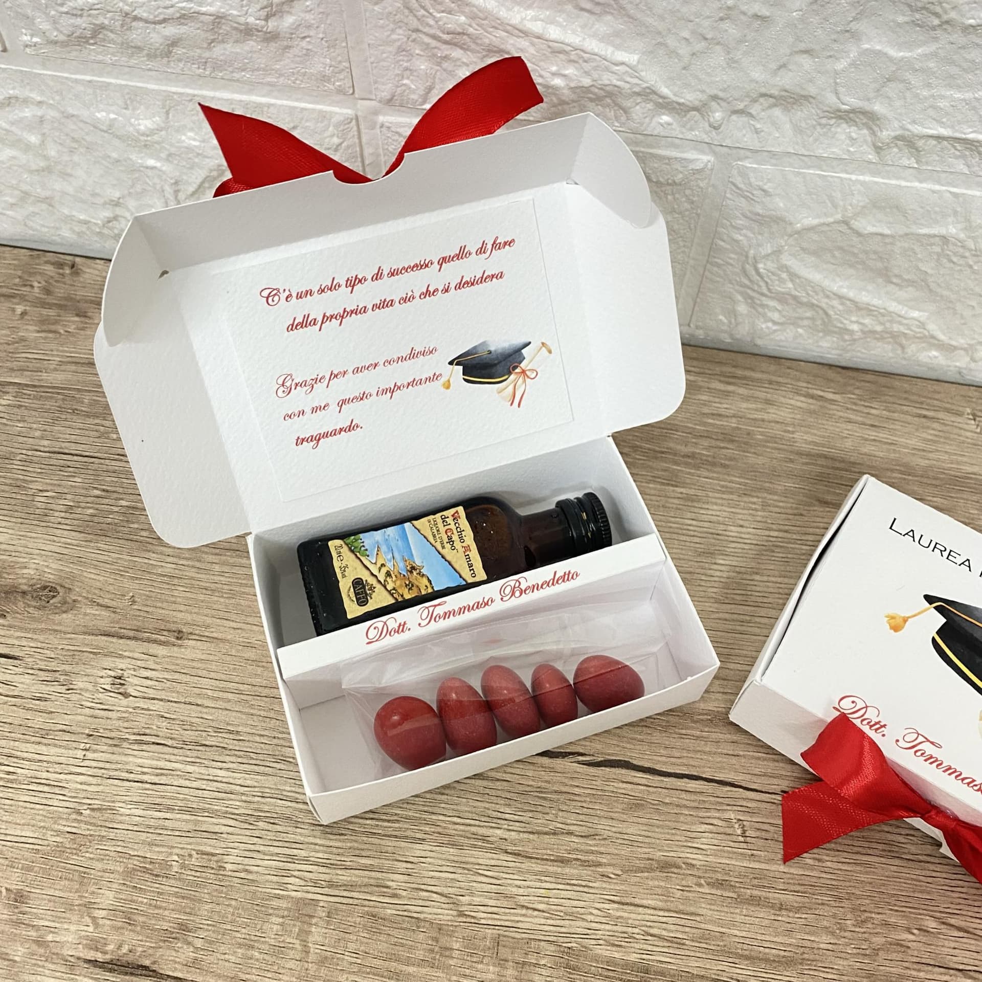 La scatola personalizzata è un'opera d'arte che avvolge con eleganza questo tesoro liquido, creando un'esperienza visiva di pura bellezza. Ma non è tutto: i cinque confetti gustosi, come piccoli tesori nascosti, aggiungono un tocco di dolcezza e sorpresa a questa bomboniera, completando il regalo con un'esplosione di sapori unici.