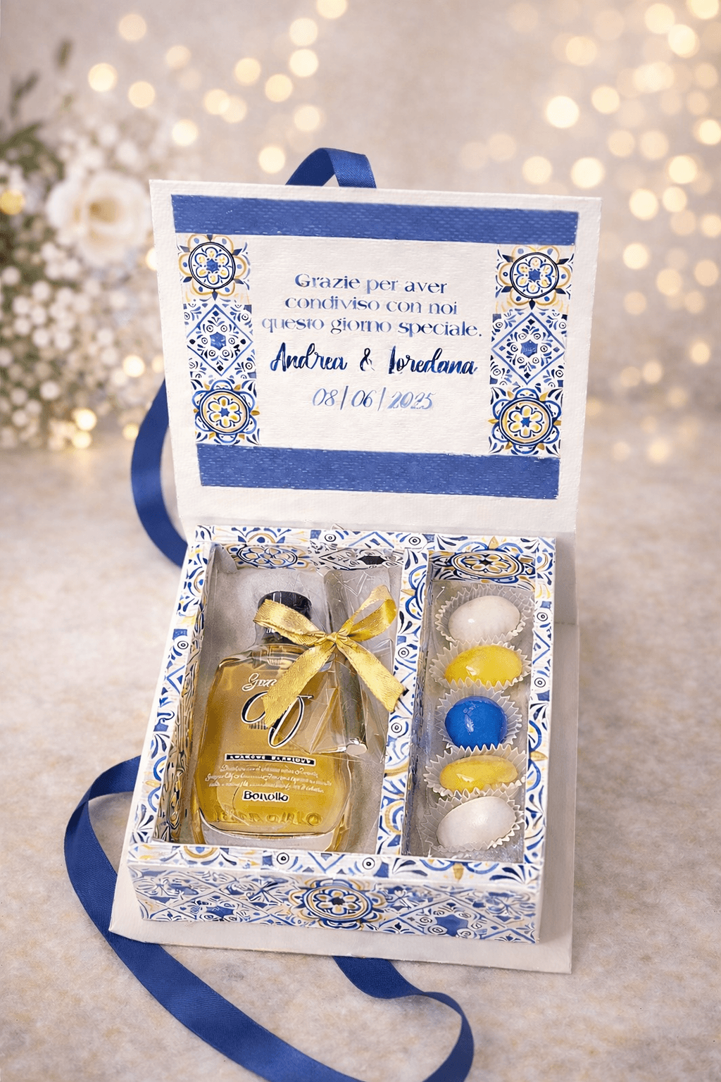La bomboniera perfetta per celebrare momenti speciali e condividere gioia e felicità con i tuoi cari. All'esterno, una scatola elegante e raffinata con una stampa personalizzata, che aggiunge un tocco unico e memorabile. Ogni dettaglio è curato con attenzione, rendendo questa bomboniera un regalo indimenticabile per tutti gli ospiti, all'interno una miniatura di liquore Bonollo Amarone, un distillato di qualità superiore con un sapore ricco e avvolgente, perfetto per festeggiare in grande stile. Accanto al liquore, una deliziosa selezione di confetti in gusti assortiti, che delizieranno il palato di chiunque li assaggi. La combinazione di dolce e liquore crea un'esperienza gustativa unica e piacevole.