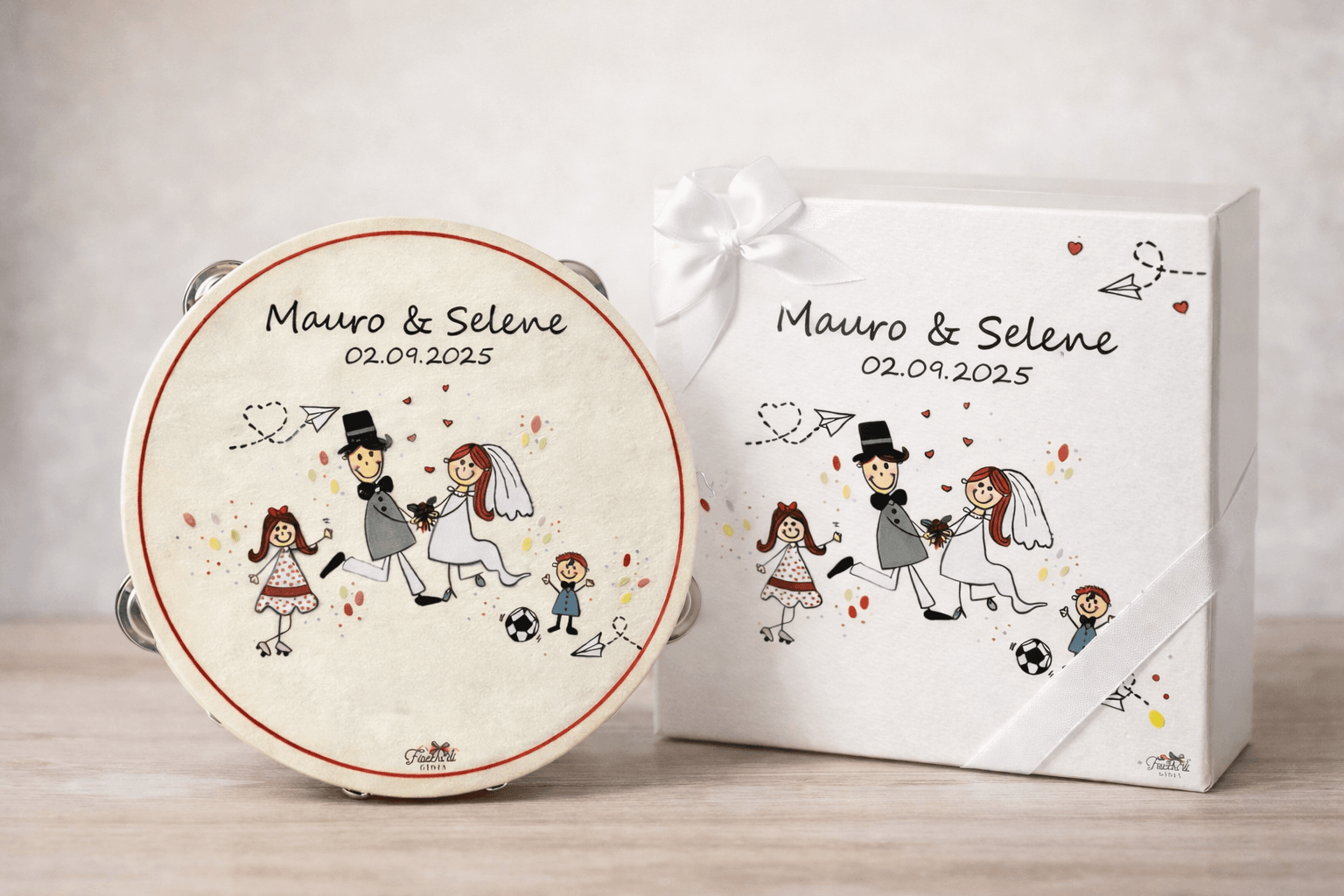 Celebra il giorno più bello della vostra vita con una bomboniera unica e originale: un tamburello artigianale con stampa personalizzata, simbolo di gioia e tradizione. Ogni bomboniera è accompagnata da una raffinata scatola coordinata, contenente confetti di alta qualità e due bigliettini: uno con una frase speciale e uno con i dettagli del vostro evento. Perfetta per lasciare un’impronta indelebile nel cuore dei vostri ospiti, un dono che racconta la vostra storia con stile e creatività.