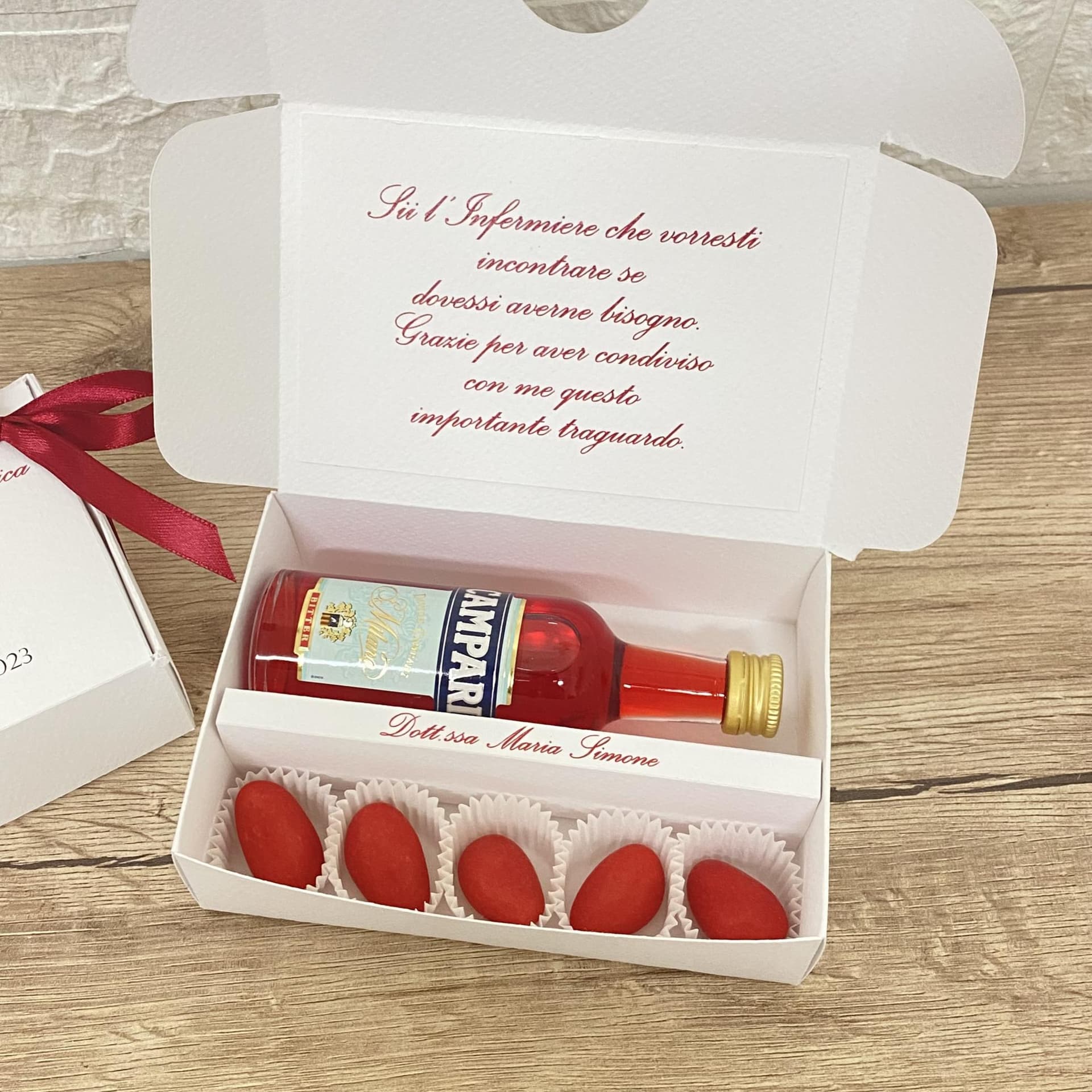 Queste bomboniere di Campari mignon da 5cl abbinate a scatole personalizzate con 5 confetti sono un connubio irresistibile di eleganza, tradizione e gioia, perfette per celebrare un'occasione speciale.