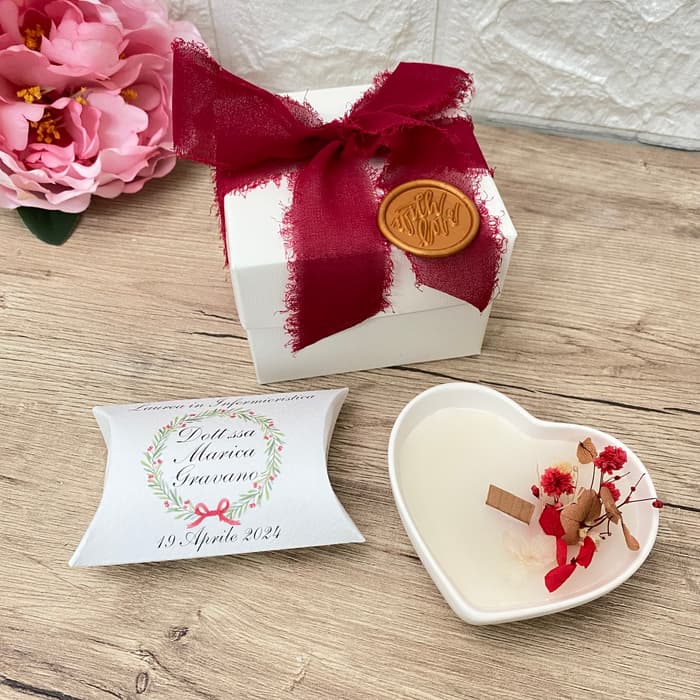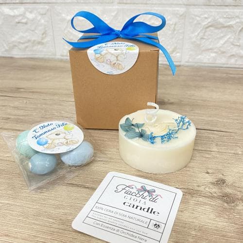 La confezione comprende una scatola coordinata che completa l'esperienza visiva, aggiungendo un tocco di eleganza e rendendo queste candele un regalo perfetto per qualsiasi occasione. Ma non è tutto: all'interno troverai anche una bustina contenente 3 confetti irresistibili, una deliziosa sorpresa per indulgere i tuoi sensi oltre alla fragranza avvolgente della candela.