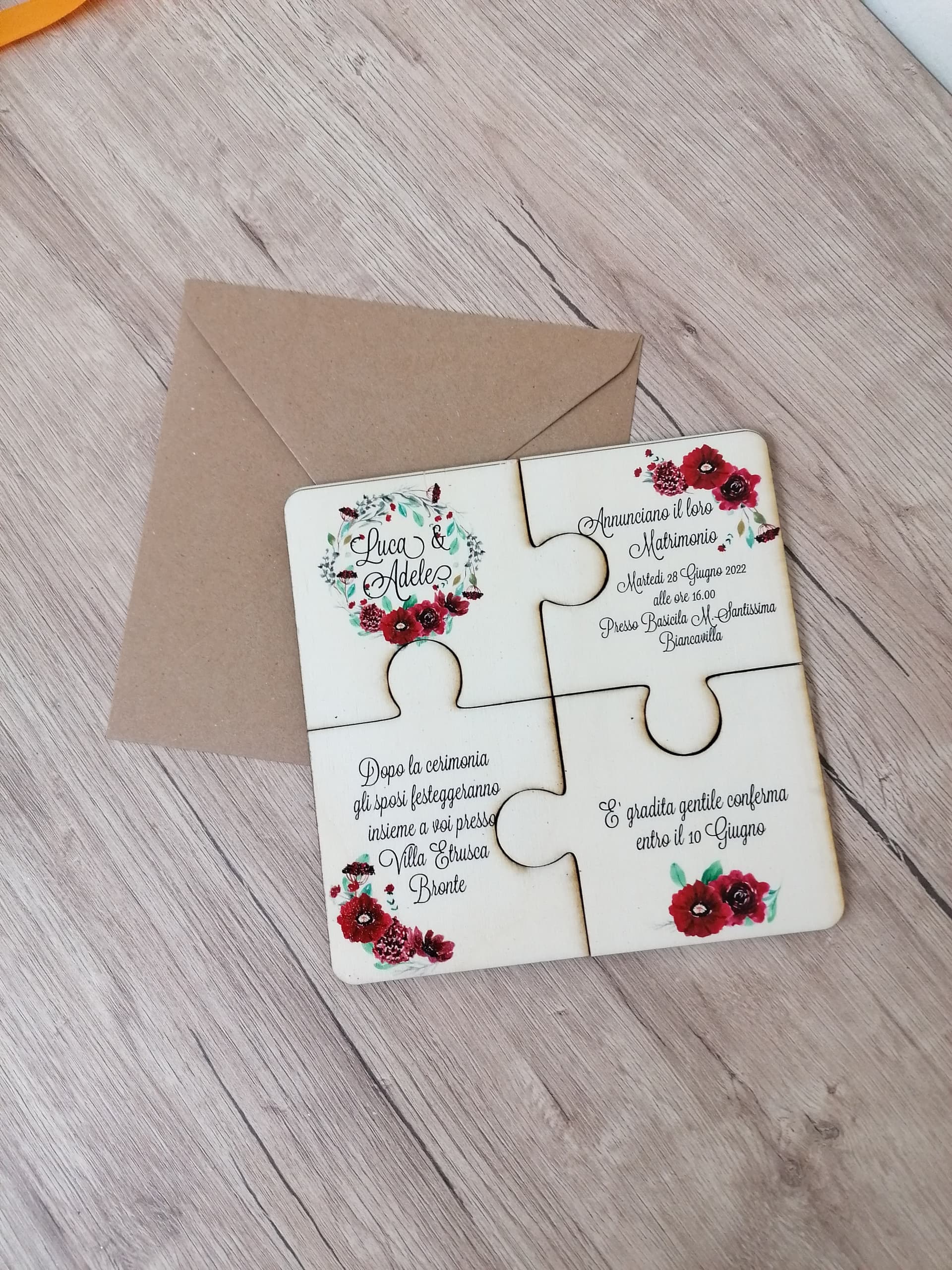 Partecipazione in legno composta da invito in formato 4 pezzi di puzzle racchiuso in una busta o scatolina, con stampa di colore a scelta