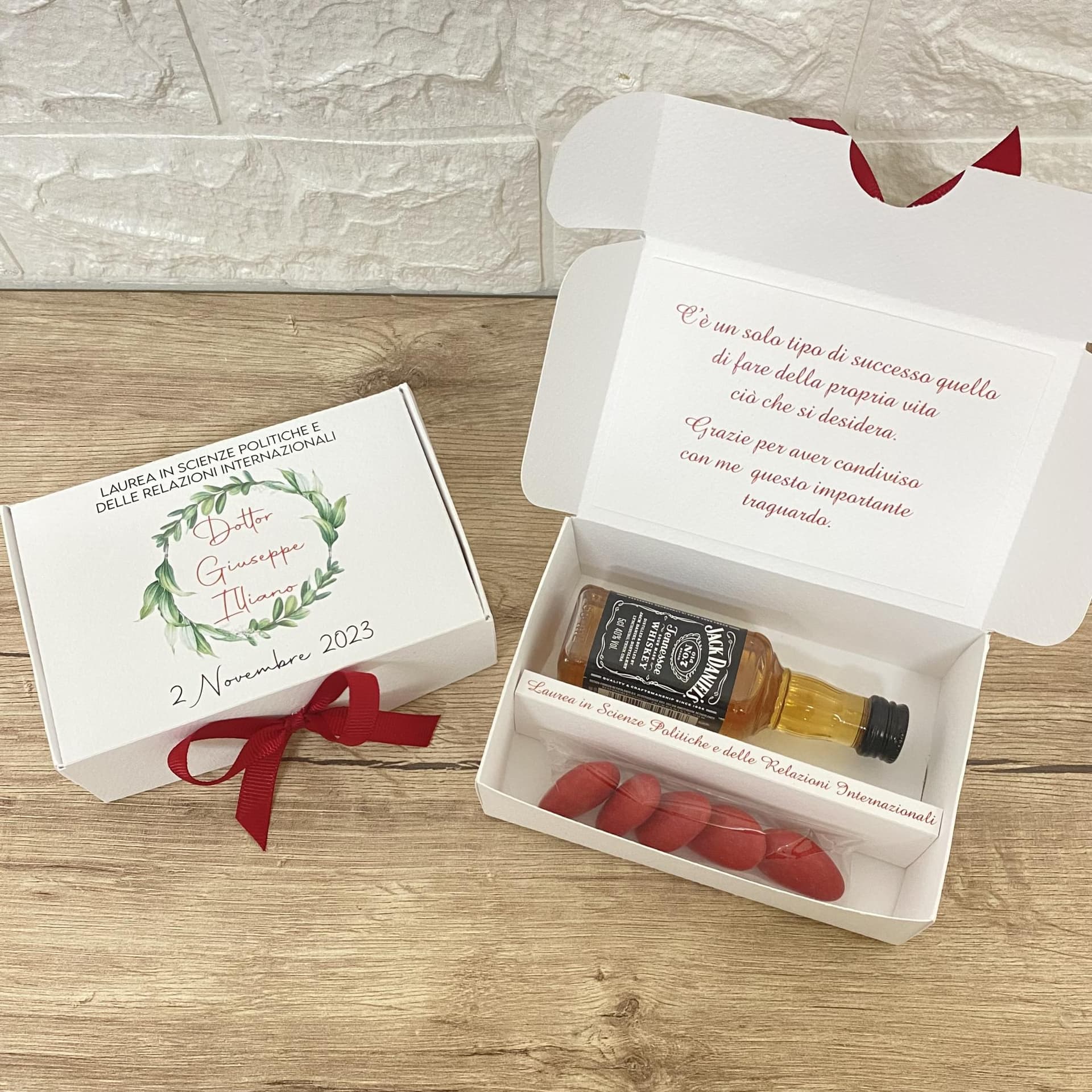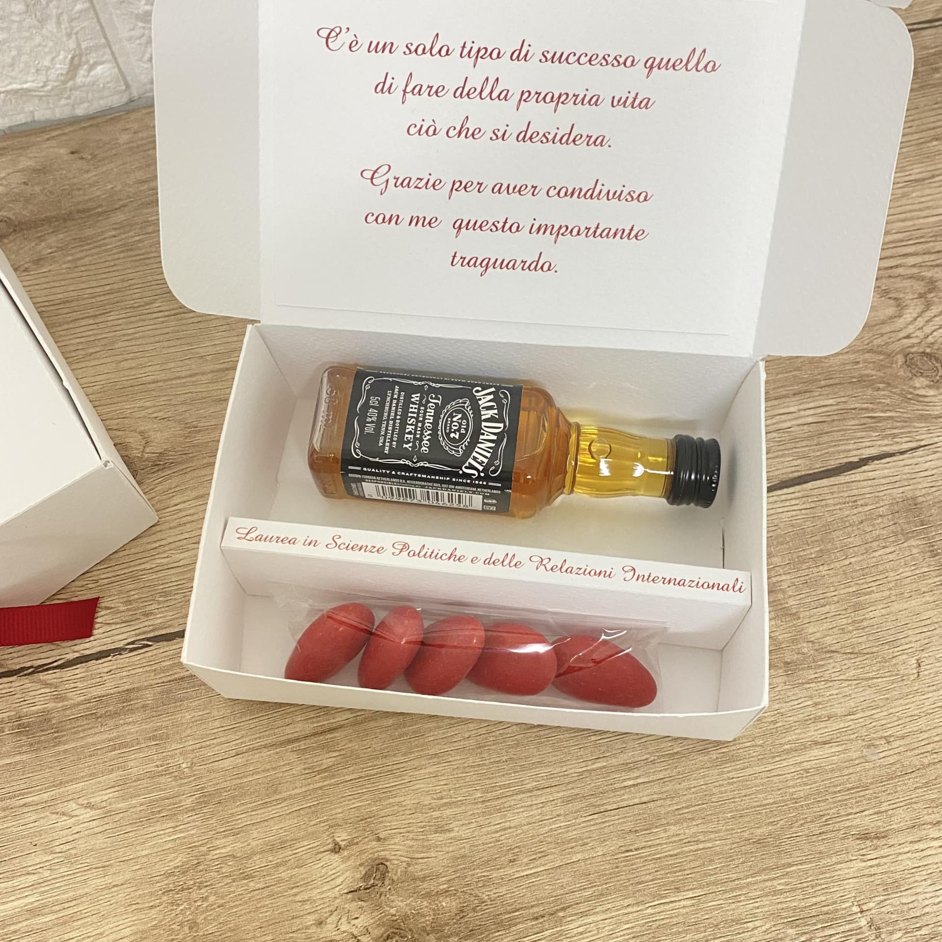 Queste bomboniere con il liquore mignon di Jack Daniel's da 5cl, abbinato a scatole personalizzate e confetti rossi, sono un'esplosione di gusto, eleganza e passione, un regalo perfetto per celebrare un'occasione speciale.