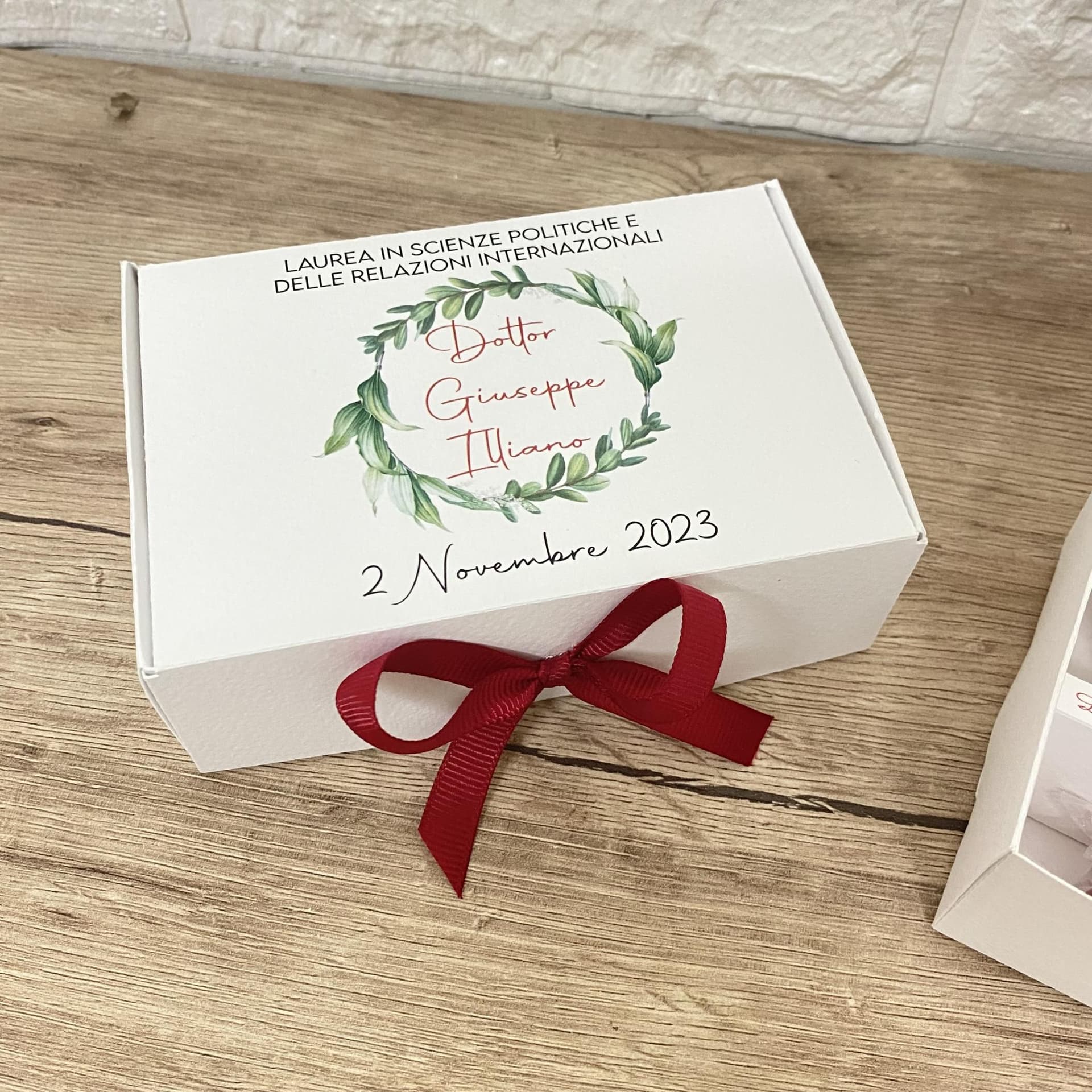 Le scatole personalizzate sono il tocco che rende queste bomboniere davvero uniche. Potete aggiungere nomi, date o un messaggio personalizzato sulla scatola, trasformandola in un ricordo tangibile dell'evento. Questa personalizzazione dà ad ogni bomboniera un tocco speciale che la rende perfetta per celebrare il destinatario in modo unico.