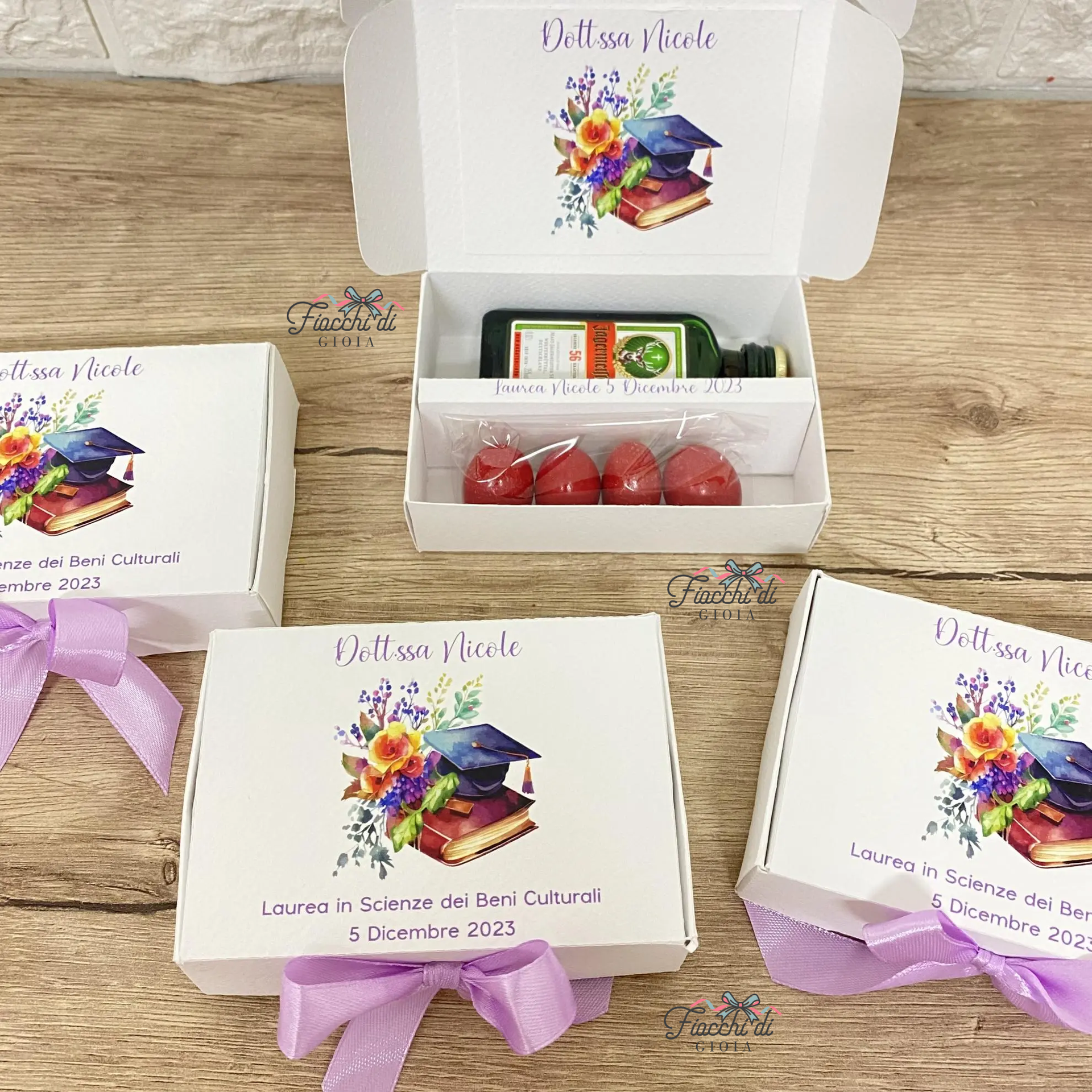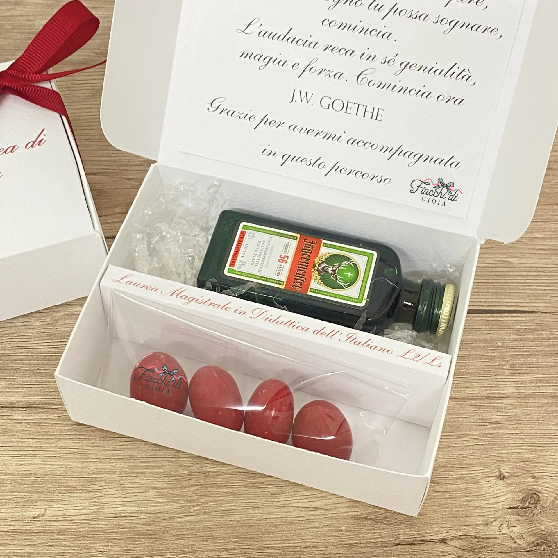 Festeggia il grande traguardo con un tocco di originalità! Le nostre bomboniere di laurea uniscono l'eleganza di una scatola personalizzata alla vivacità di una mini bottiglia di Jägermeister. Un ricordo unico che sorprenderà i tuoi ospiti, simbolo di successo e brindisi futuri. La scatola, curata nei dettagli e realizzata con materiali di alta qualità, può essere personalizzata con il nome del laureato, la data e un messaggio speciale. Perfetta per chi cerca qualcosa di moderno, audace e indimenticabile!