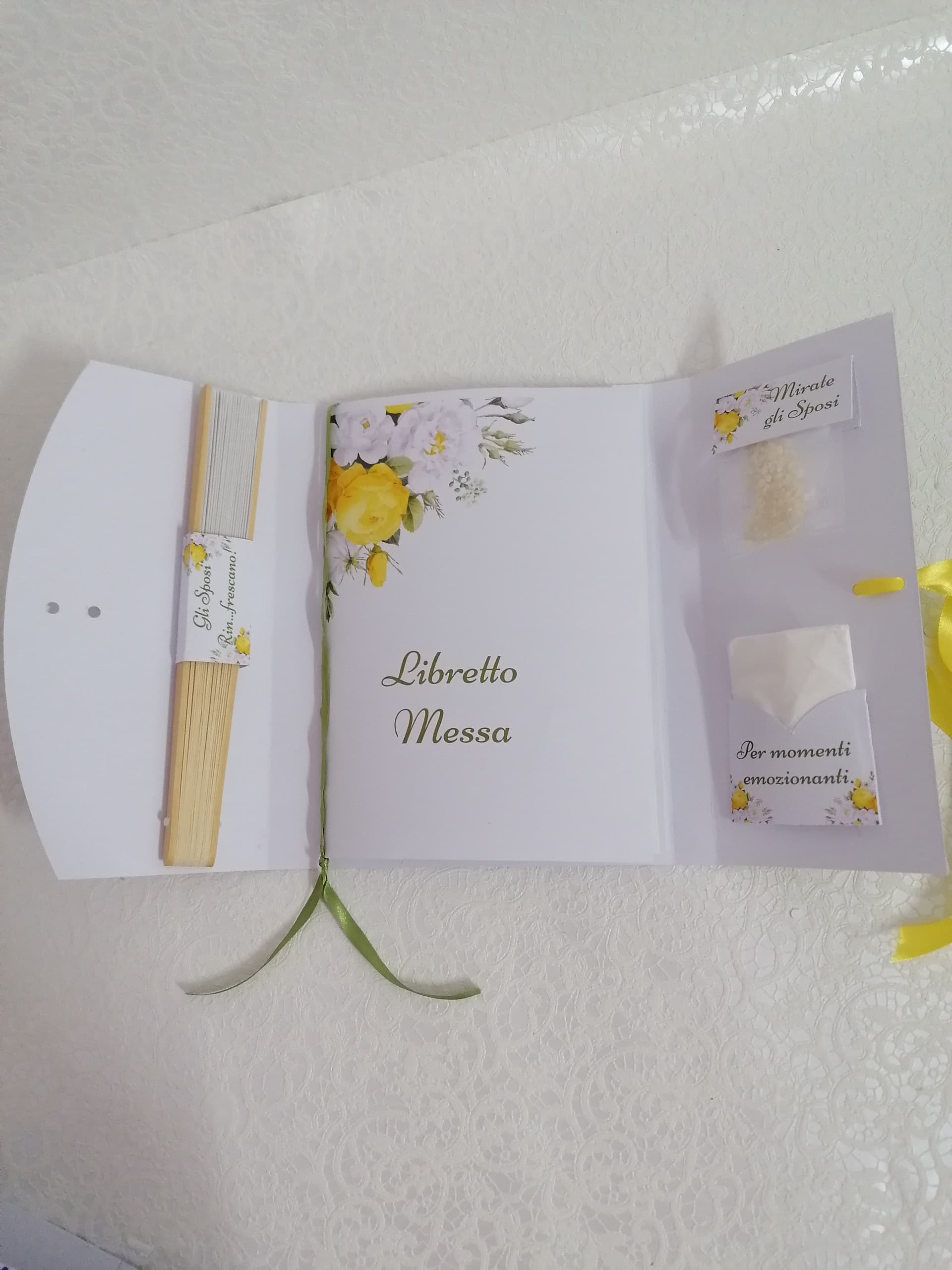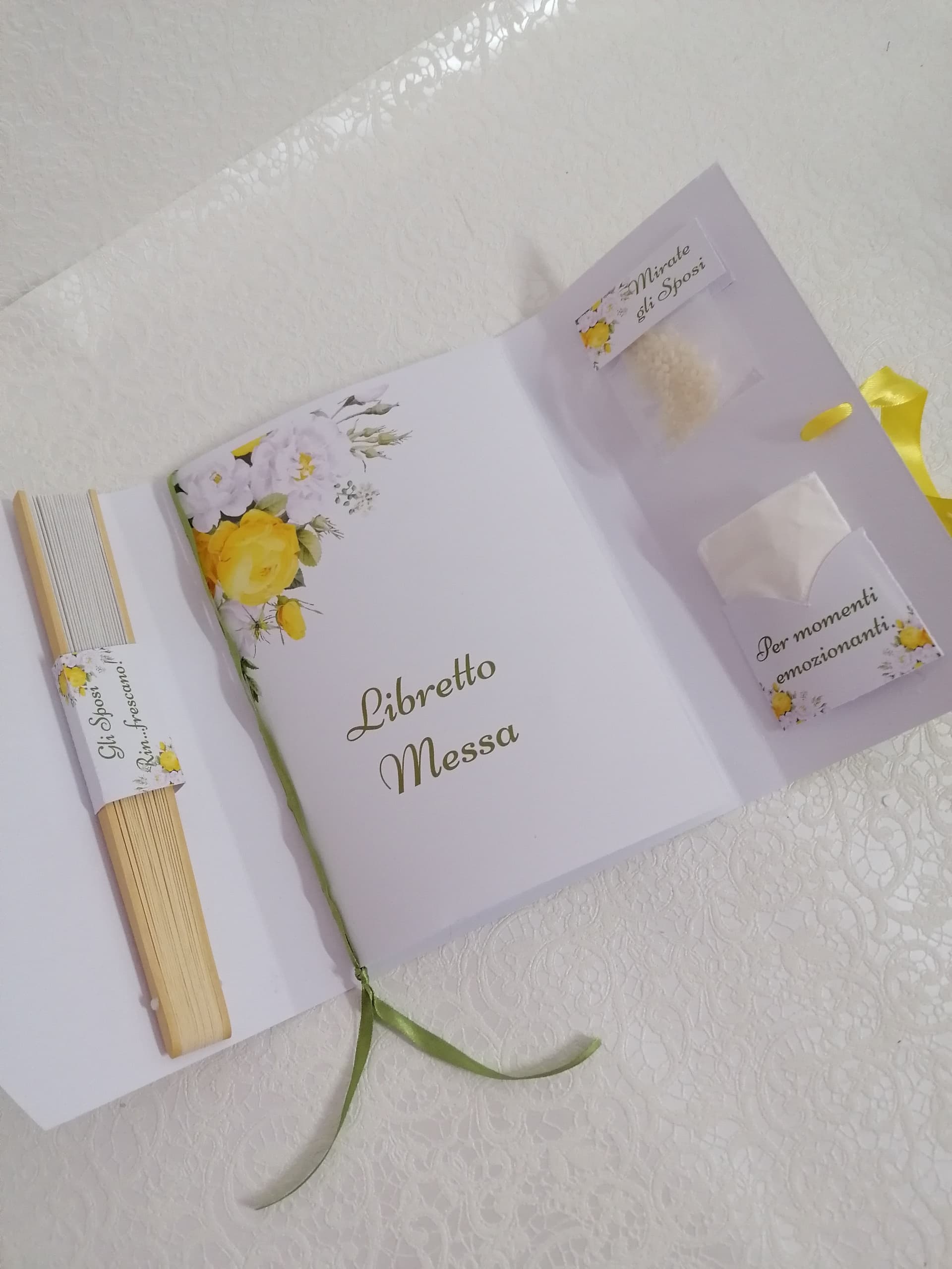 Oltre alle preghiere e ai canti, il libretto messa include una serie di accessori essenziali, come fazzoletti, ventagli e altro ancora, tutto accuratamente inserito in un'unica confezione. Questo permette agli ospiti di immergersi nell'atmosfera sacra e di affrontare ogni emozione con serenità e rispetto.