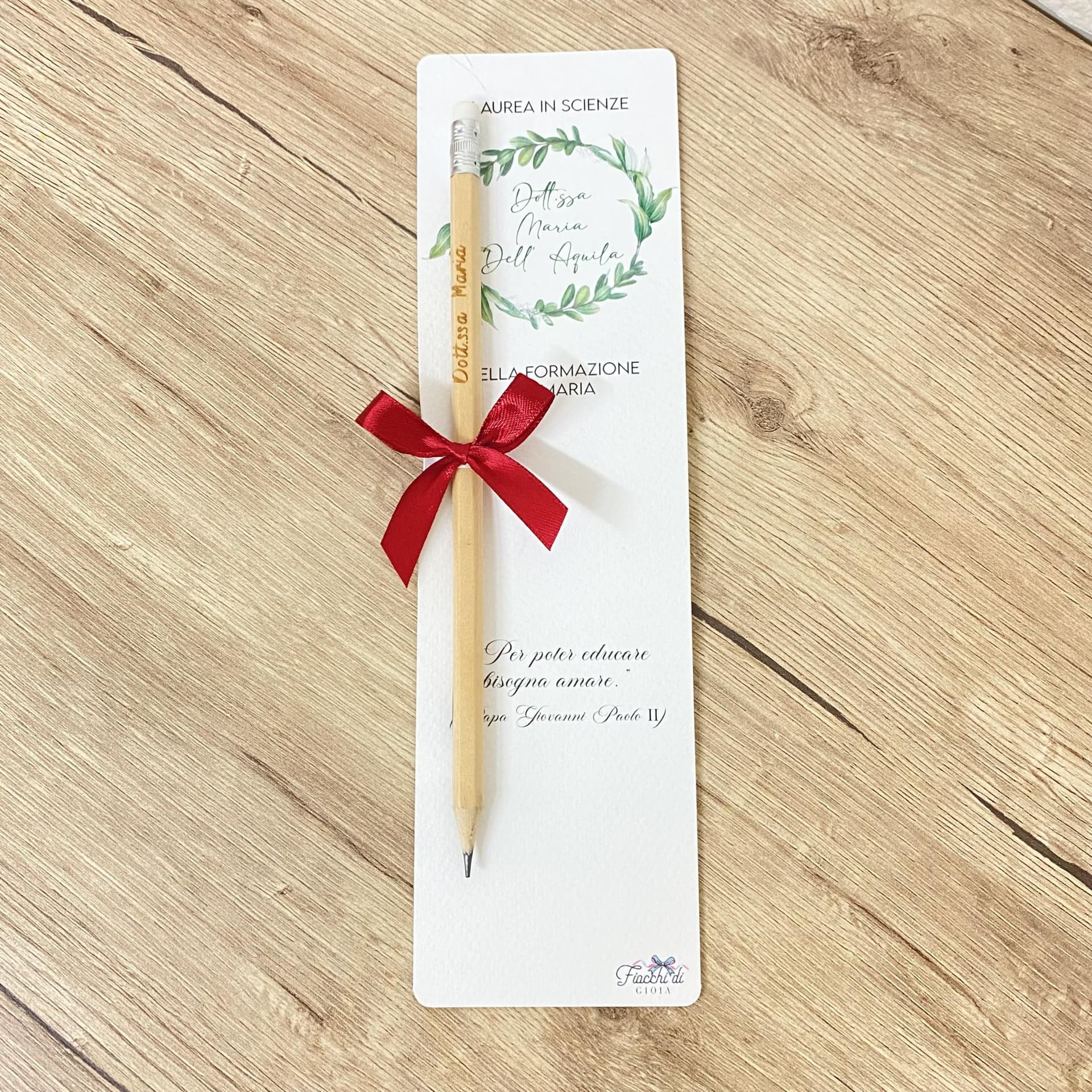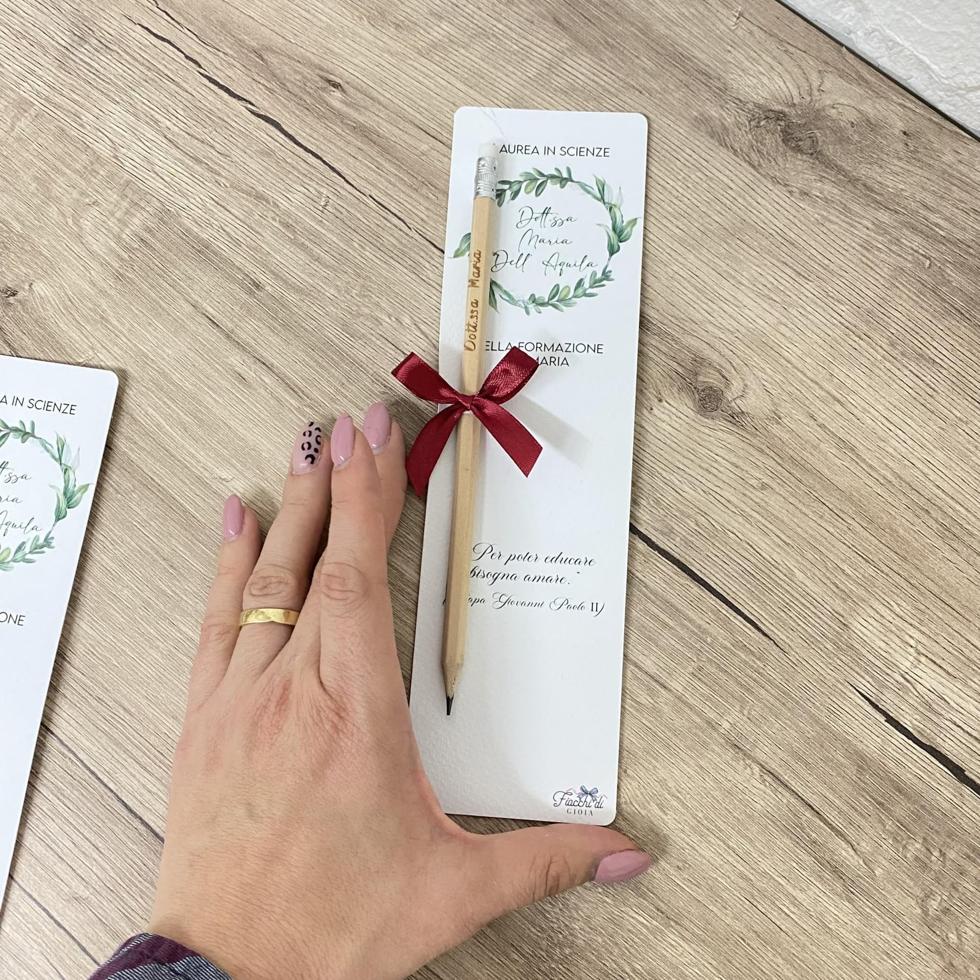 Ogni matita viene incisa con nome, data o una breve frase e accompagnata da un cartoncino con stampa personalizzata, realizzato su misura dopo l’ordine, con grafica coordinata al tema della tua cerimonia.