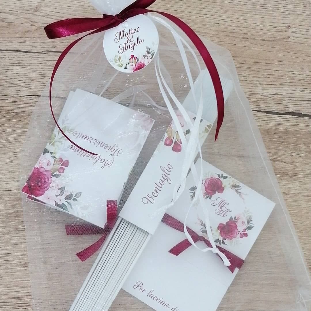 Il kit comprende un saccheto in organza con un tag in plexiglass  personalizzato, con all'interno un libretto messa e un ventaglio, per rendere la cerimonia più fresca e piacevole.