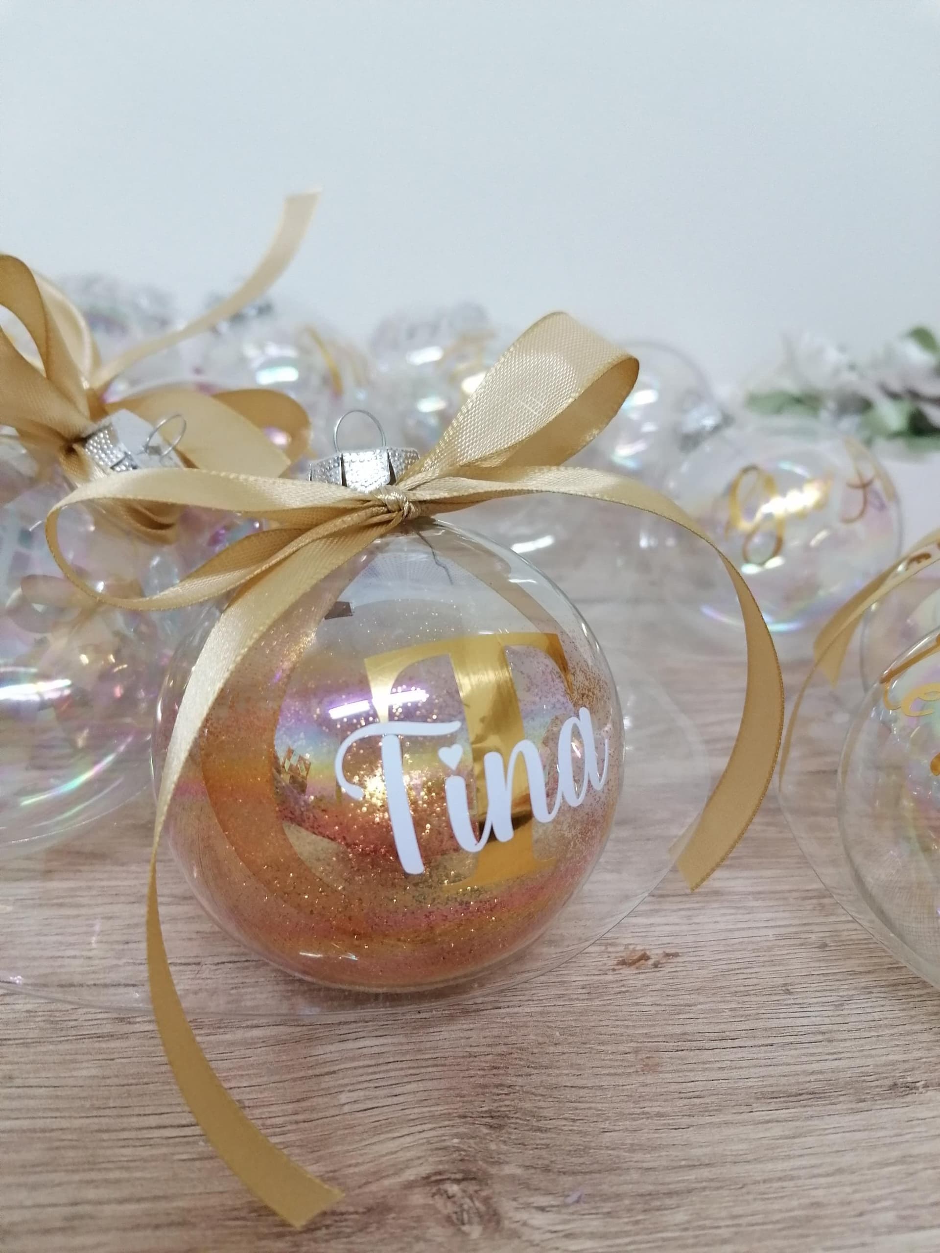 Aggiungi un tocco magico al tuo albero di Natale con questa raffinata pallina in vetro iridescente da 8 cm, personalizzata con il nome stampato nel colore che preferisci.