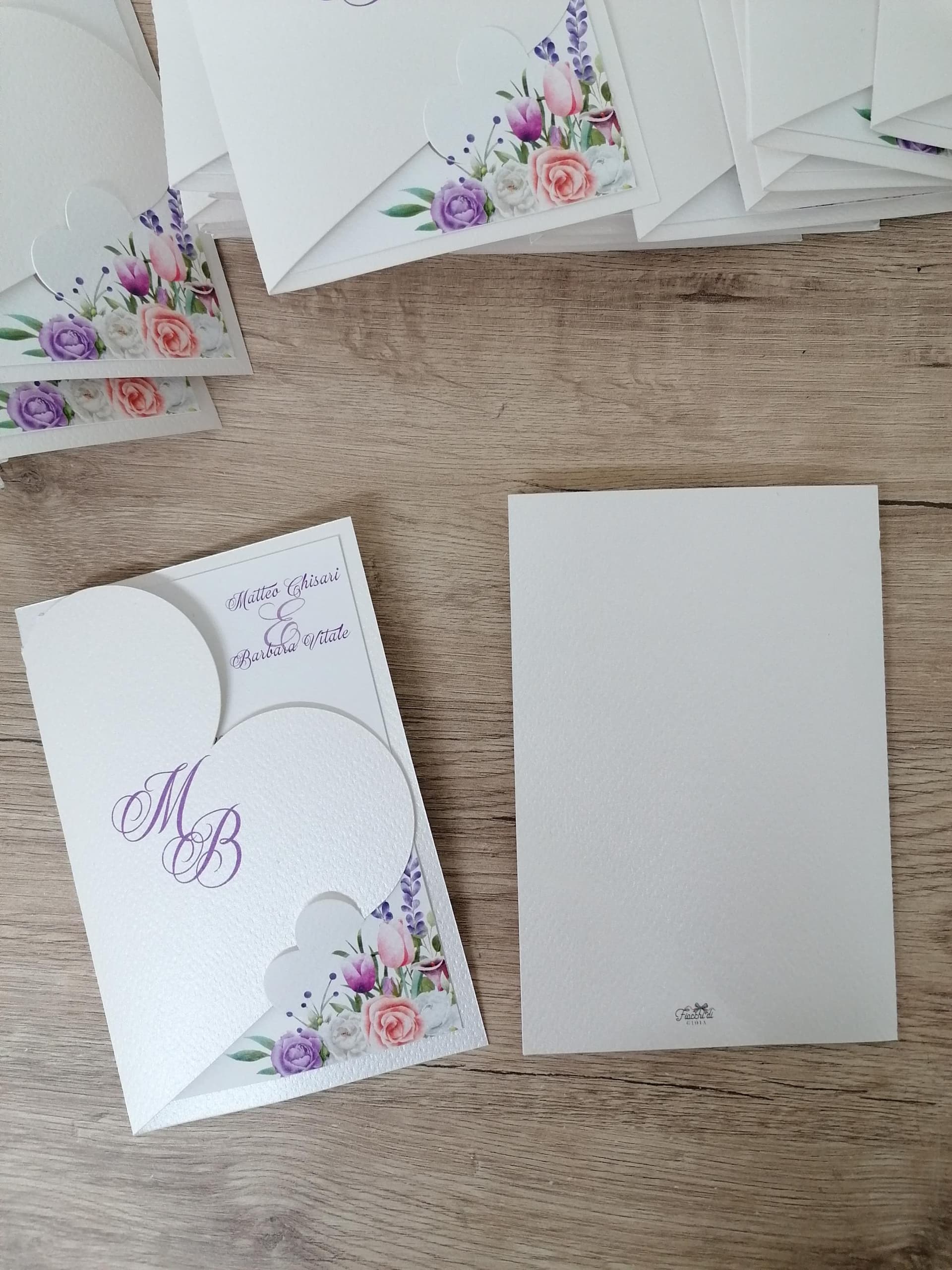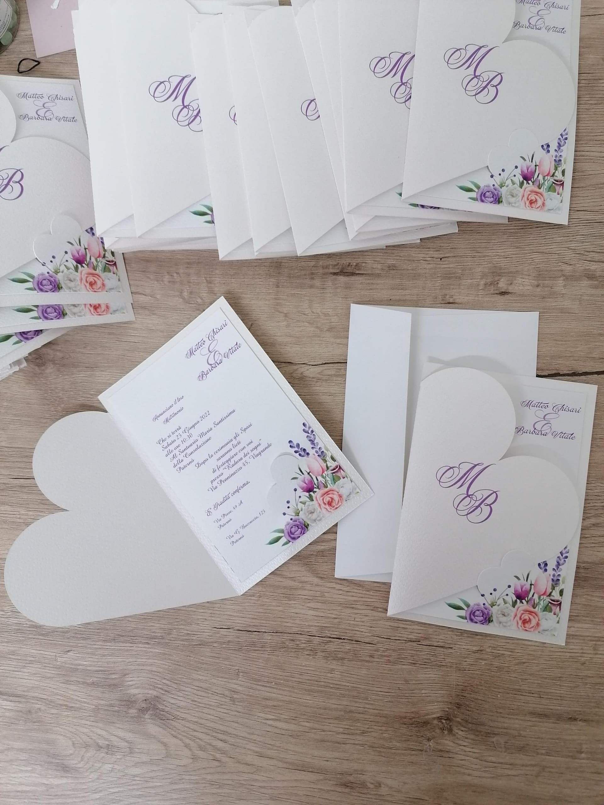 Il colore lilla aggiunge un tocco di dolcezza e raffinatezza, perfetto per creare un'atmosfera romantica. La combinazione di forma a cuore e colore lilla crea un invito che è sia elegante che affettuoso.