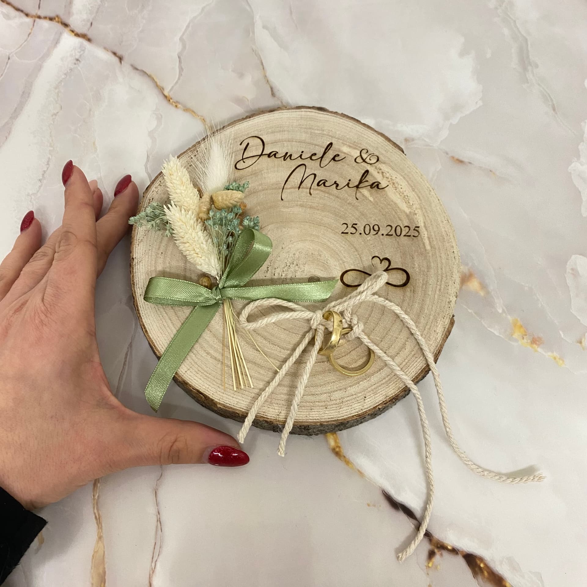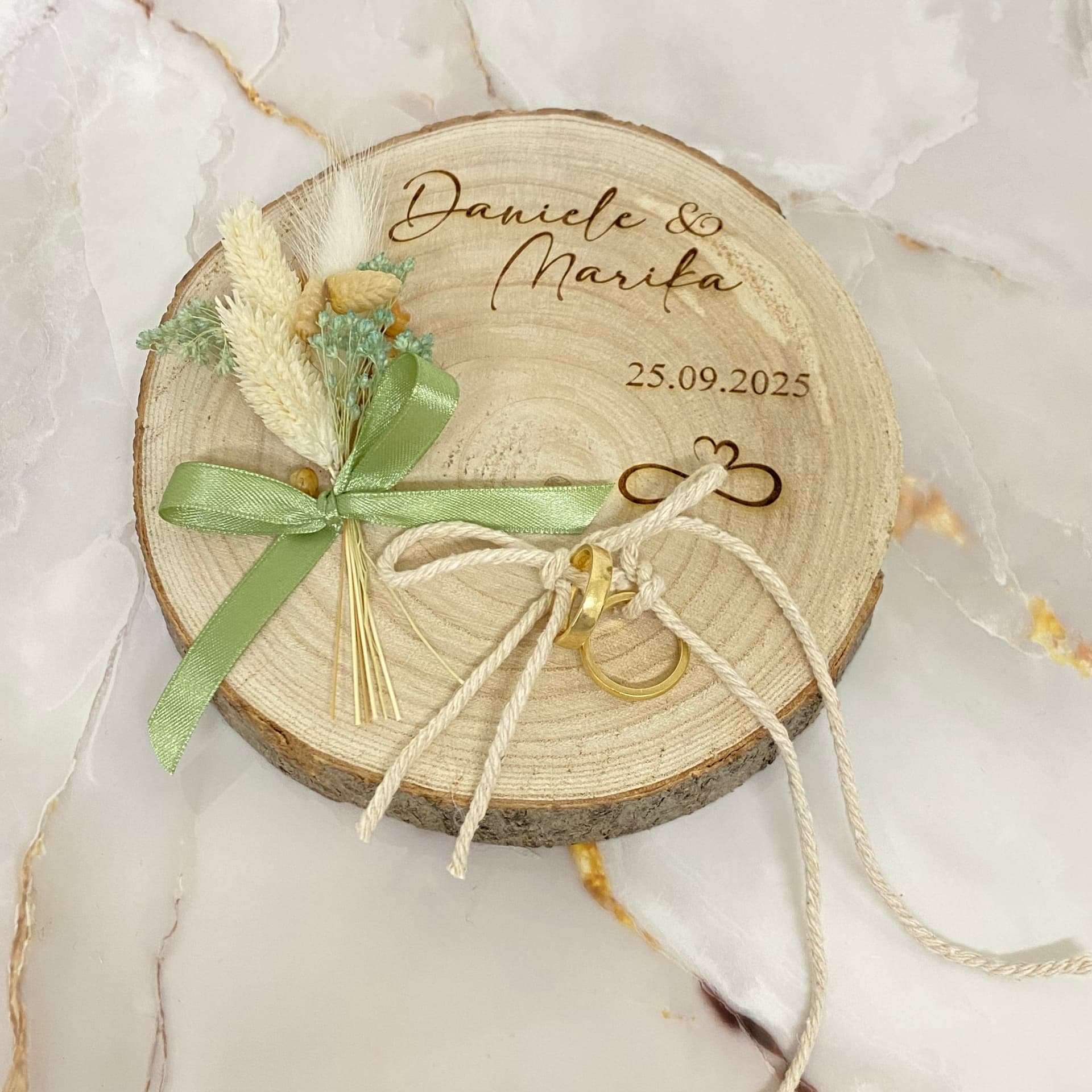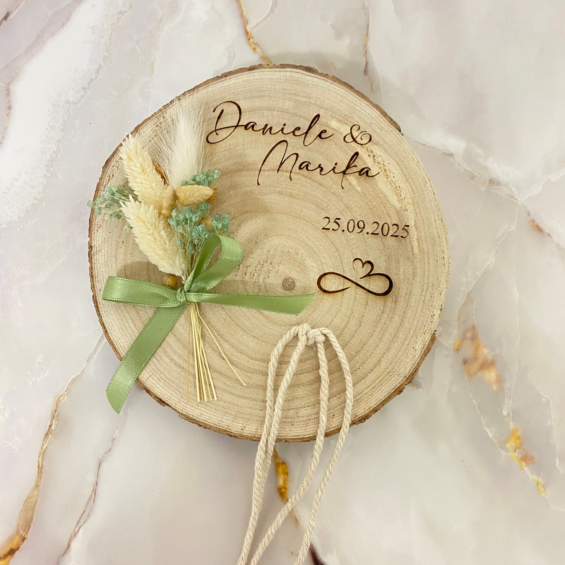 Un portafedi unico e romantico, realizzato in legno naturale a forma di tronco, simbolo di forza e amore eterno. I nomi degli sposi e il simbolo dell'infinito sono delicatamente serigrafati, raccontando la vostra promessa senza fine. Il tocco finale è un grazioso mazzolino di fiori nelle tonalità scelte da voi, che aggiunge un dettaglio poetico e personale al vostro giorno speciale.