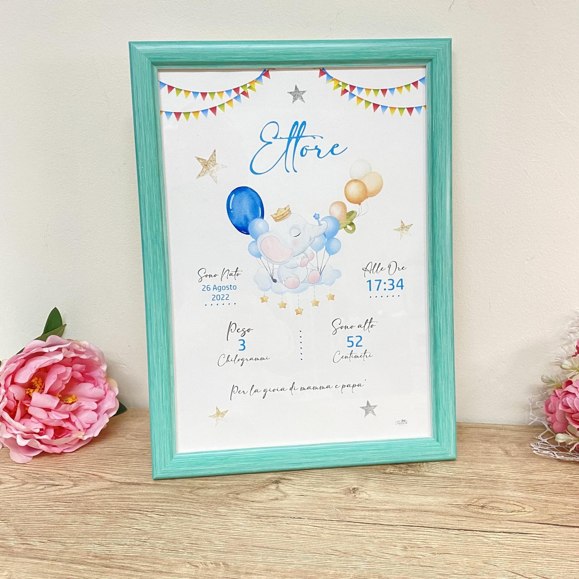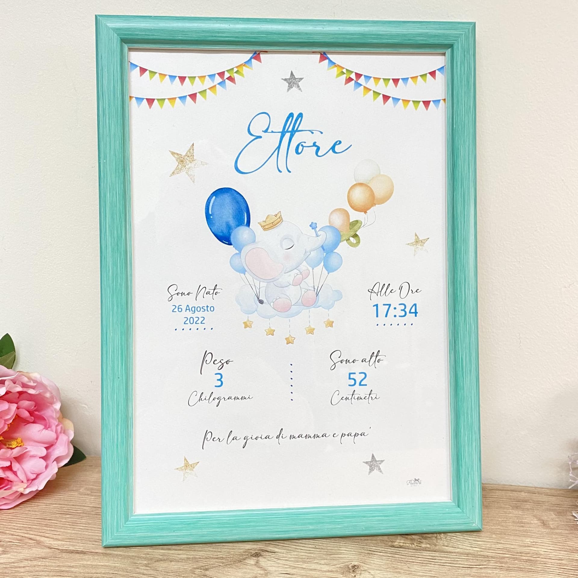 Realizzato con cura e precisione, il quadretto è un'opera d'arte in miniatura che racchiude tutti i momenti indimenticabili di questo giorno straordinario. Dalla data di nascita al peso, dall'orario di arrivo al nome speciale, ogni dettaglio è realizzato con una grafica personalizzata che trasmette l'amore e la gioia di questo evento straordinario.