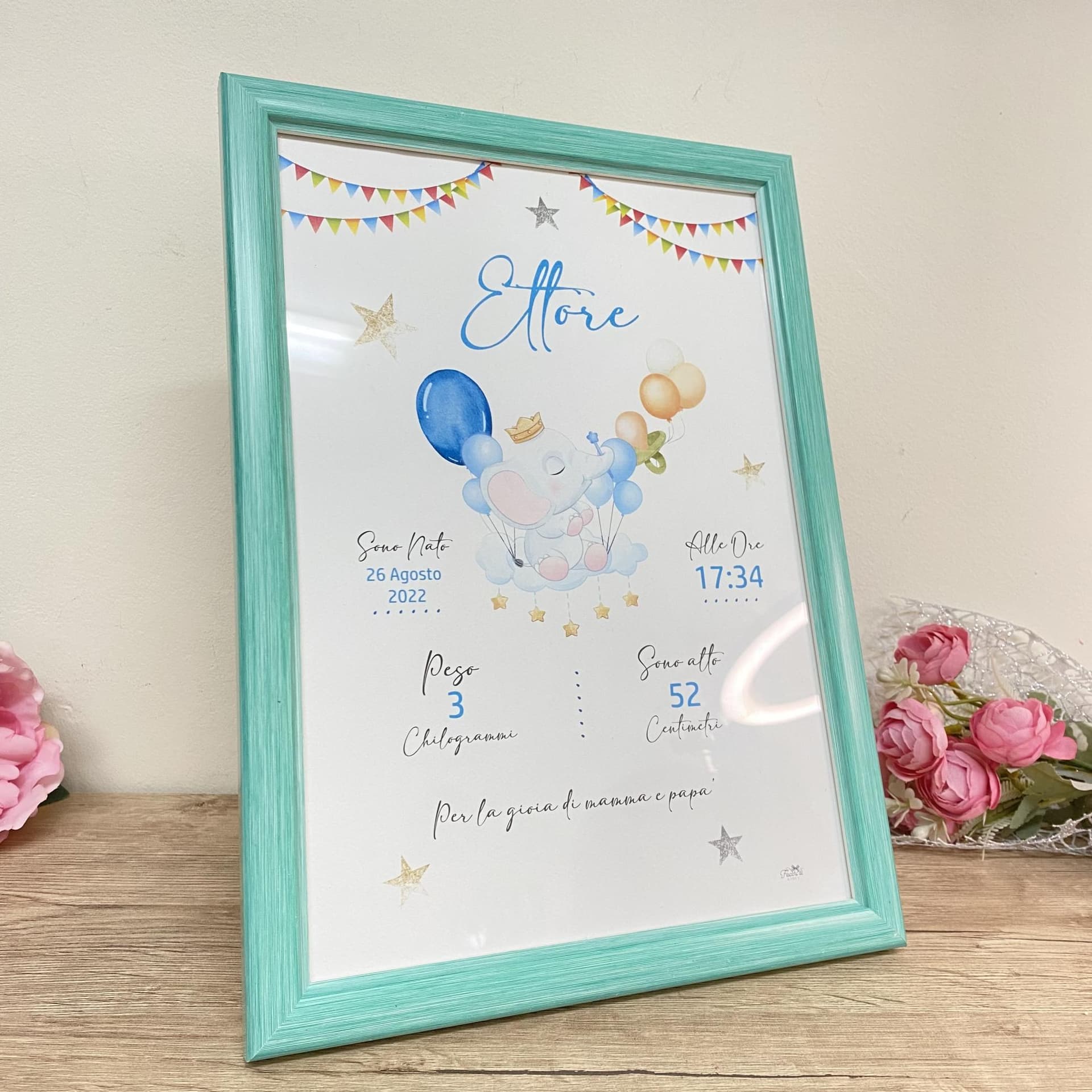 Preserva il ricordo di un giorno indimenticabile con il nostro Quadretto Nascita con Grafica Personalizzata e fai in modo che ogni dettaglio speciale sia eternamente inciso nel cuore e nella casa tua.
