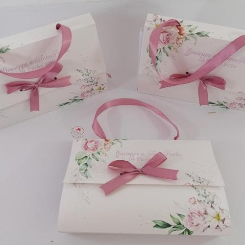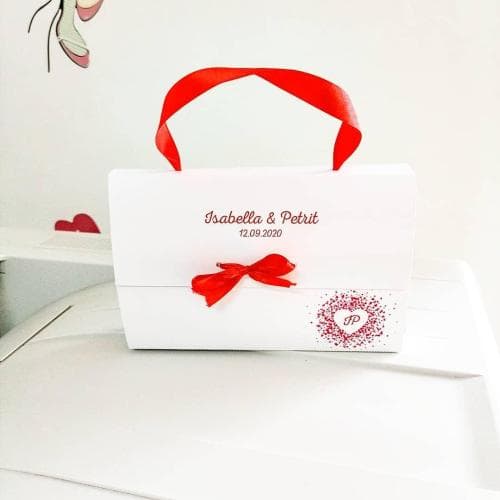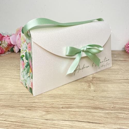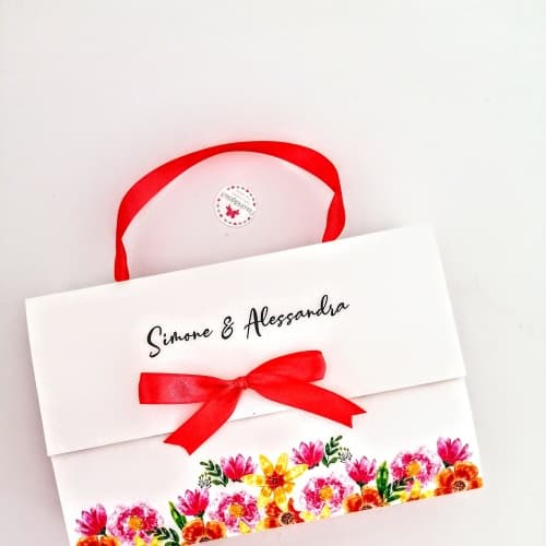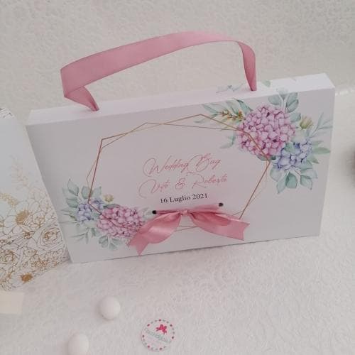 Volete ringraziare i vostri ospiti per aver condiviso con voi il giorno più bello della vostra vita? La nostra wedding bag per ospiti è il modo perfetto per farlo! Questa borsa elegante e raffinata è pensata per contenere tutti gli oggetti essenziali che i vostri ospiti potrebbero aver bisogno durante il matrimonio, dal ventaglio al fazzoletto, dalla mascherina al riso o le caramelle. Realizzata con cartoncino di alta qualità e disponibile in diversi colori e modelli, la borsa è completamente personalizzabile con il nome degli sposi o la data del matrimonio, per renderla un souvenir indimenticabile del vostro grande giorno. La wedding bag è anche un'idea originale per creare un'atmosfera accogliente e premurosa, che farà sentire i vostri ospiti speciali e coccolati. Scegliete le nostre wedding Bags per sorprendere e ringraziare chi vi è stato vicino nel giorno più importante della vostra vita!
