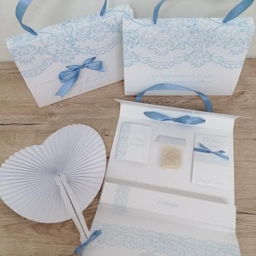 Se vuoi rendere il tuo matrimonio indimenticabile, non puoi rinunciare al nostro kit wedding bag. Si tratta di una borsina in cartoncino, che contiene tutto il necessario per accompagnare i tuoi invitati durante la cerimonia. All’interno troverai un libretto messa, un ventaglio, un fazzolettino per le lacrime di gioia e una scatolina porta riso. Ogni elemento è personalizzabile con i colori e i motivi che più ti piacciono. Il kit wedding bag è un dettaglio di classe che farà sentire i tuoi ospiti speciali e coccolati.