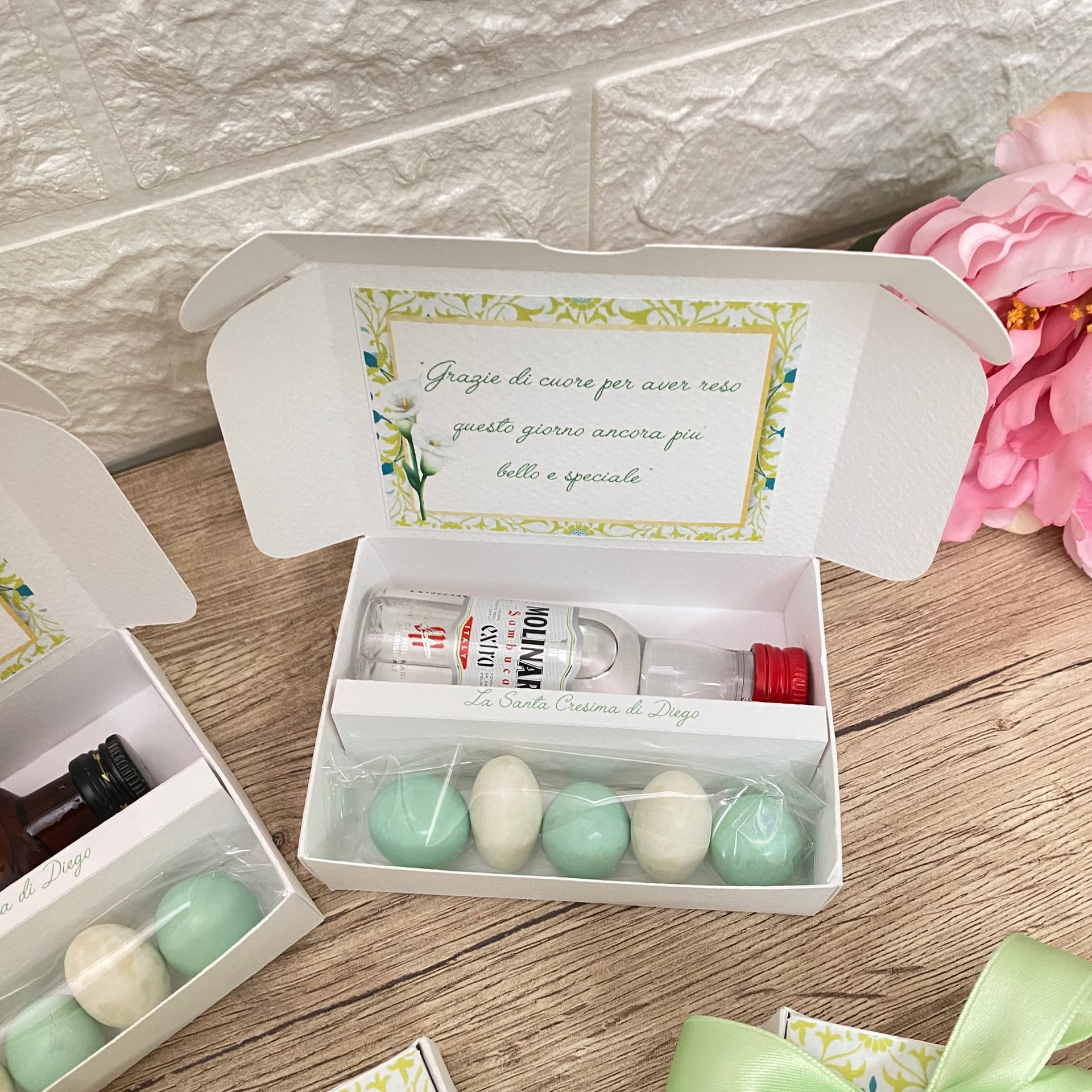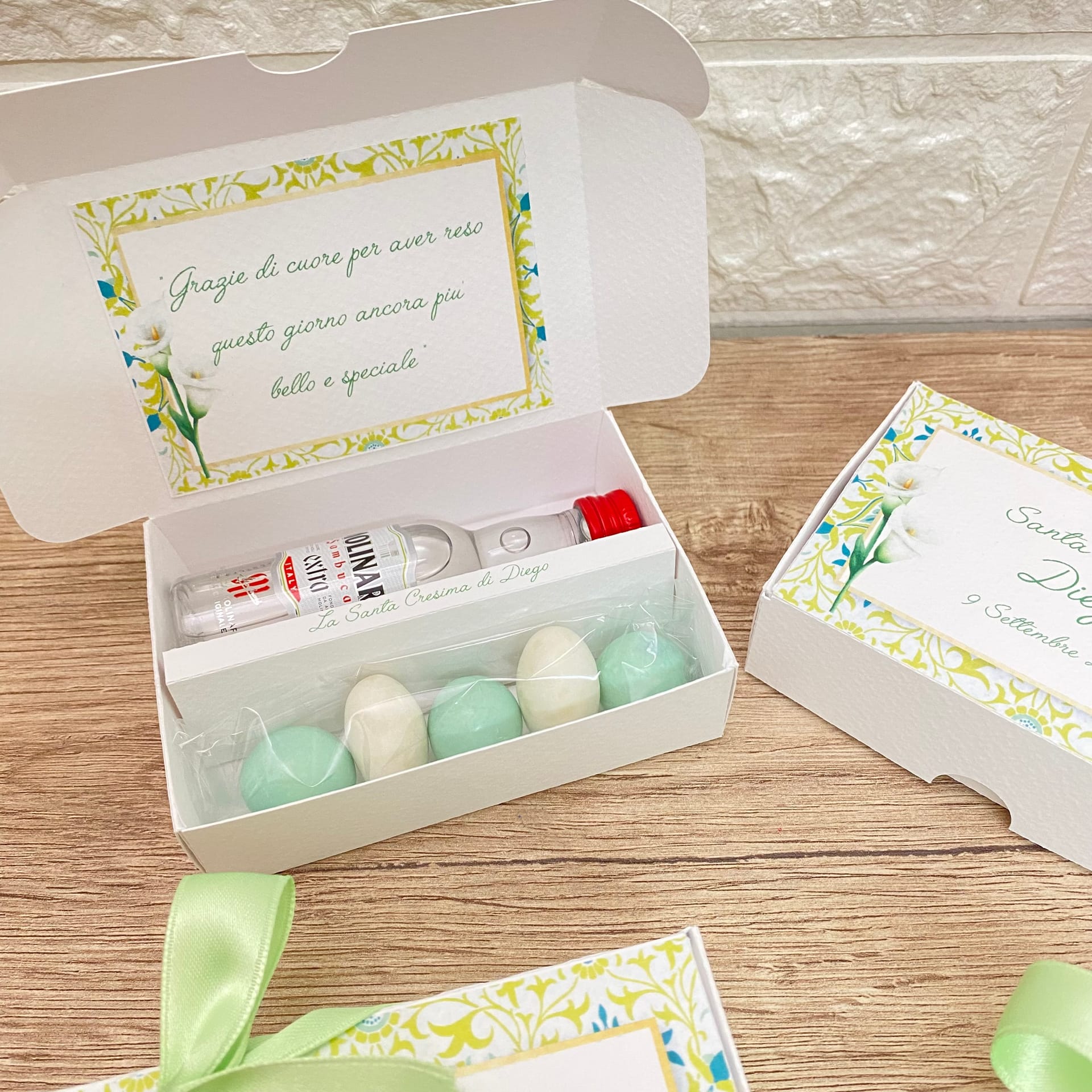 All'interno di ogni confezione troverai dei gustosi confetti, per aggiungere un tocco di dolcezza e festa alla tua esperienza. E se desideri un'esperienza ancora più speciale, puoi optare per l'aggiunta di un sigaro e un cioccolatino personalizzato, per un regalo completo e indulgente.