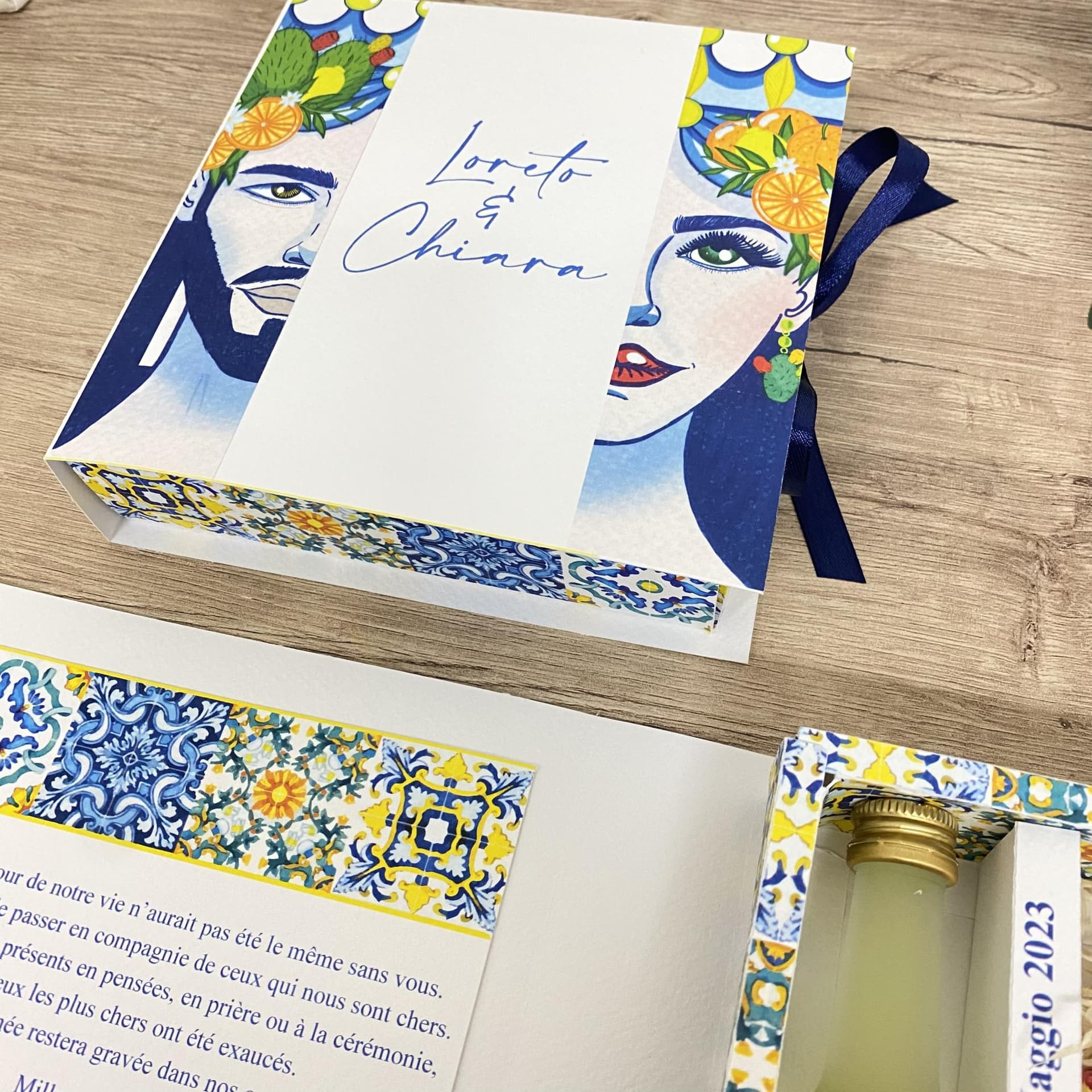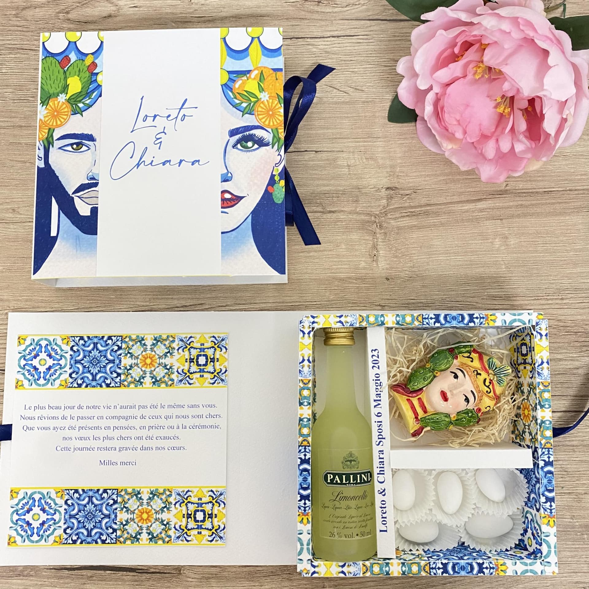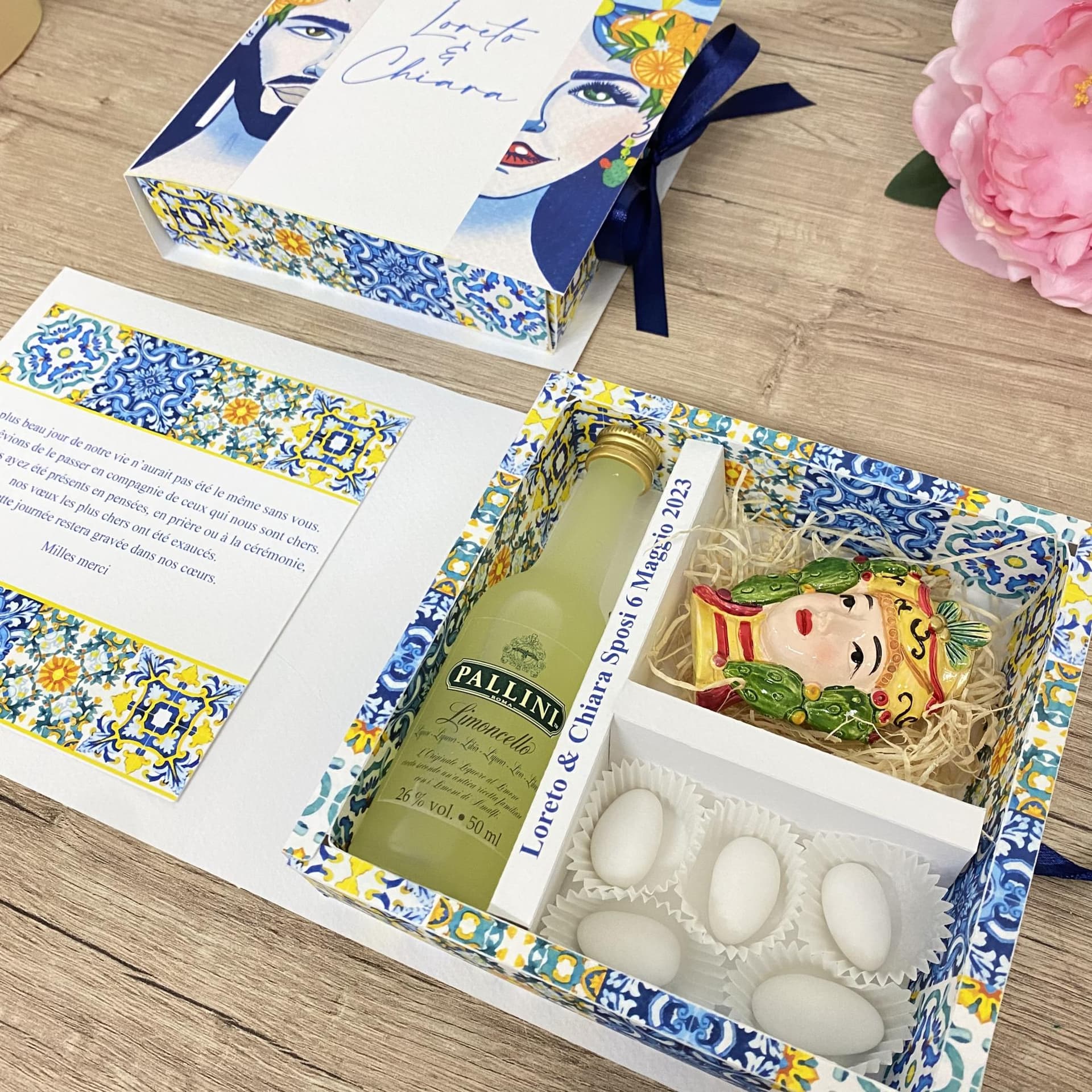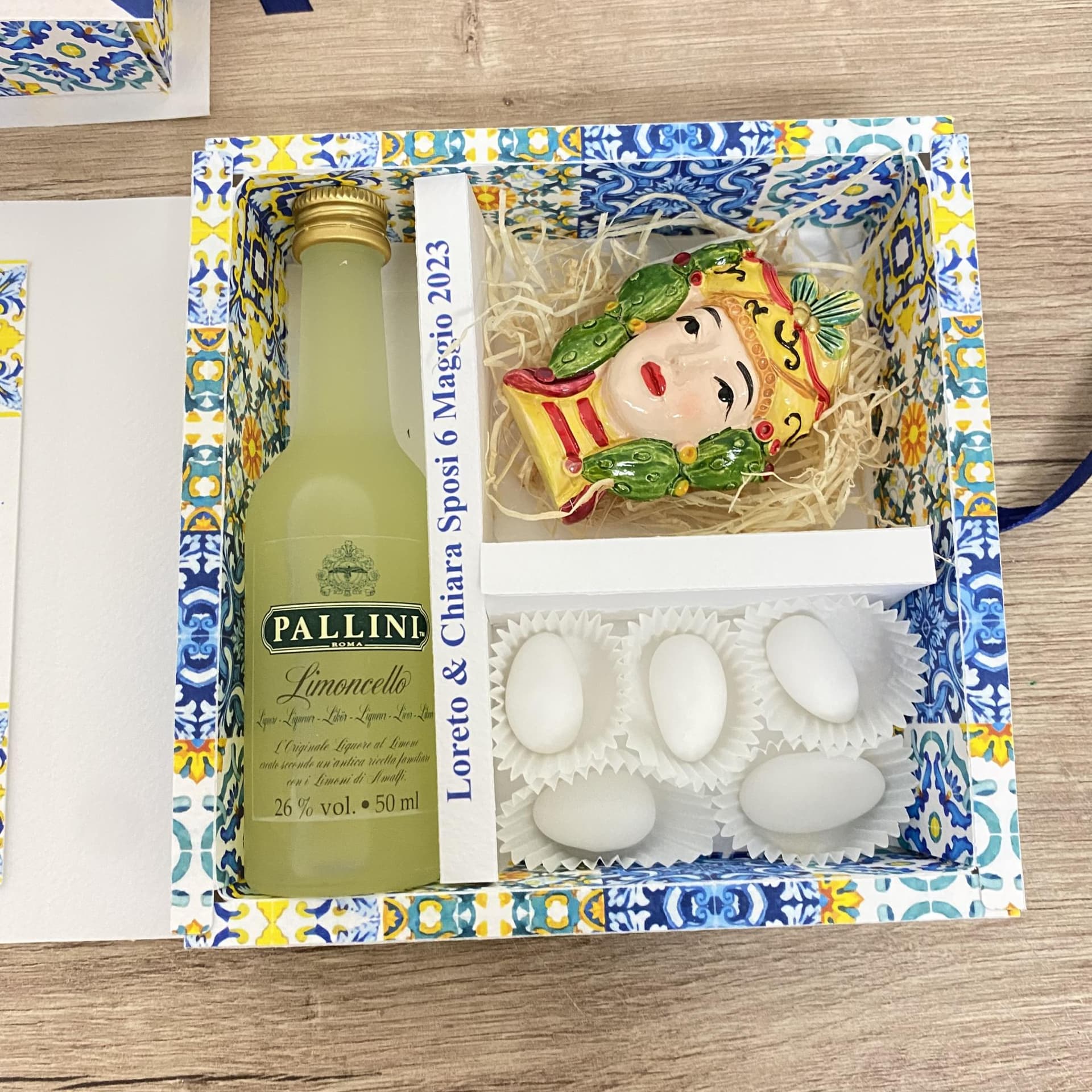 Vuoi sorprendere i tuoi ospiti con una bomboniera originale e gustosa? Scegli la scatola degustazione completa di confetti, calamita testa di moro e bottiglia di limoncello in miniatura! Un regalo che unisce la tradizione siciliana dei confetti, decorati con le tipiche teste di moro in ceramica, alla freschezza del limoncello, il liquore più amato del sud Italia. La scatola contiene 5 gustosi confetti, una calamita e una bottiglia di limoncello da 50 ml, il tutto confezionato con eleganza e cura. Una bomboniera che saprà stupire e deliziare i tuoi invitati, lasciando un ricordo indimenticabile del tuo evento speciale.