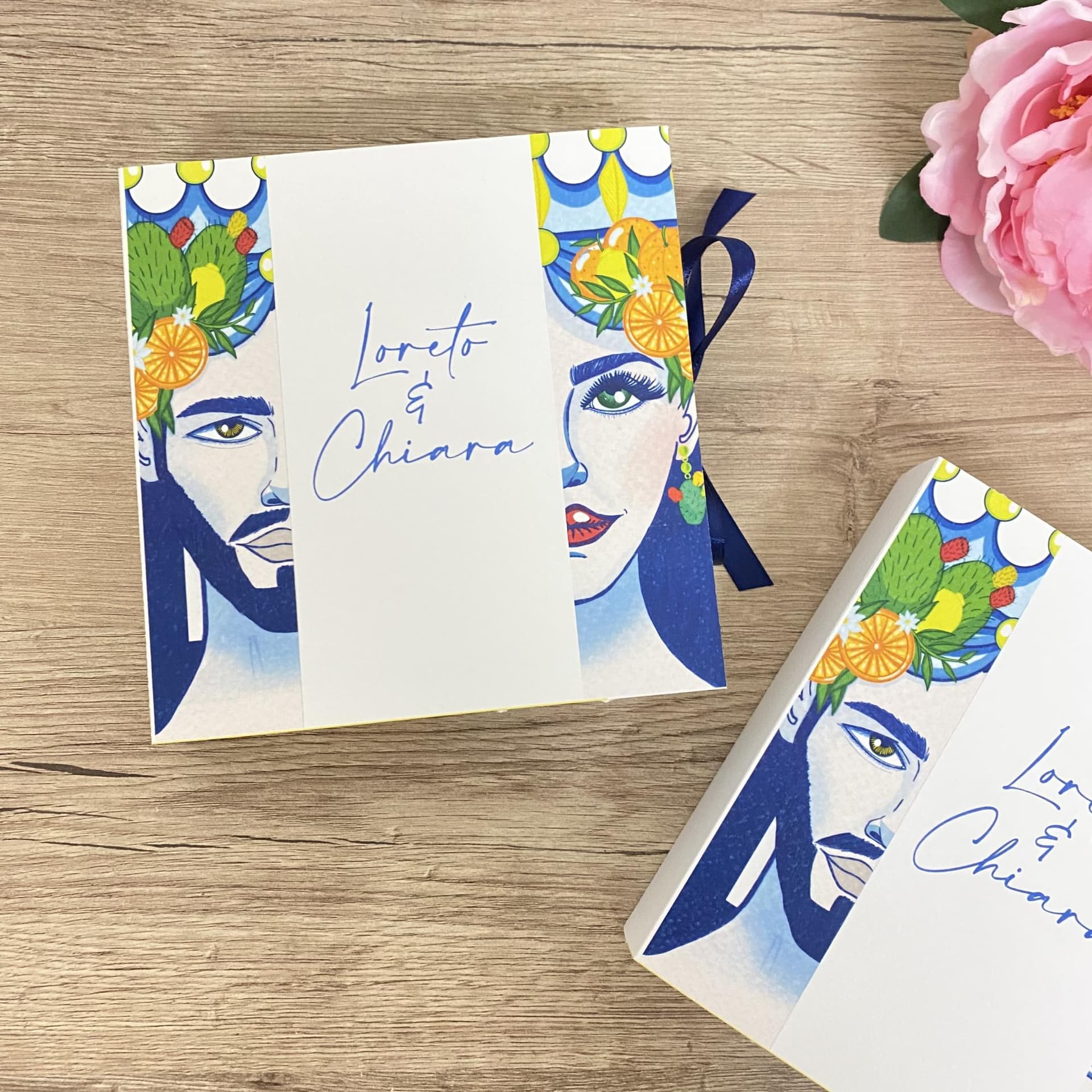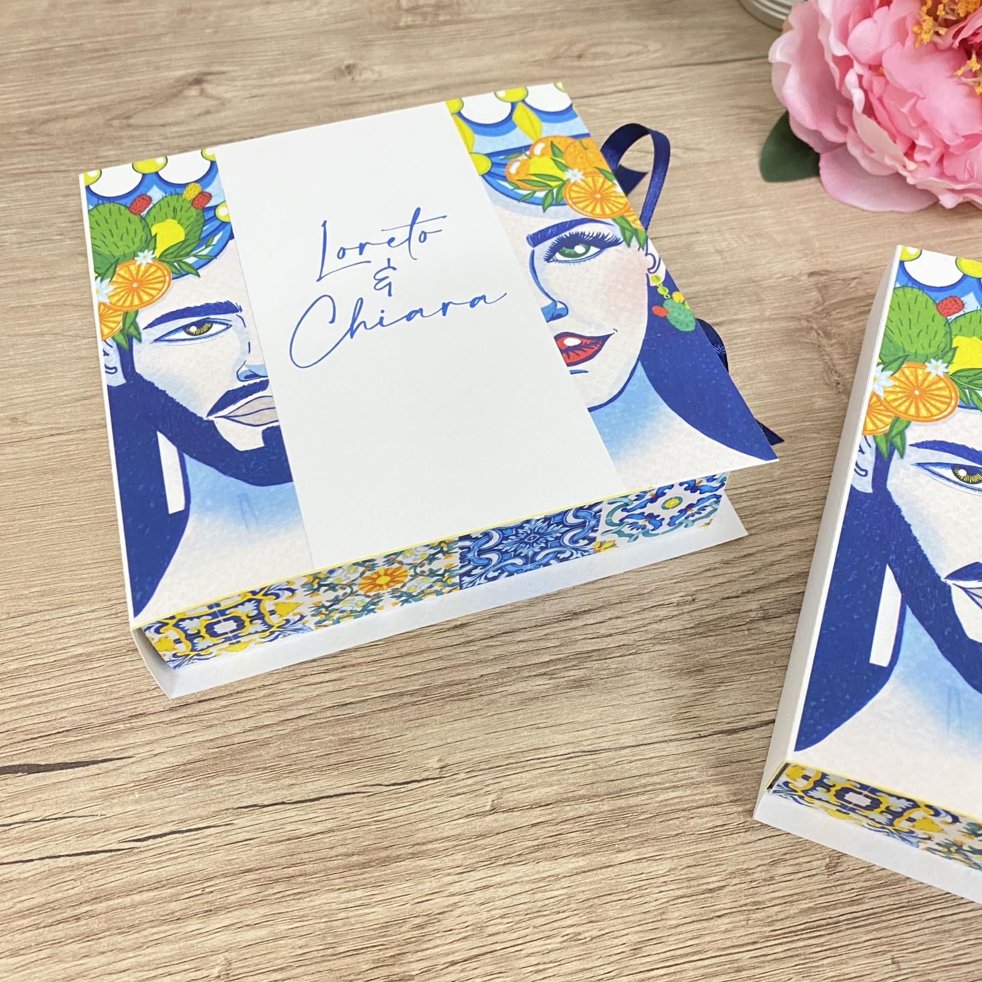 Scatola a libro quadrata in cartoncino stampato con grafica personalizzata con teste di Moro,