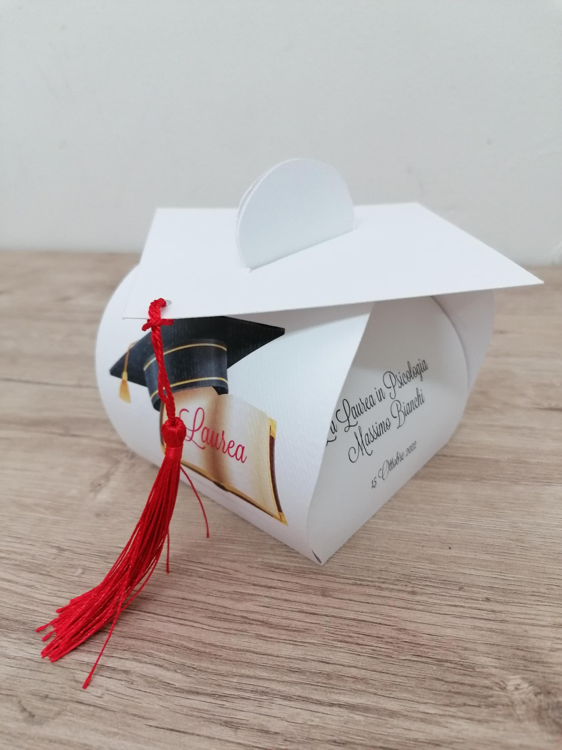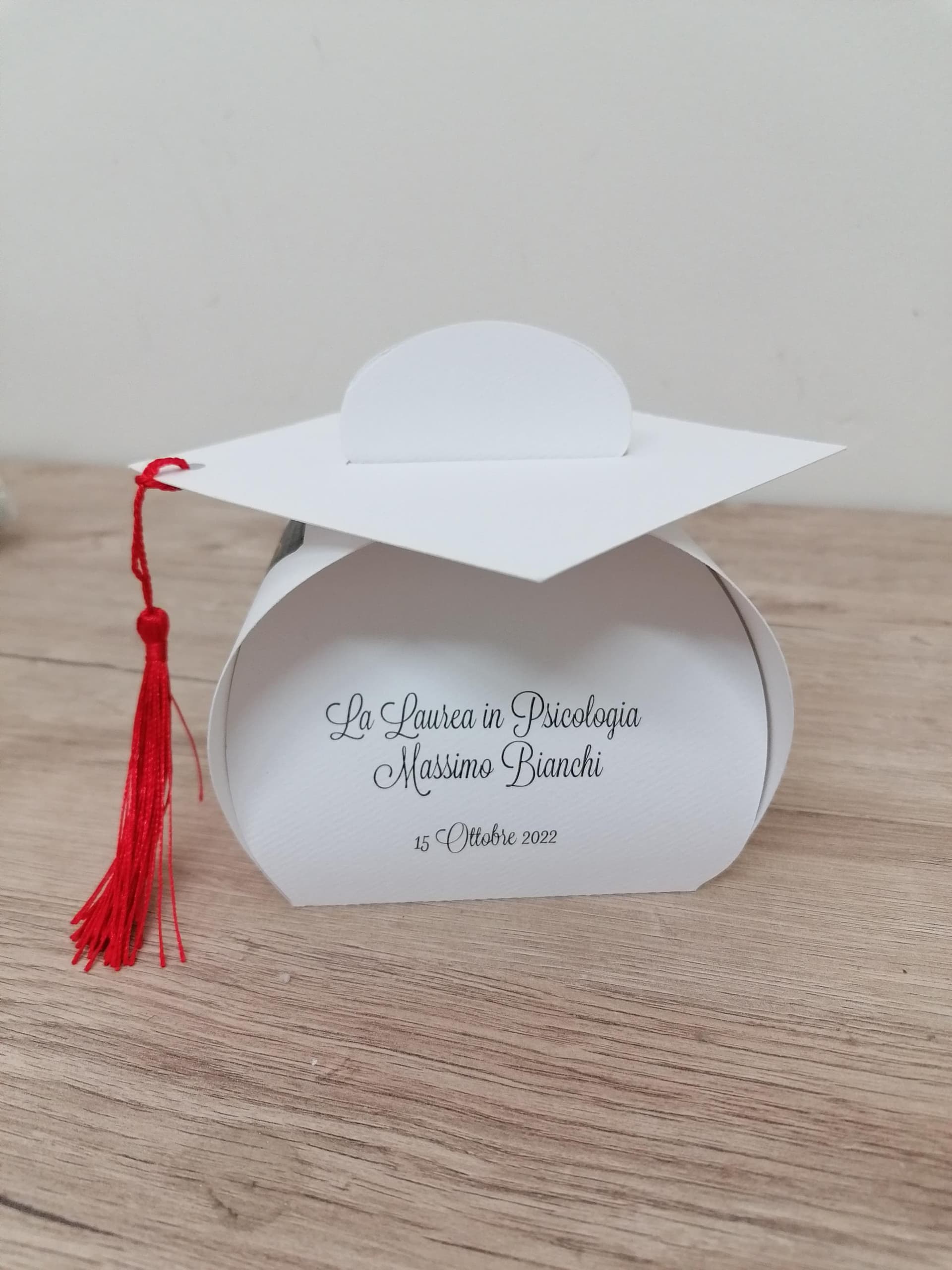 Il tipico cappello che i laureati indossano durante la cerimonia. La scatola è realizzata in cartoncino bianco con stampa e nappa rossa o dorate e ha una dimensione di cm circa 10x10 cm. Puoi personalizzare la scatola con il nome del laureato o della laureata e la data della laurea. La scatola è ideale per contenere confetti, caramelle o altri piccoli oggetti da regalare agli invitati come ricordo della festa.