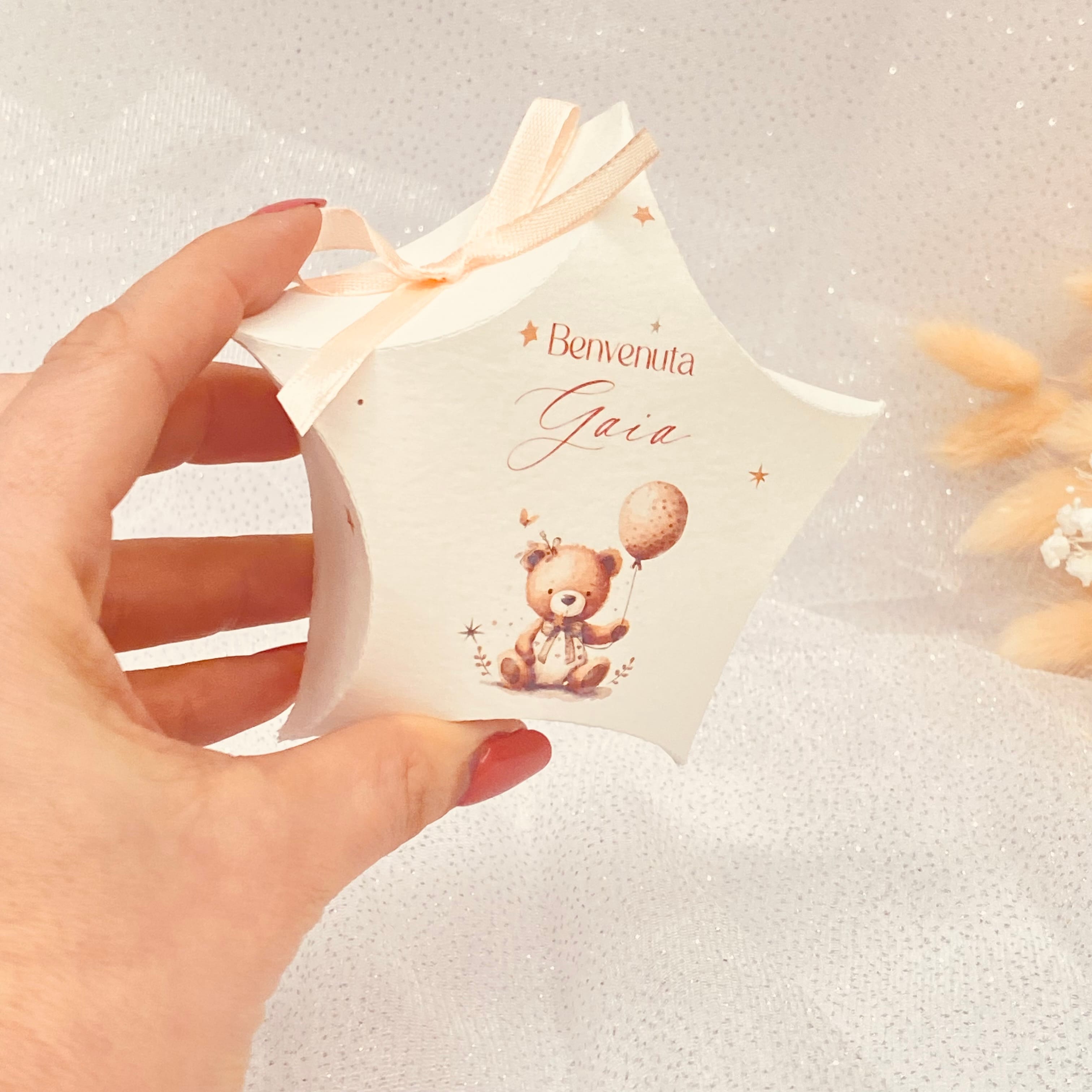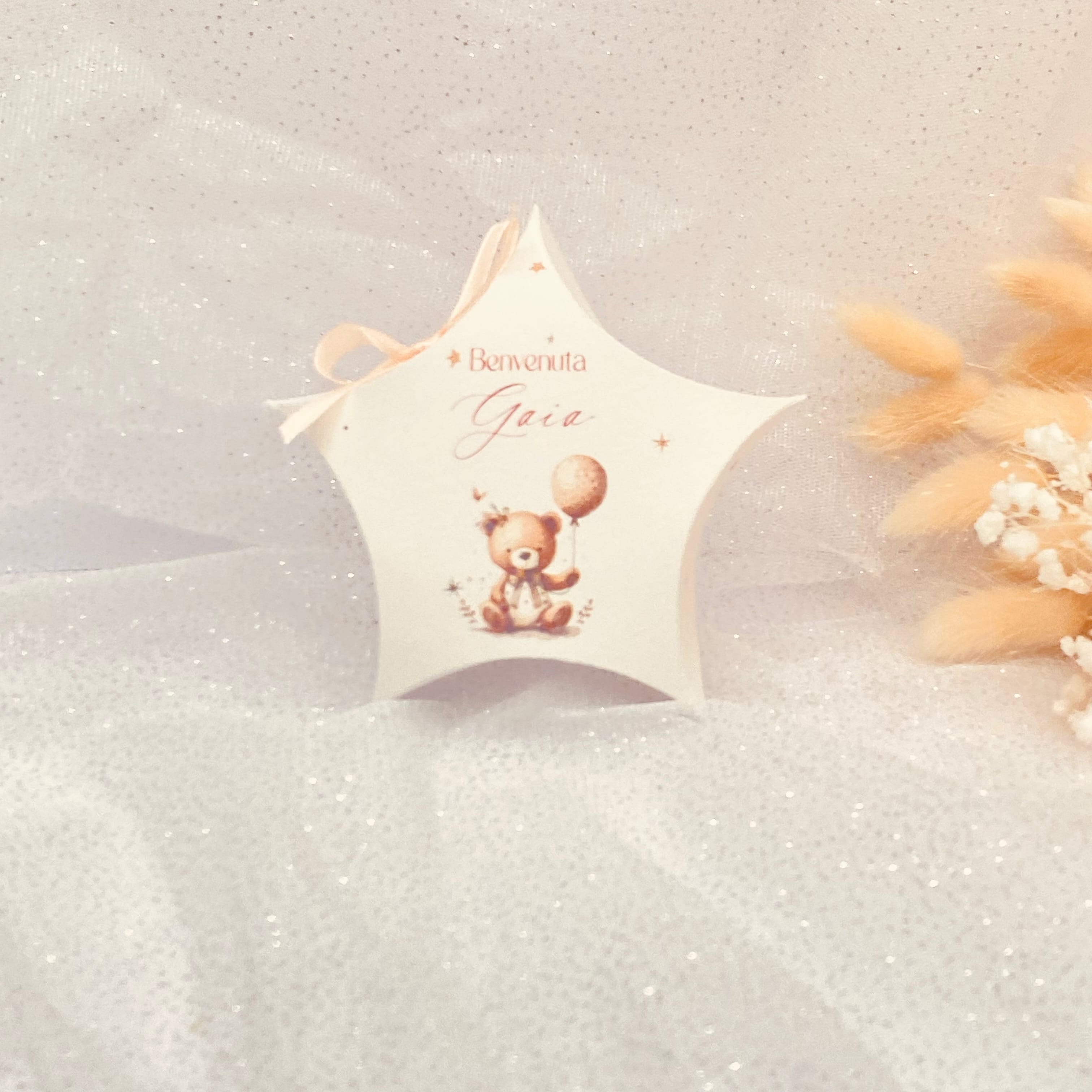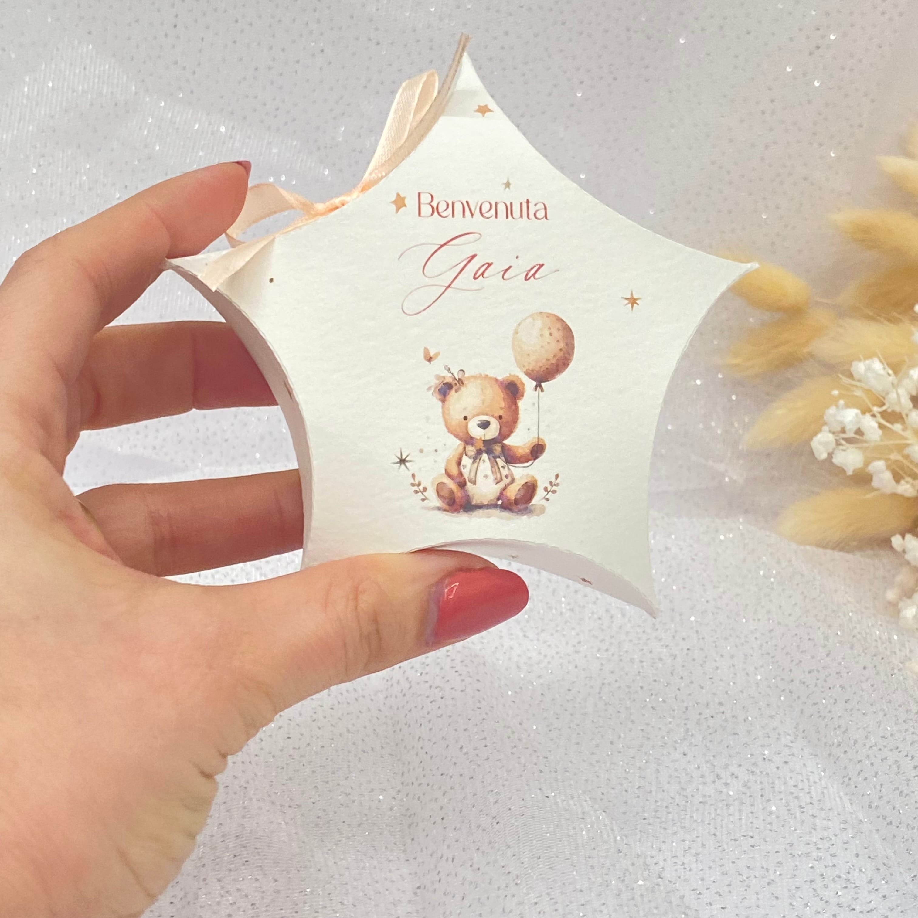 Scatolina a Stella con grafica orsetto della collezione, personalizzabile con nome e data.
