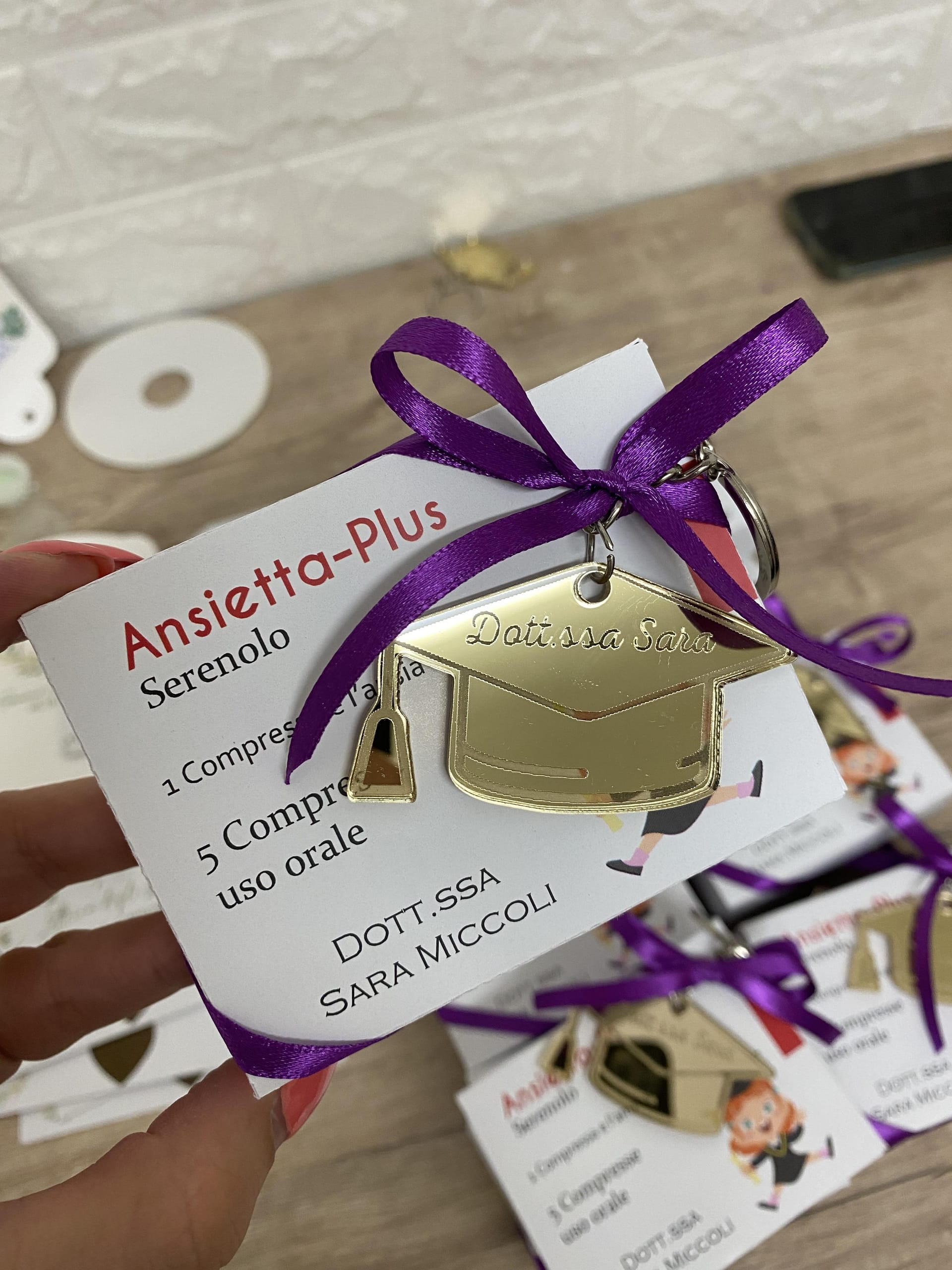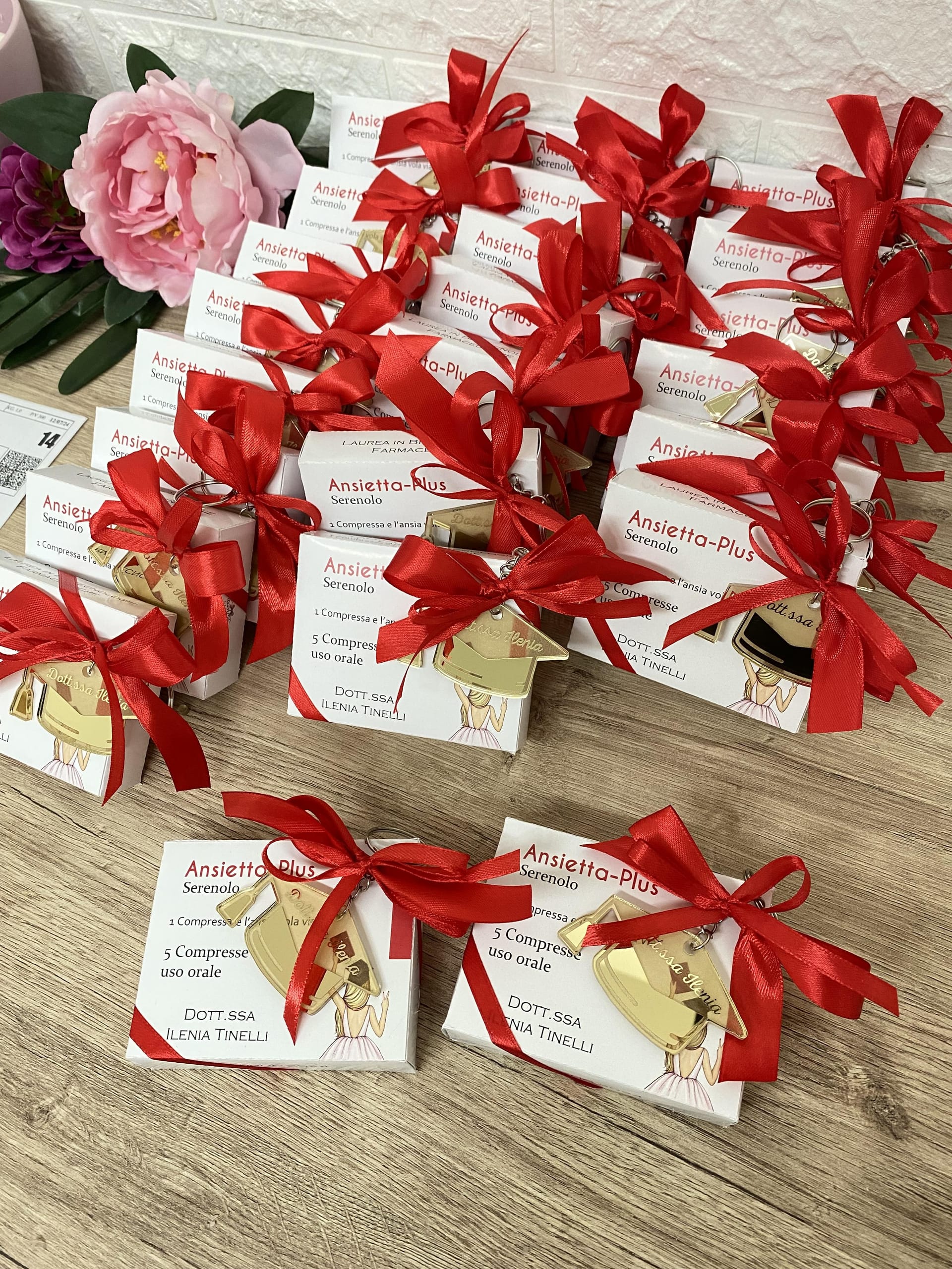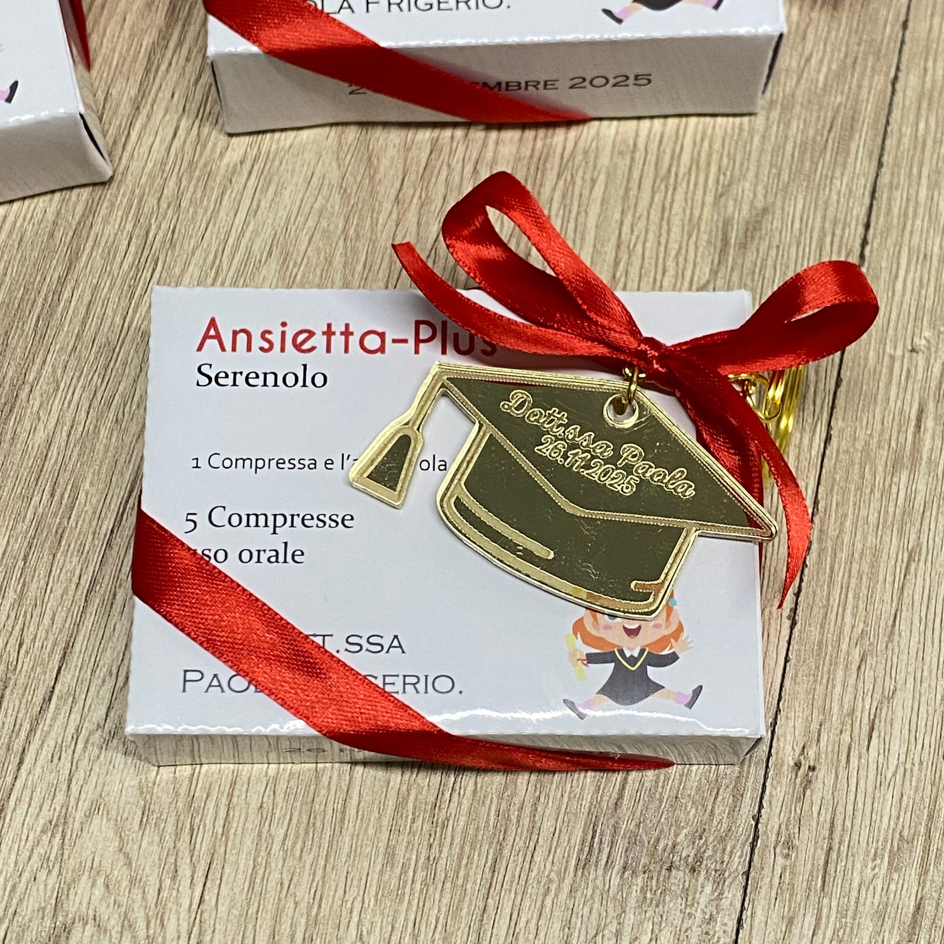Celebra il traguardo più importante della tua carriera accademica con un ricordo unico e originale! Questa elegante bomboniera di laurea si distingue per la sua scatola personalizzata a forma di farmaco, un omaggio perfetto per chi ha completato gli studi in farmacia o medicina. All’interno, un raffinato portachiavi che sarà il simbolo della tua nuova avventura professionale.