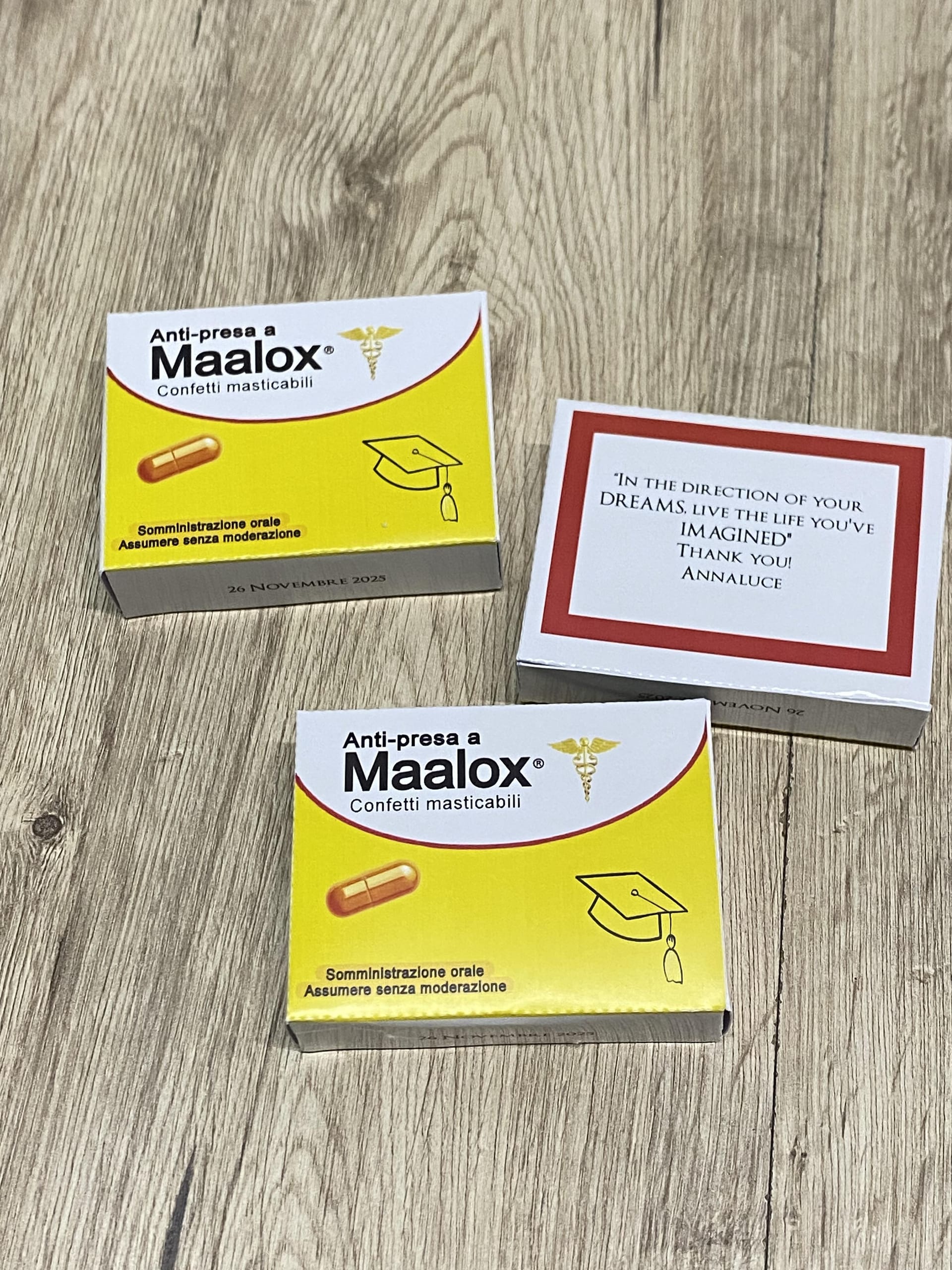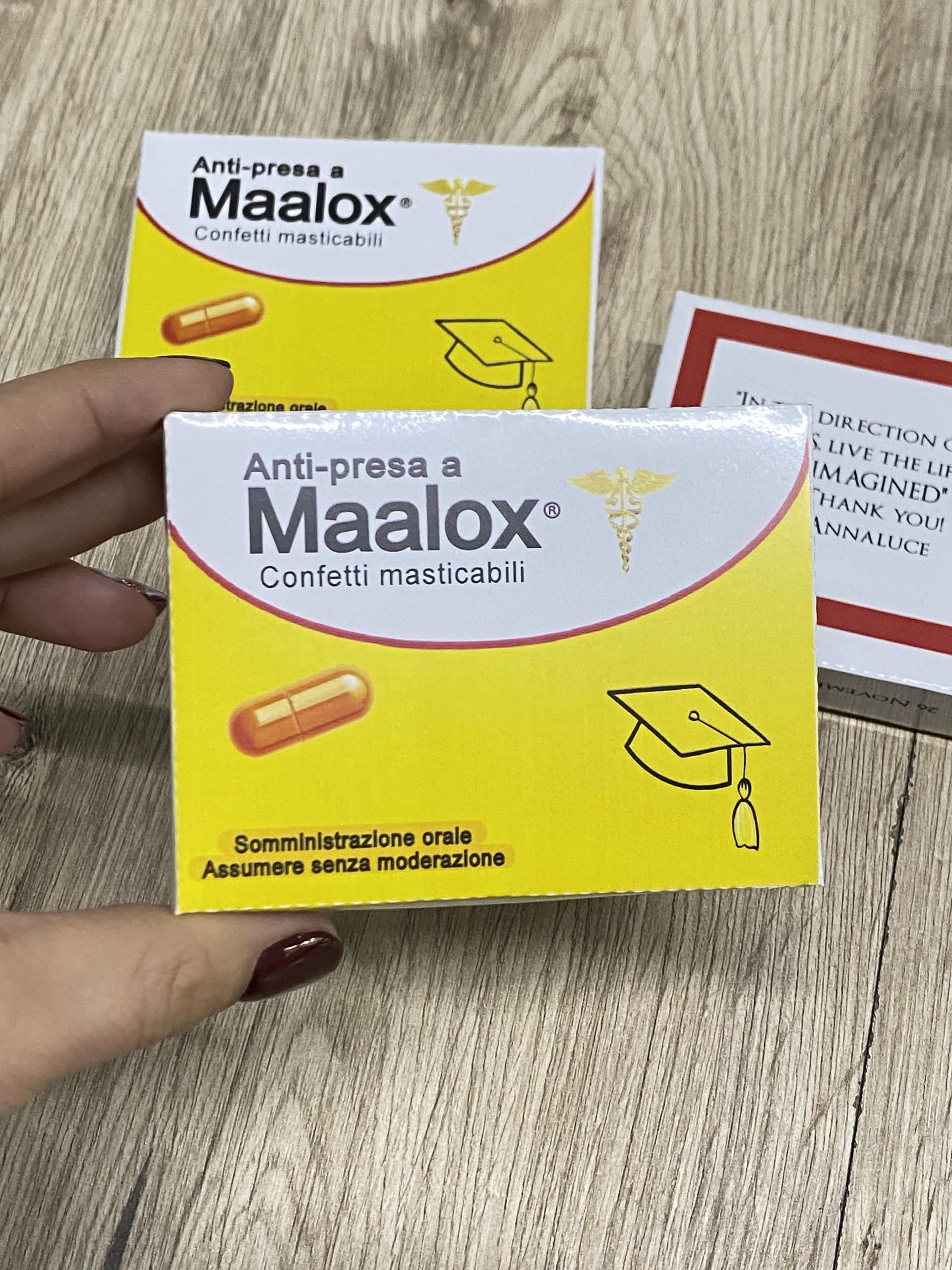 - Scatolina stile " anti presa a Maalox ” personalizzata su cartoncino lucido