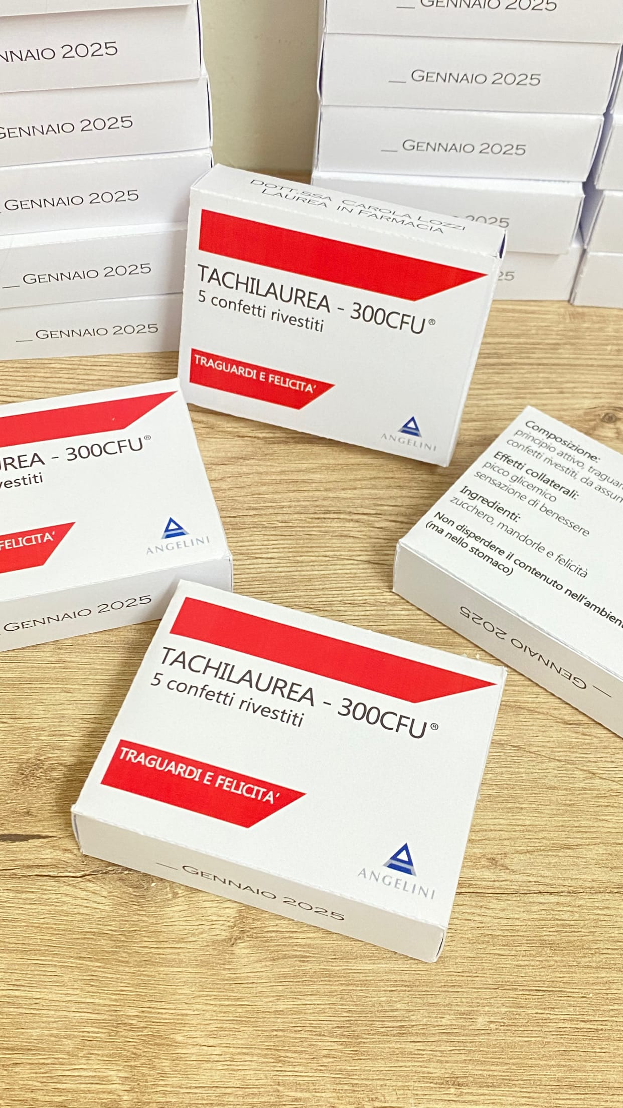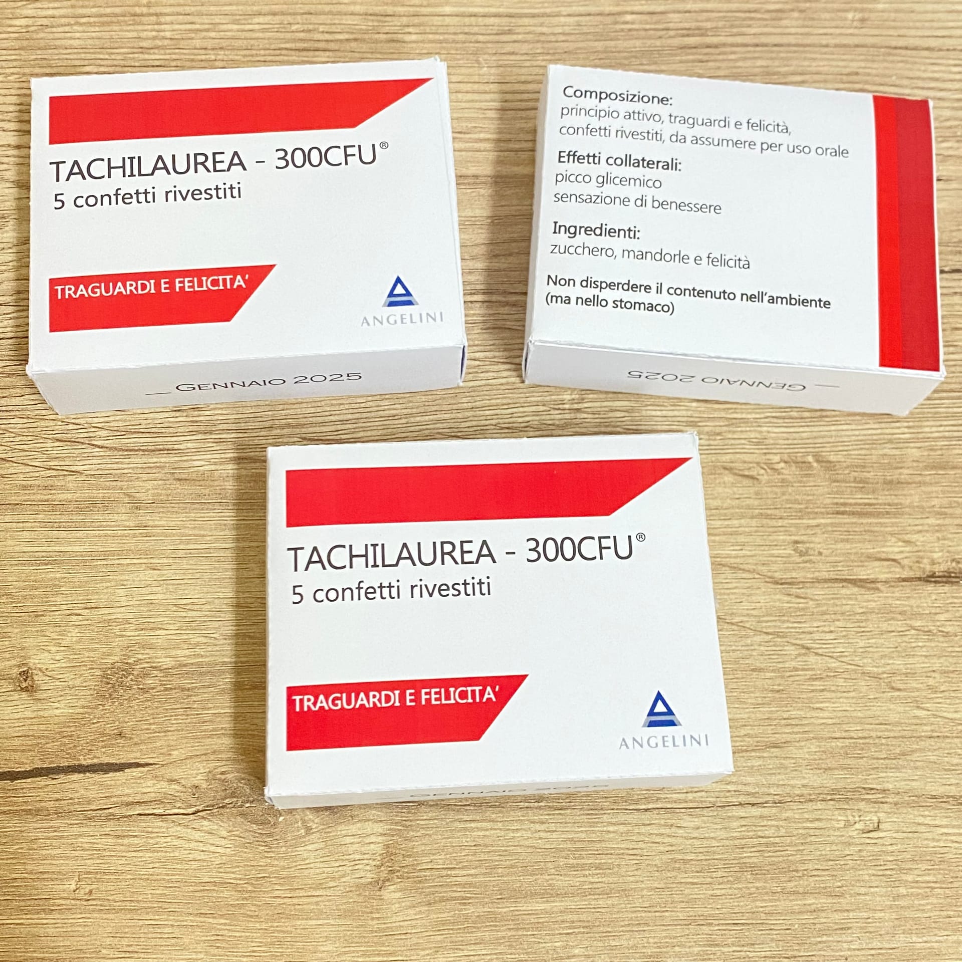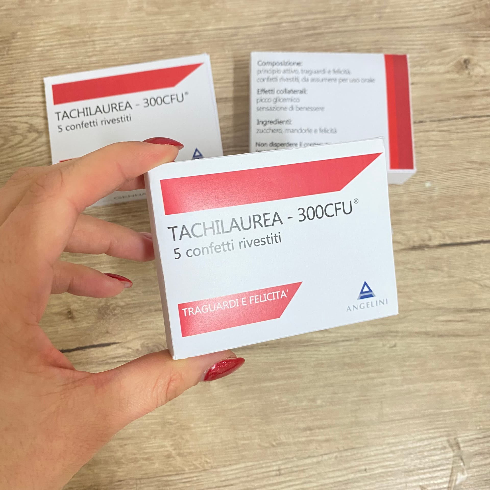 Scatolina stile farmaco personalizzata con confetti Tachilaurea