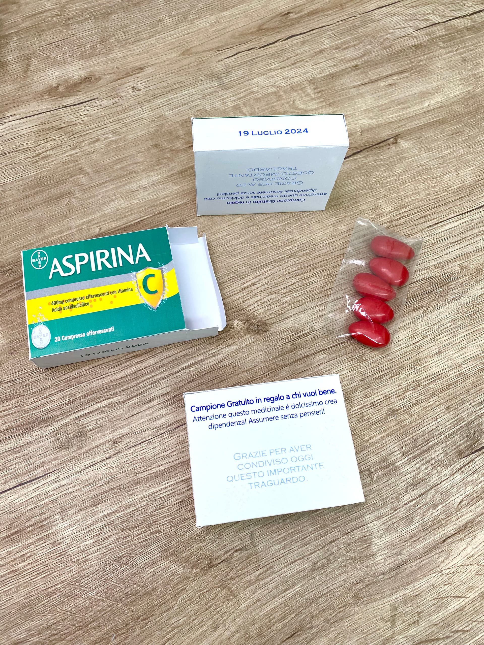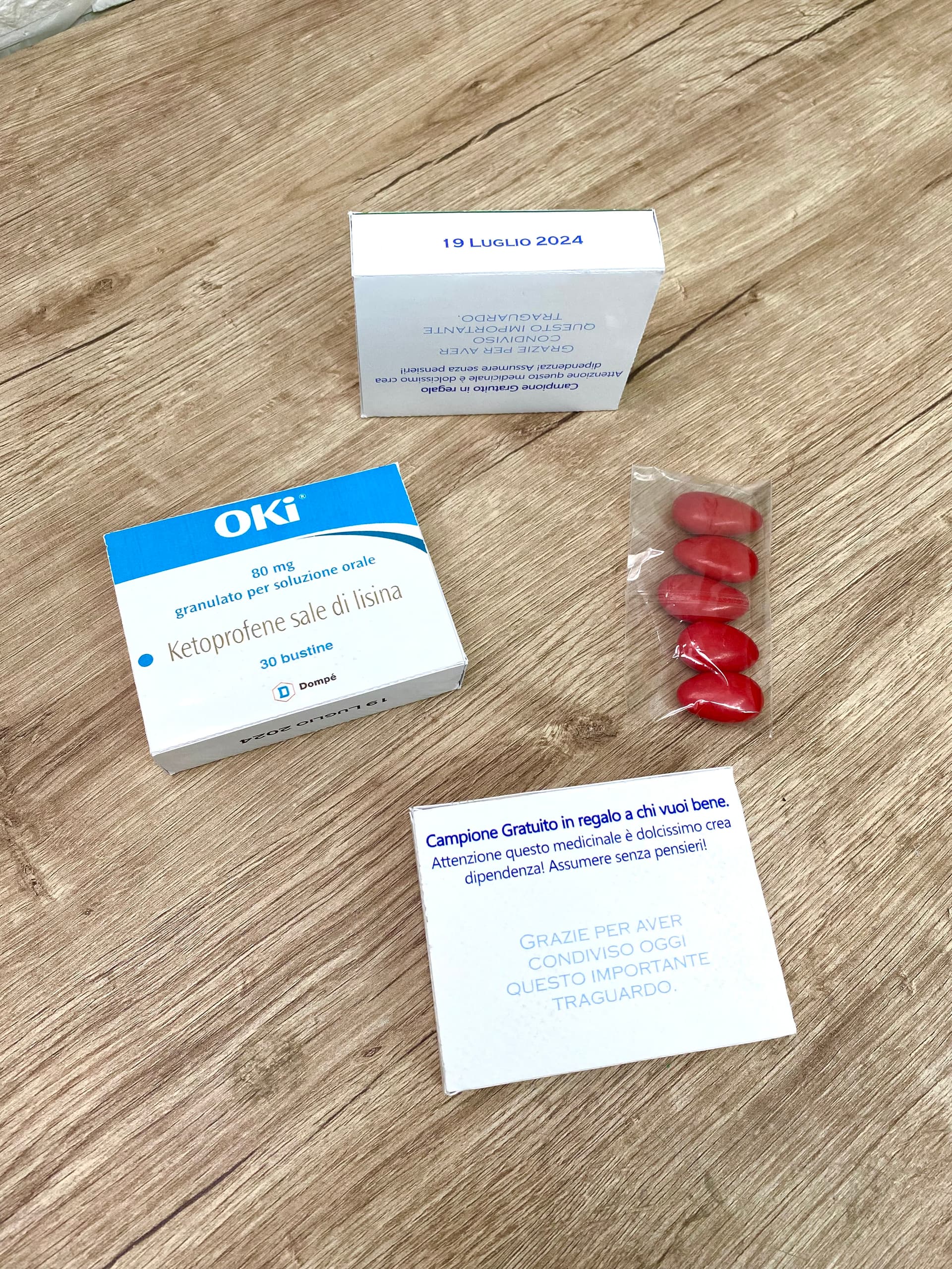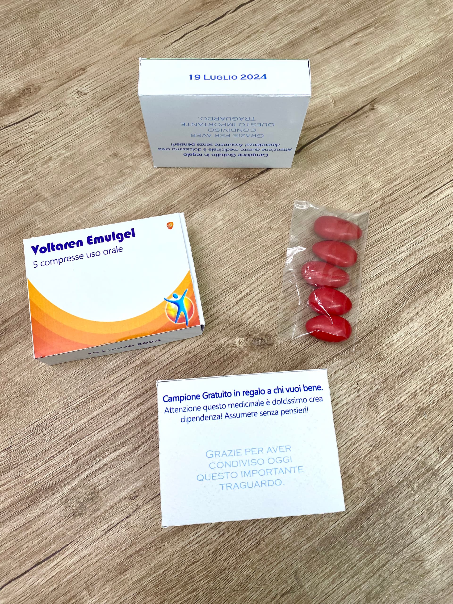 Vuoi festeggiare la tua laurea in modo originale e divertente? Regala ai tuoi invitati queste simpatiche scatoline portaconfetti a forma di scatola di pillole, personalizzabili con il tuo nome, la data e il titolo di studio. Ogni scatolina contiene 5 confetti al cioccolato, disponibili in vari gusti e colori. Le scatoline sono realizzate in cartoncino di alta qualità, con stampa e chiusura a incastro. Sono ideali per decorare il tavolo della confettata o da abbinare ad altri gadget laurea. Con queste scatoline portaconfetti, renderai la tua festa di laurea unica e indimenticabile! Ordinale ora.