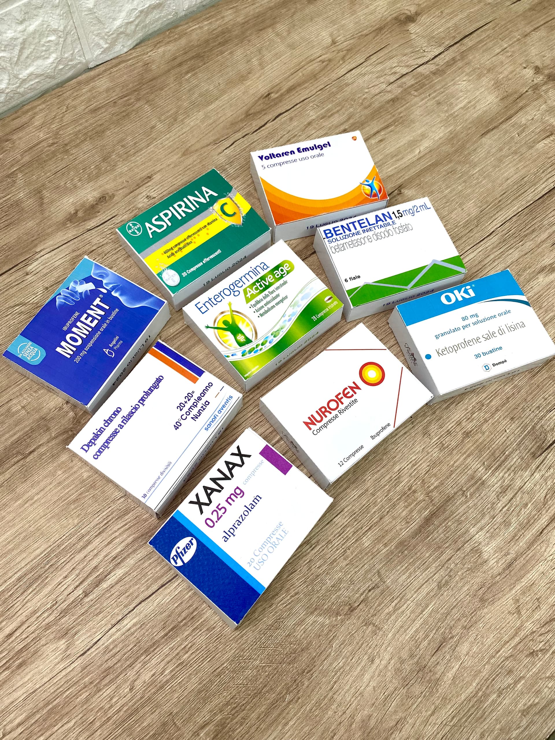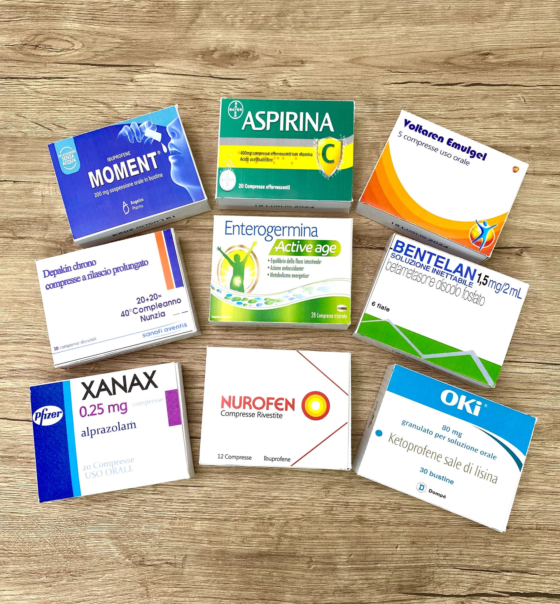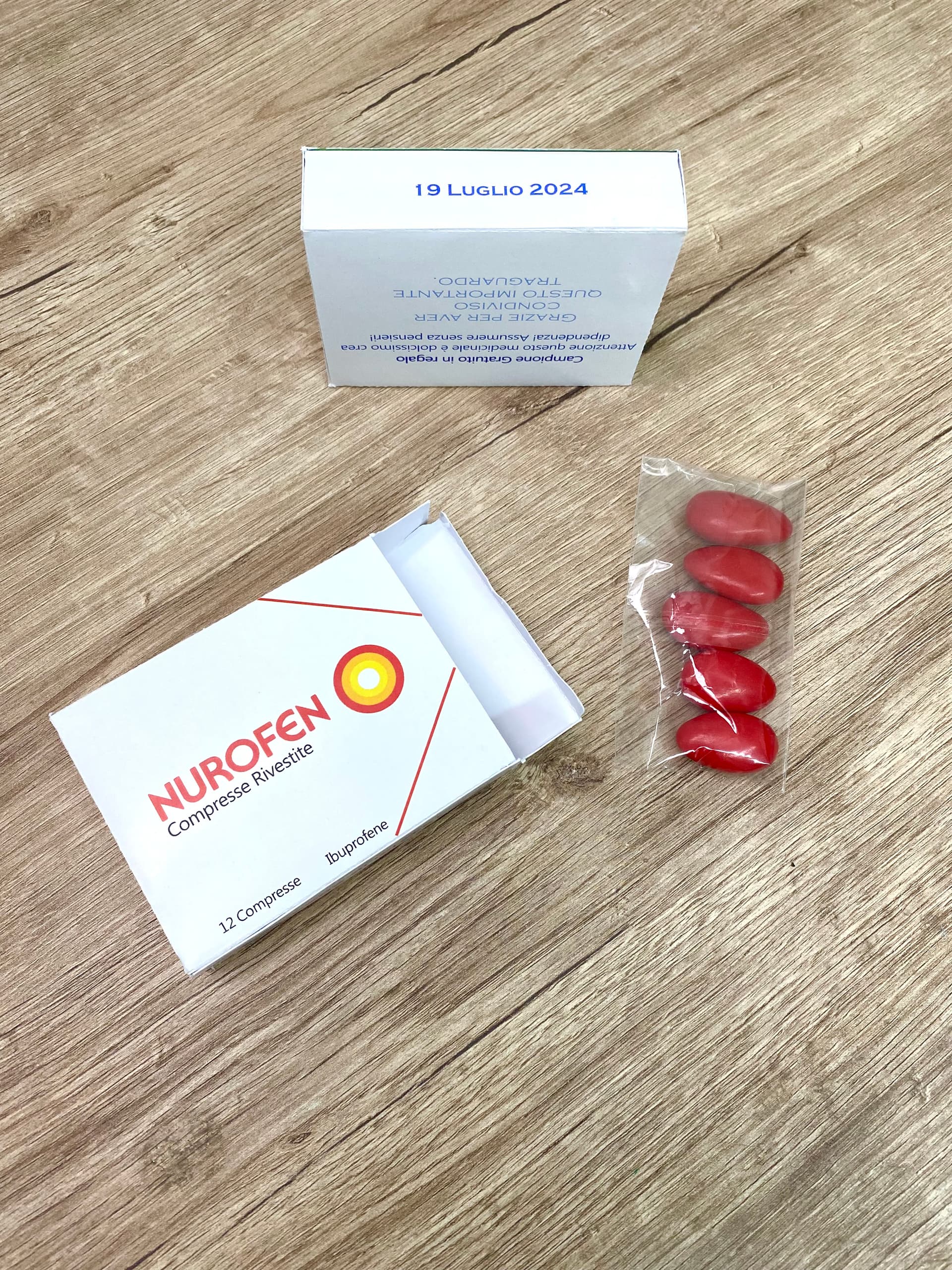 Scatoline con stampa stile farmaci e testo personalizzato, puoi scegliere tu quale ricevere se miste o di un solo tipo, scrivilo nel riquadro qui sotto per la personalizzazione.
