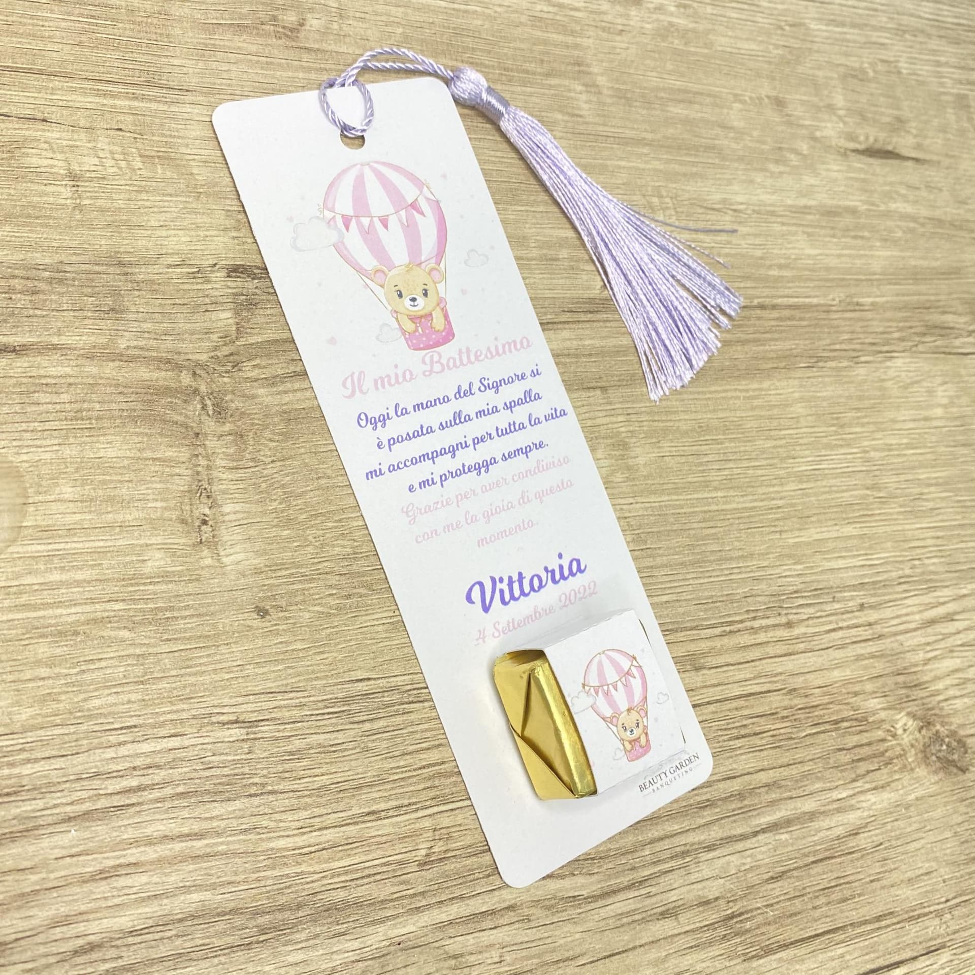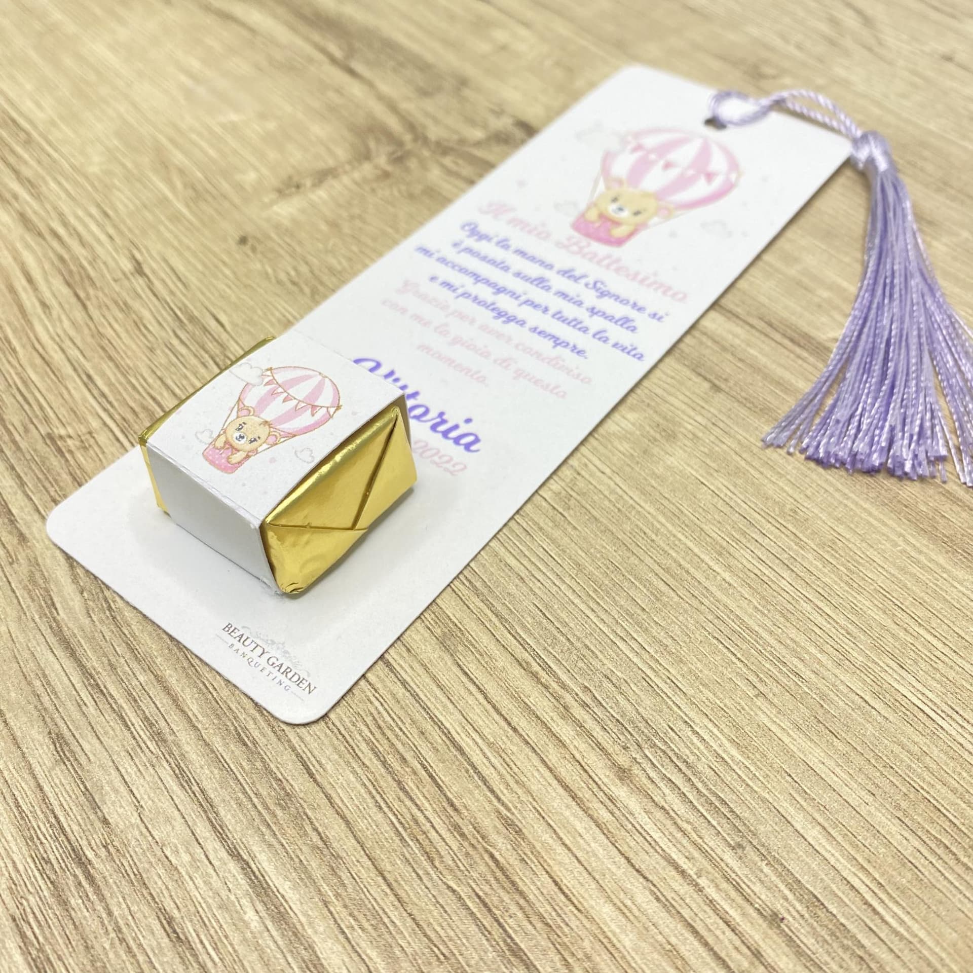 Segnalibro in cartoncino, con stampa personalizzata e un delizioso cioccolatino cremino in vari gusti assortiti. E' possibile personalizzare la grafica su richiesta, che verrà elaborata dopo l'ordine.