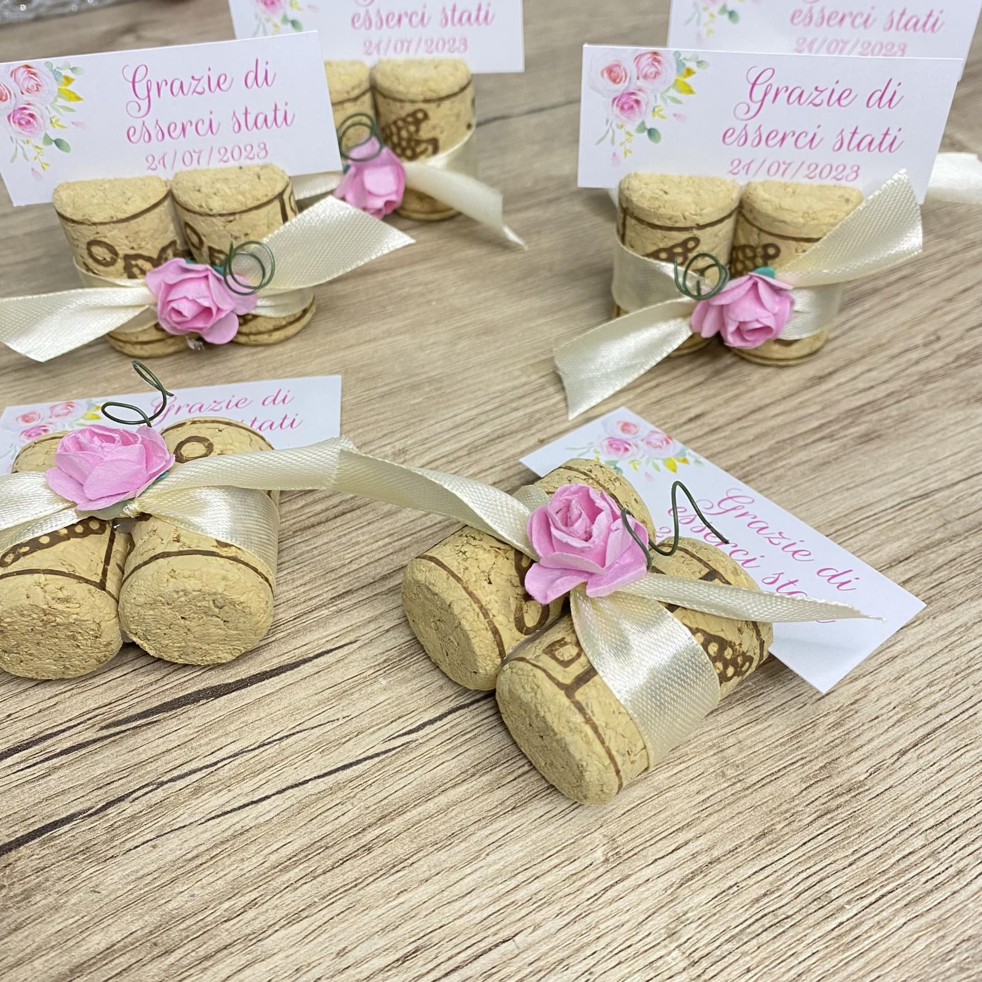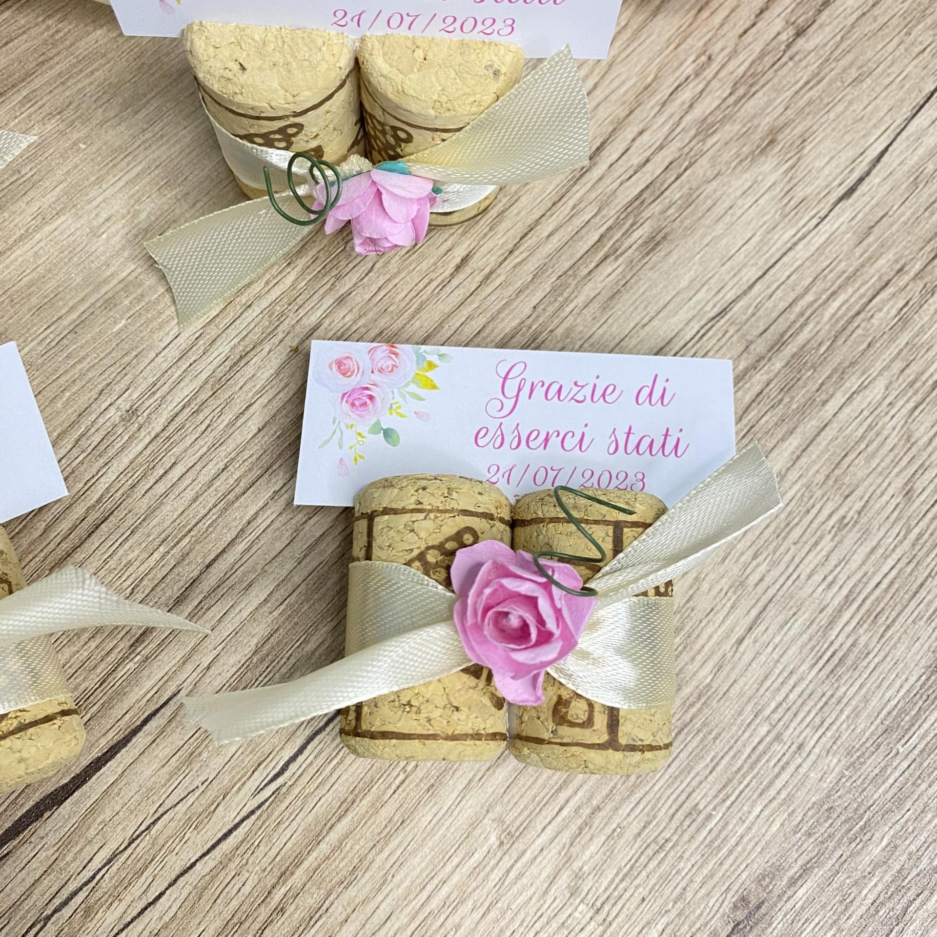 I due tappi in sughero, un materiale terroso e naturale, sono come gemelli affiatati che custodiscono un mondo di eleganza. Decorati con nastrini dai colori scelti con cura, avvolti intorno a loro come abbracci affettuosi, trasmettono un senso di calore e intimità. Questi nastrini, con le loro sfumature e tonalità, possono essere l'armonia perfetta con il tema del matrimonio o possono essere un'accattivante dichiarazione di stile, completando l'estetica con il loro tocco raffinato.