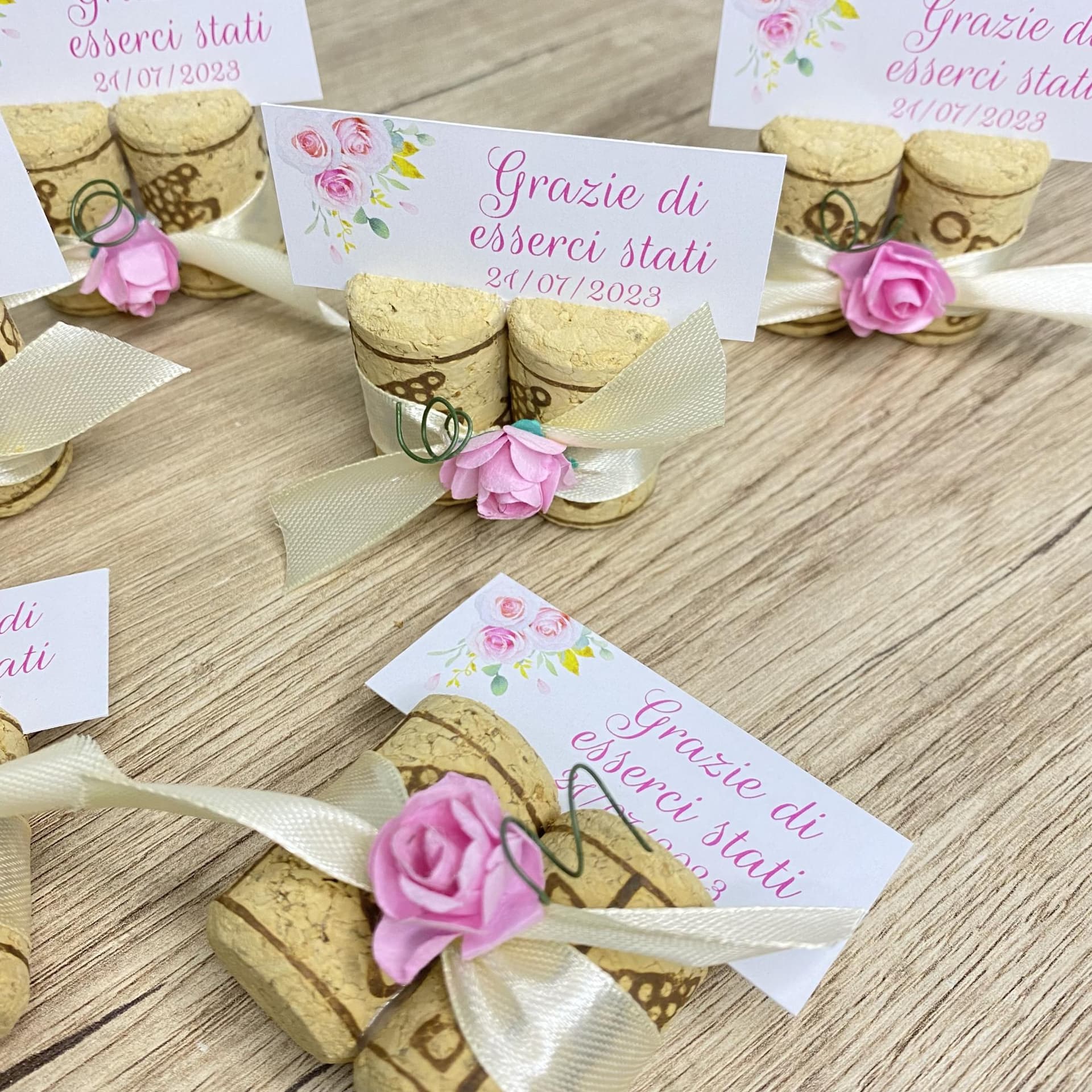 Segnaposto in sughero, composti da 2 tappi assemblati con un nastrino e un fiore colorato a vostra scelta