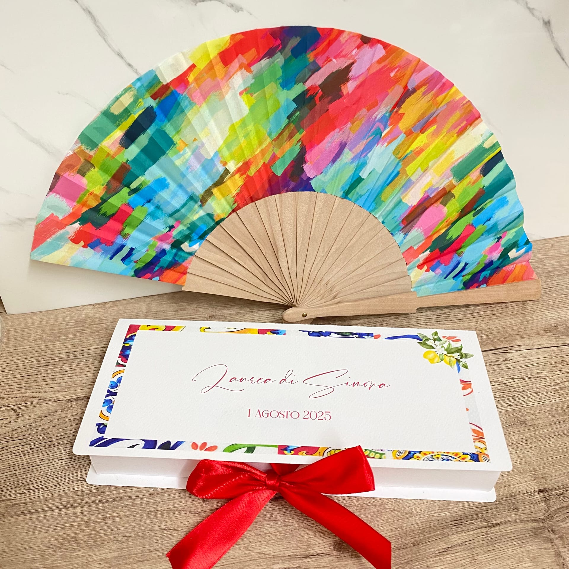 Il ventaglio in legno, robusto e con delle stampe brillanti in diversi temi disponibili,, siciliano, colorato, floreale, unisce tradizione e stile, trasformandosi in un ricordo prezioso per i tuoi ospiti.