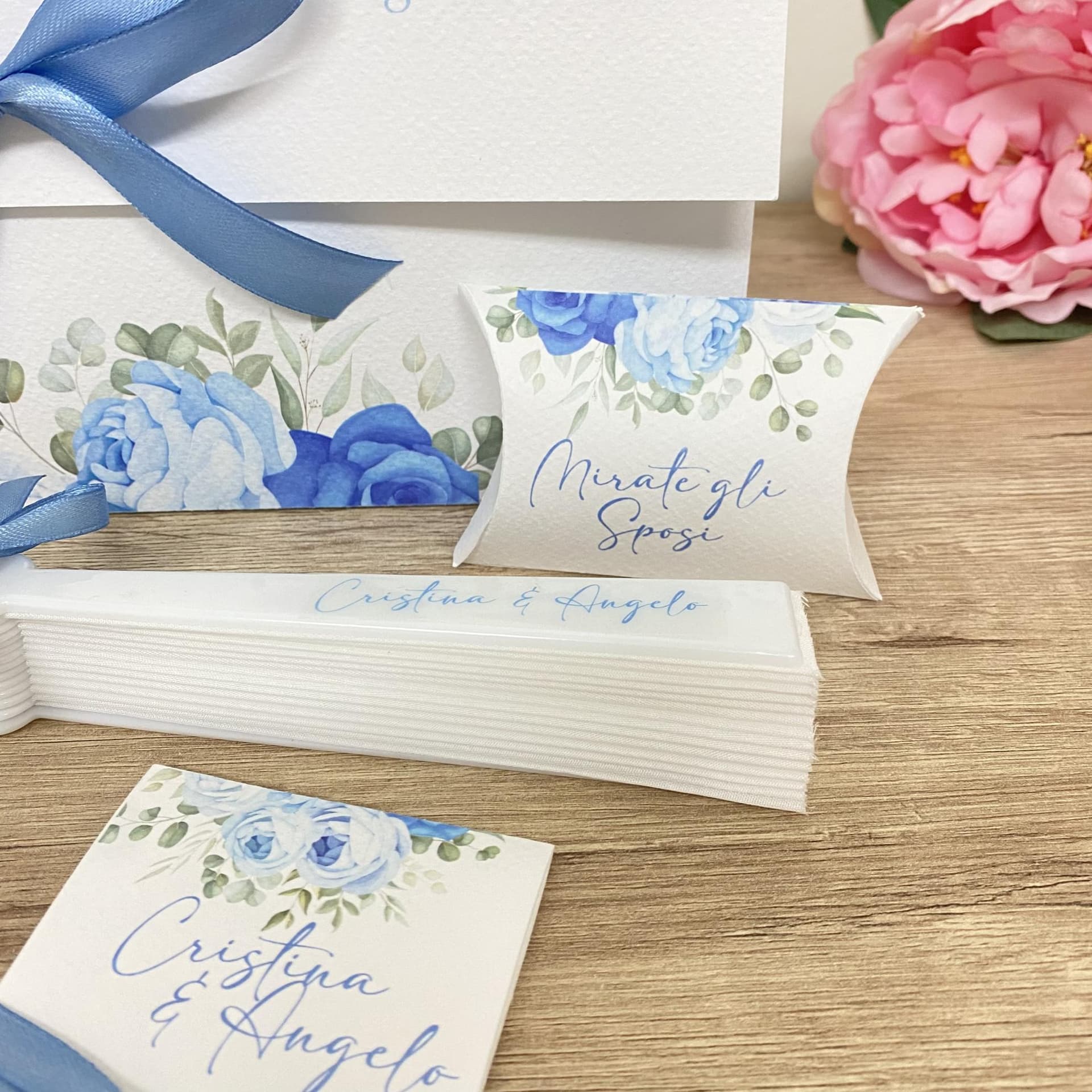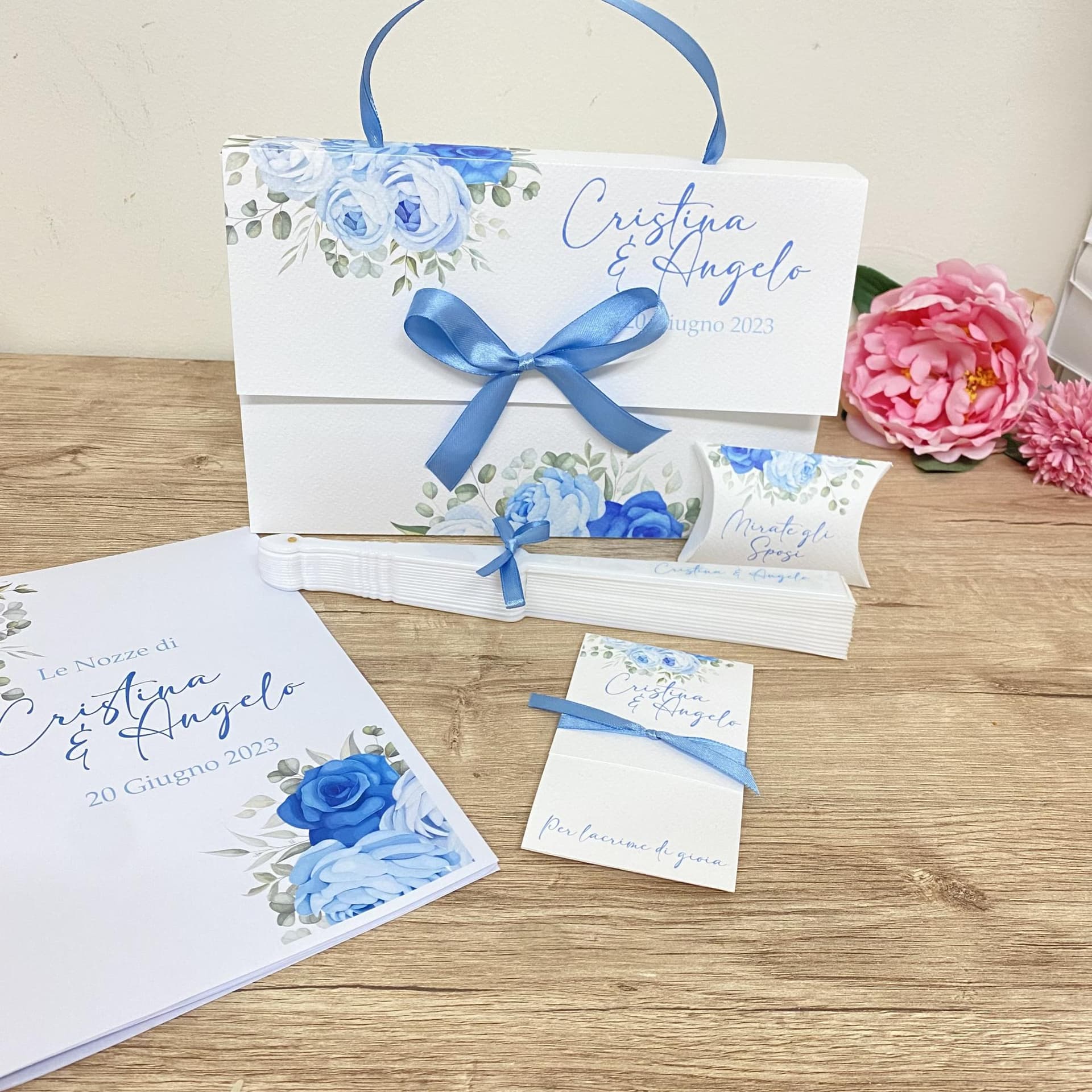 Se vuoi rendere il tuo matrimonio indimenticabile, non puoi rinunciare al nostro kit wedding bag. Si tratta di una borsina in cartoncino, che contiene tutto il necessario per accompagnare i tuoi invitati durante la cerimonia. All’interno troverai un libretto messa, un ventaglio, un fazzolettino per le lacrime di gioia e una scatolina porta riso. Ogni elemento è personalizzabile con i colori e i motivi che più ti piacciono. Il kit wedding bag è un dettaglio di classe che farà sentire i tuoi ospiti speciali e coccolati.