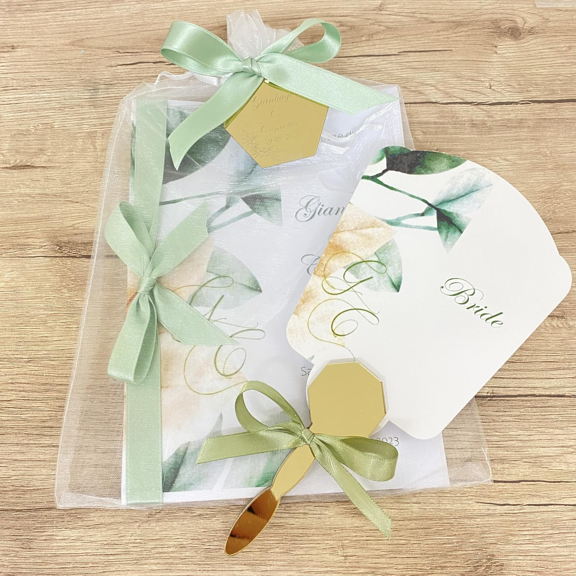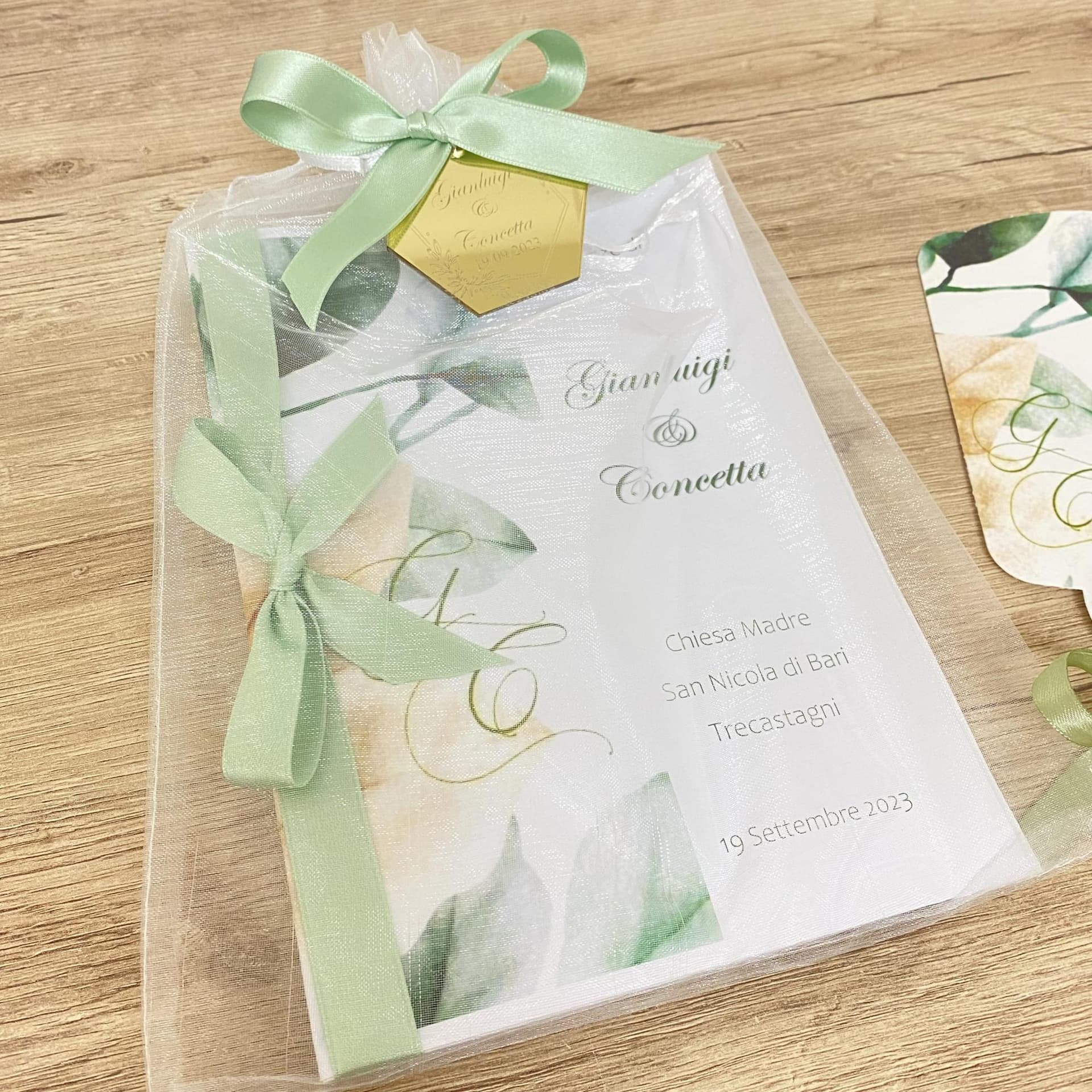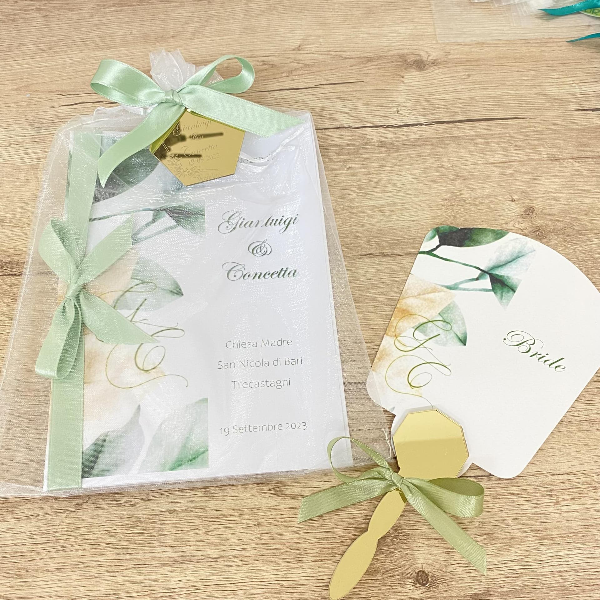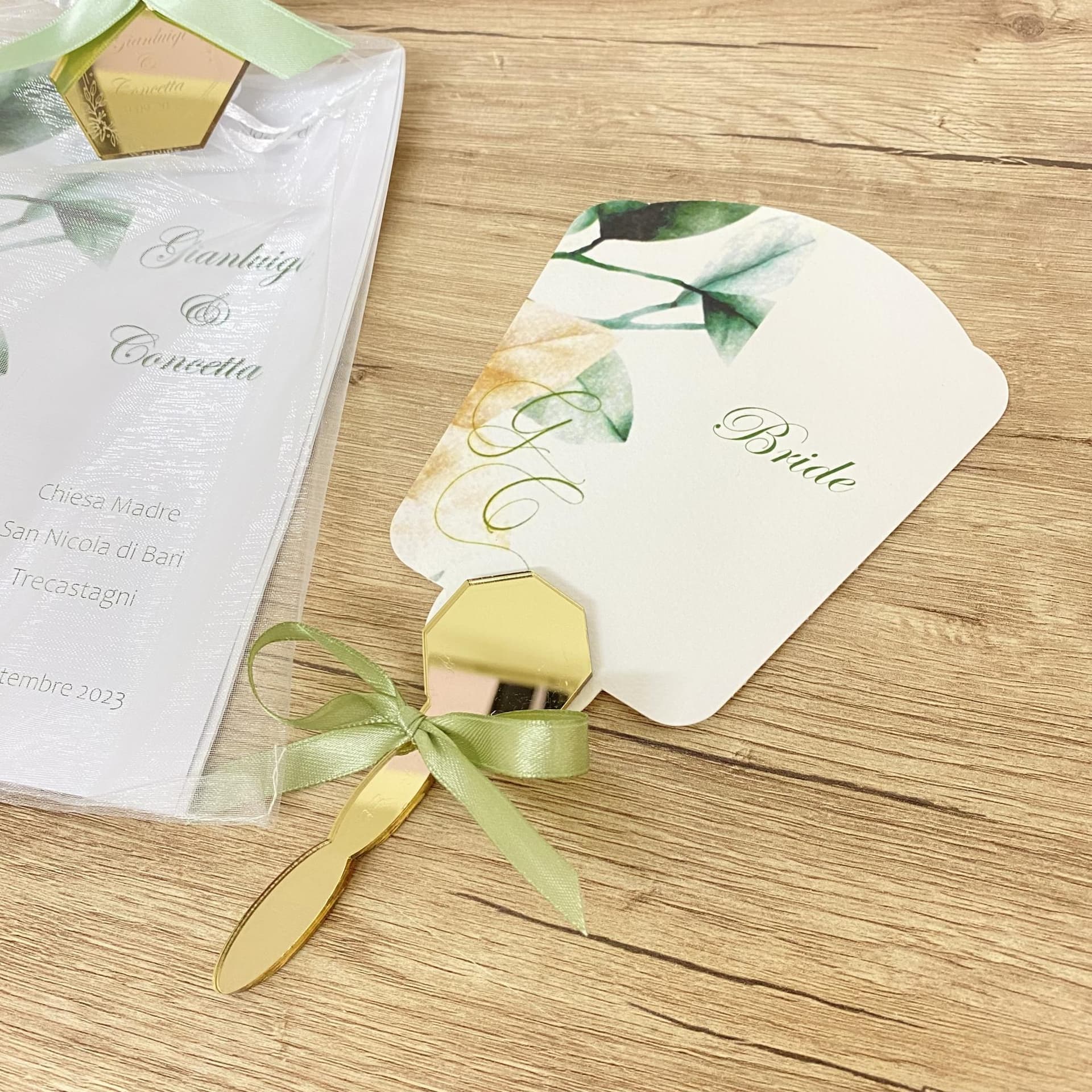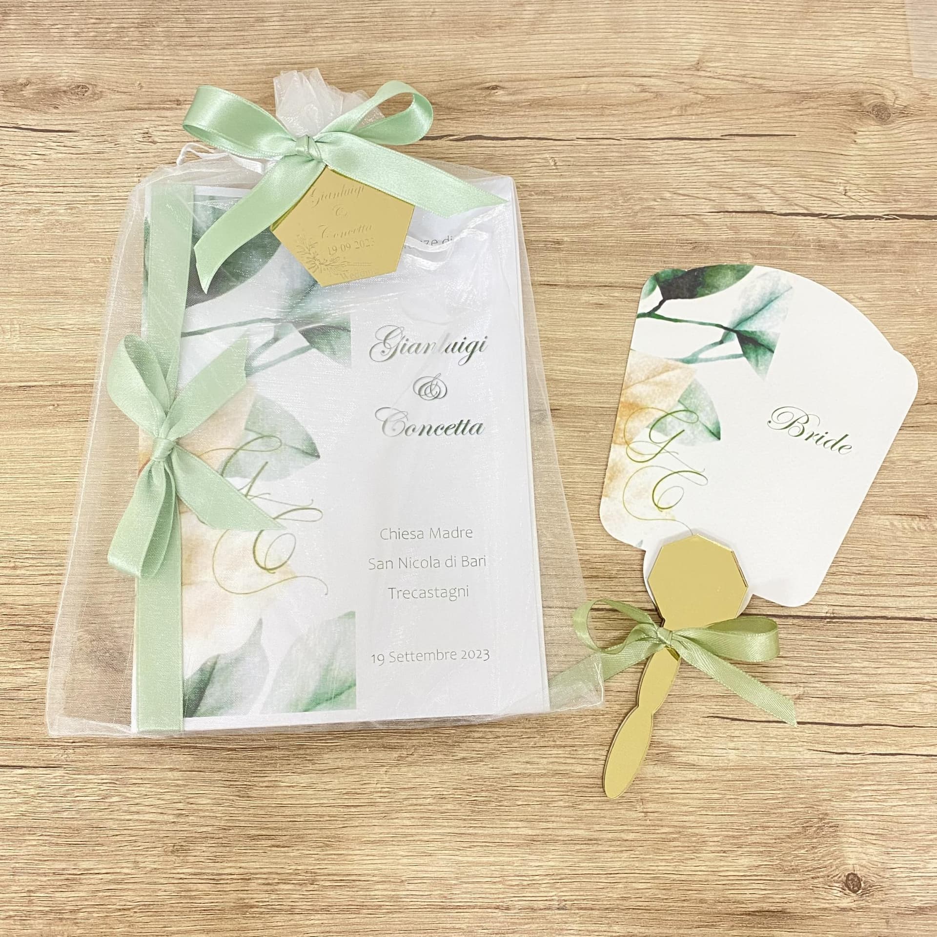 Il kit comprende un saccheto in organza con un tag in plexiglass personalizzato, con all'interno un libretto messa e un ventaglio, per rendere la cerimonia più fresca e piacevole.
