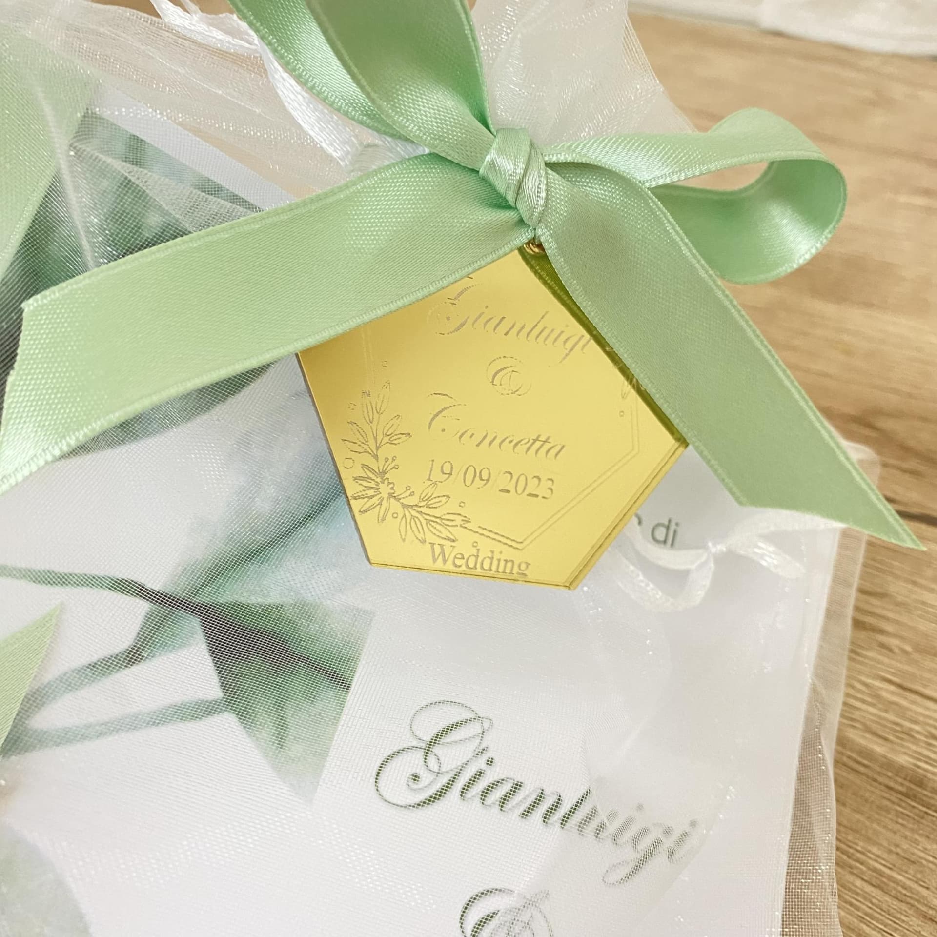 - Sacchetto in organza con fiocco e tag personalizzato in plexiglass