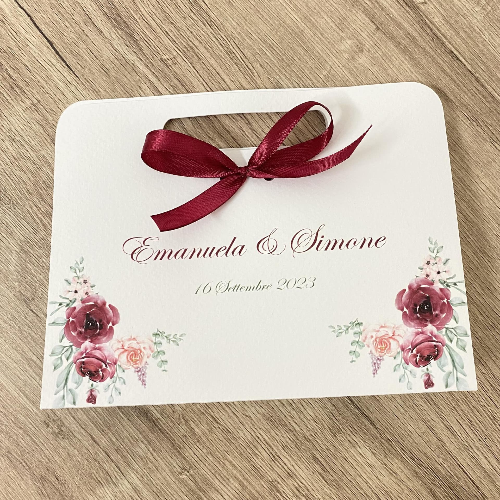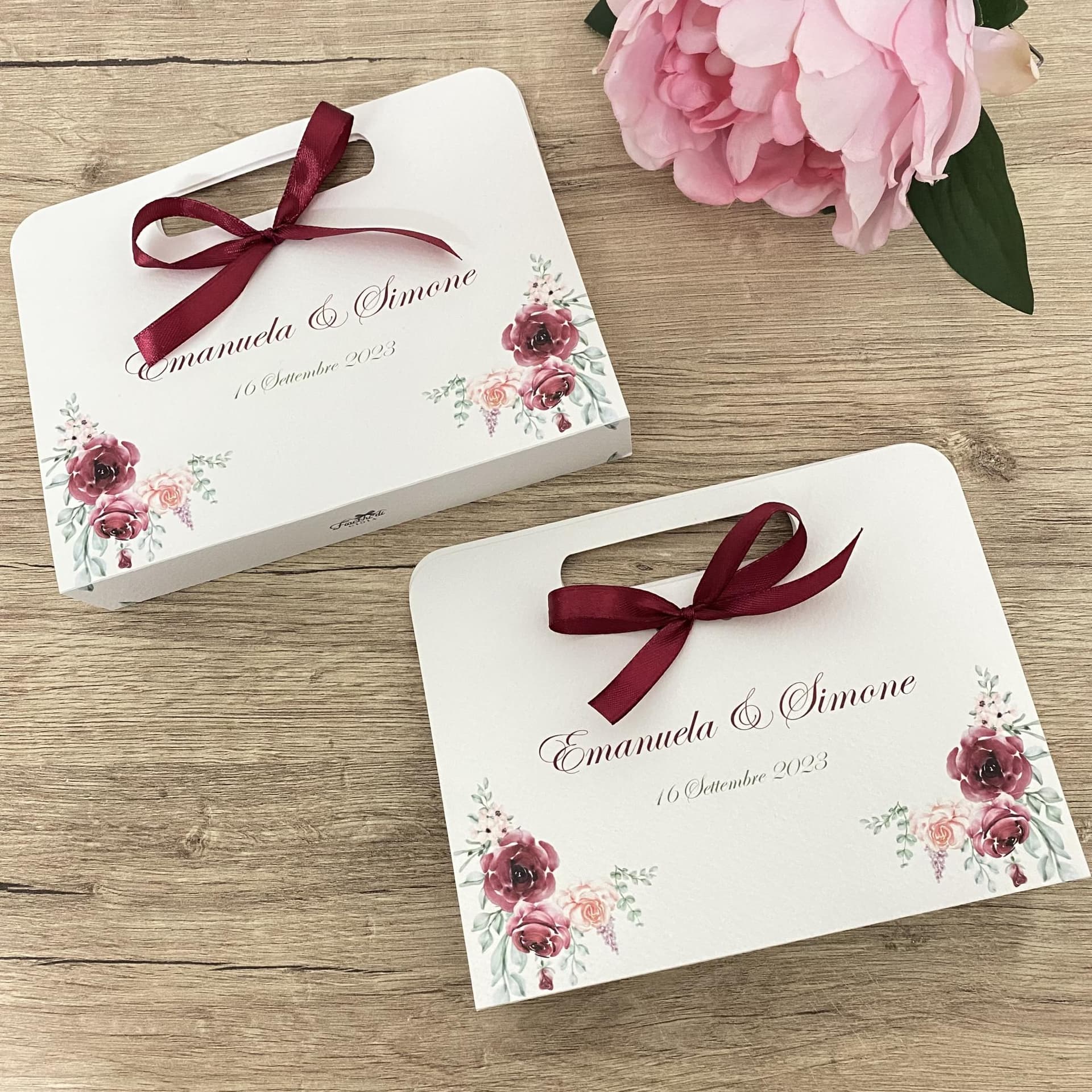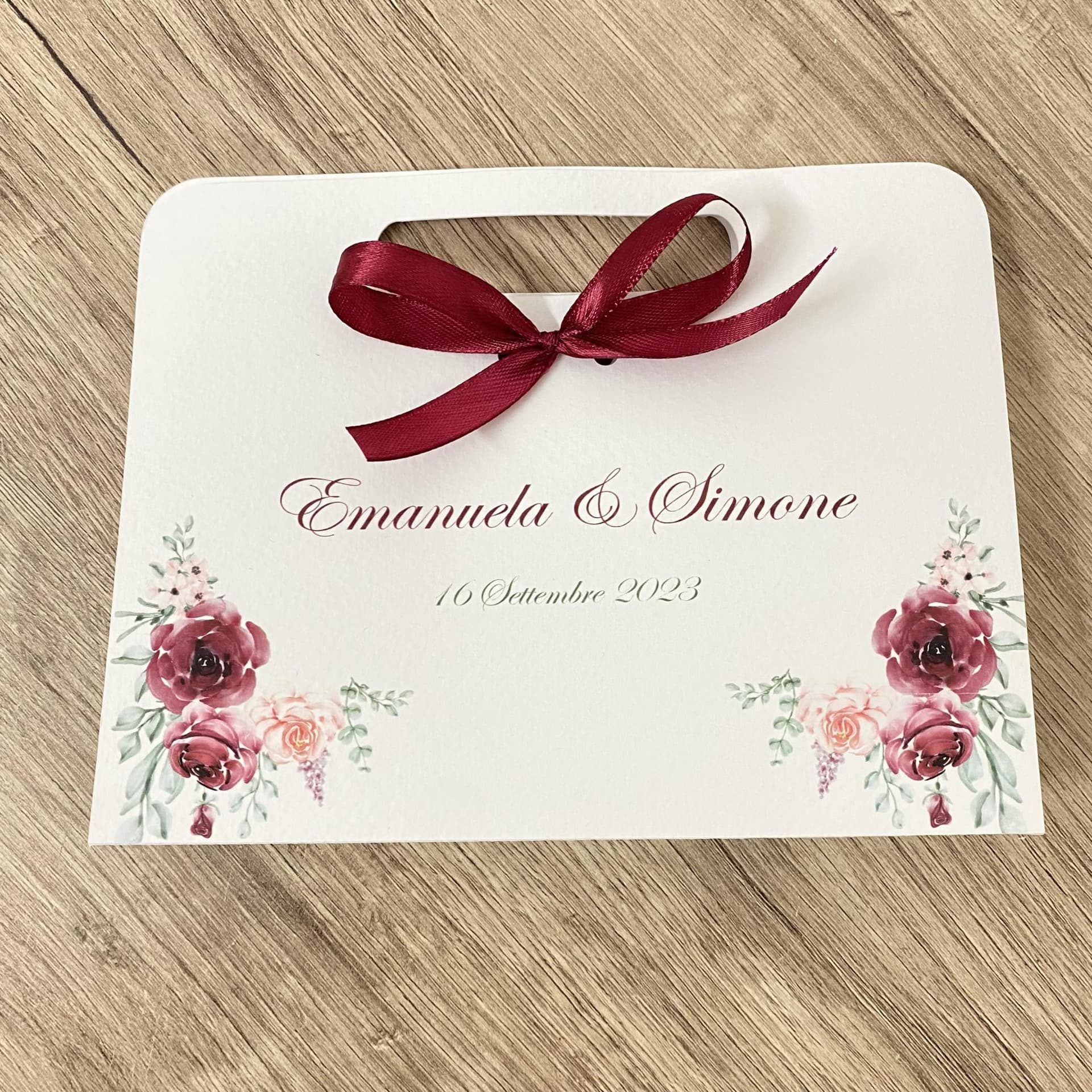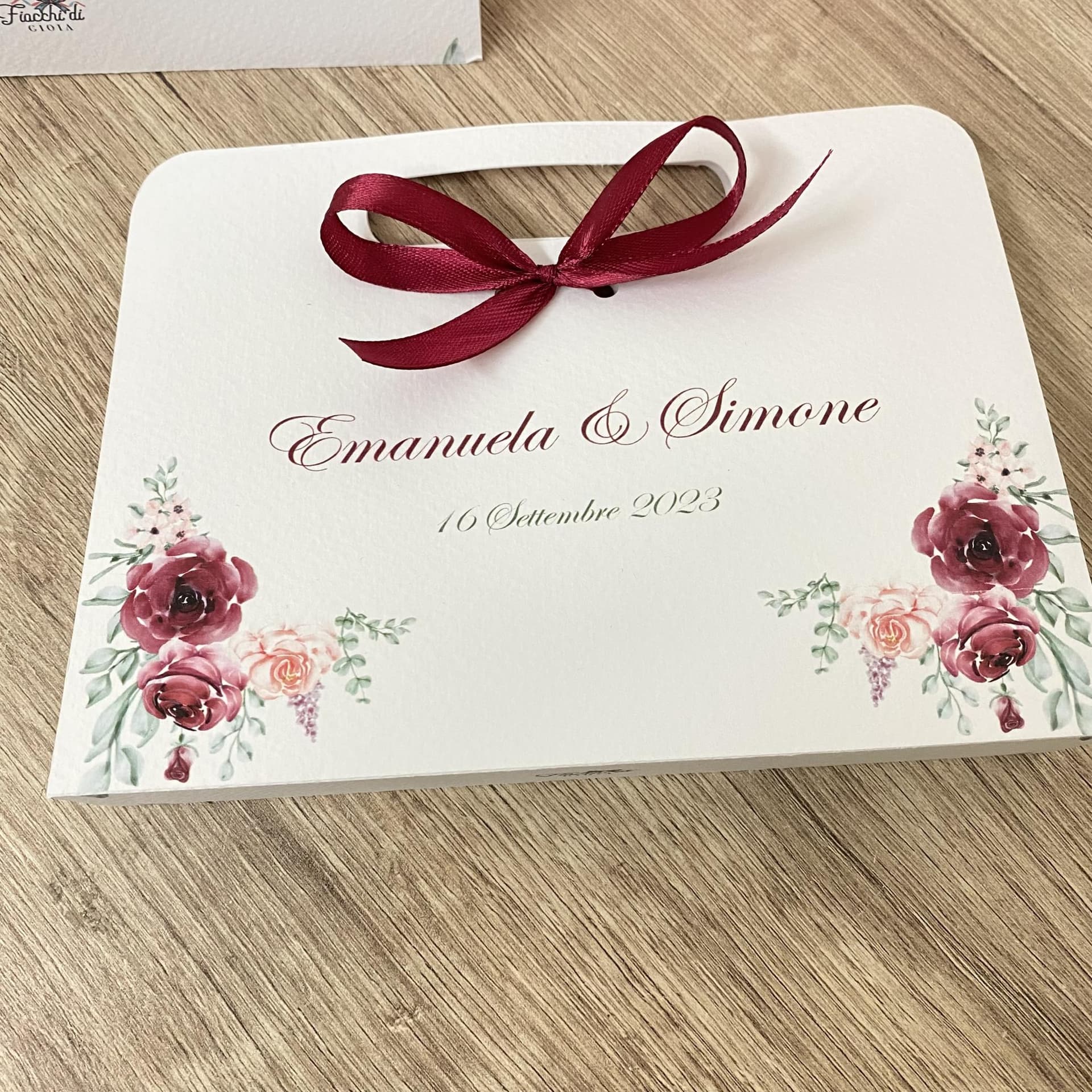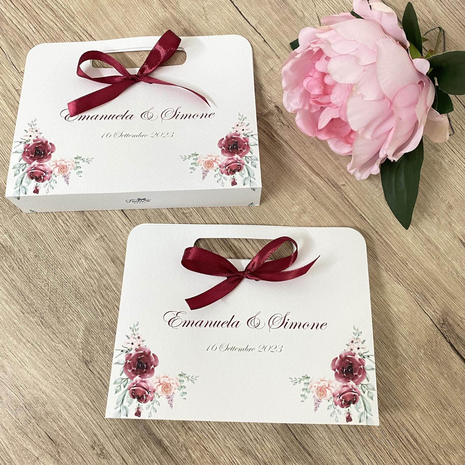 Si tratta di una borsetta in cartoncino martellato, con una stampa elegante e romantica, che contiene al suo interno un mini kit di prodotti utili e di qualità. Il mini kit comprende un fazzoletto di carta, una bustina di riso, una fialetta per bolle di sapone e un ventaglio di carta a forma di cuore. Tutti i prodotti sono personalizzabili con il tuo nome e la data del tuo evento, per renderli ancora più esclusivi e ricercati. La wedding bag mini kit Martina è un modo simpatico e originale di ringraziare i tuoi ospiti per aver partecipato al tuo giorno più bello, e di farli sentire coccolati e curati. Non perdere l’occasione di acquistare la wedding bag mini kit Martina, che unisce stile, utilità e originalità in un solo prodotto.