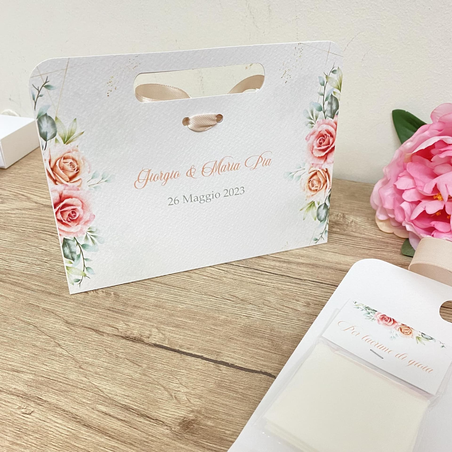 Si tratta di una borsetta in cartoncino martellato, con una stampa elegante e romantica, che contiene al suo interno un mini kit di prodotti utili e di qualità. Il mini kit comprende un fazzoletto di carta, una bustina di riso, una fialetta per bolle di sapone e un ventaglio di carta a forma di cuore. Tutti i prodotti sono personalizzabili con il tuo nome e la data del tuo evento, per renderli ancora più esclusivi e ricercati. La wedding bag mini kit Martina è un modo simpatico e originale di ringraziare i tuoi ospiti per aver partecipato al tuo giorno più bello, e di farli sentire coccolati e curati. Non perdere l’occasione di acquistare la wedding bag mini kit Martina, che unisce stile, utilità e originalità in un solo prodotto.