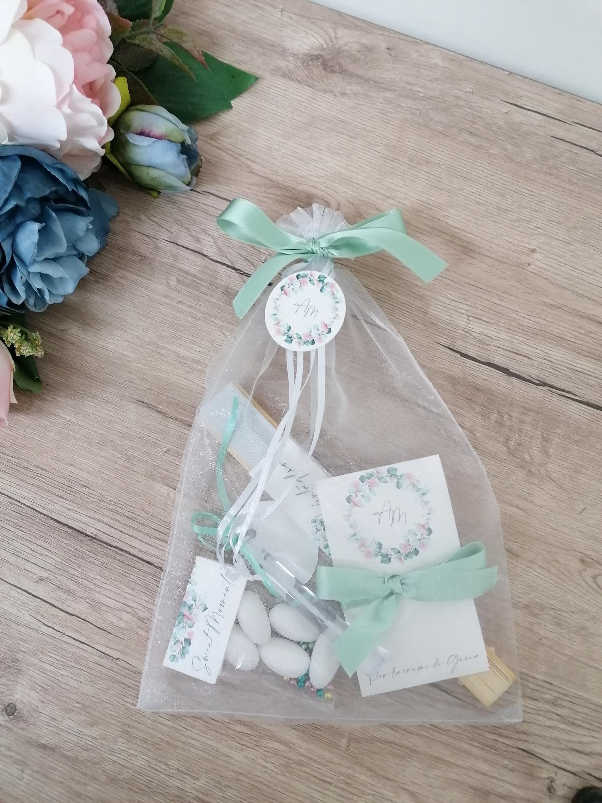 Elegante set racchiuso in sacchetto in organza, completamente personalizzabile a livello grafico.