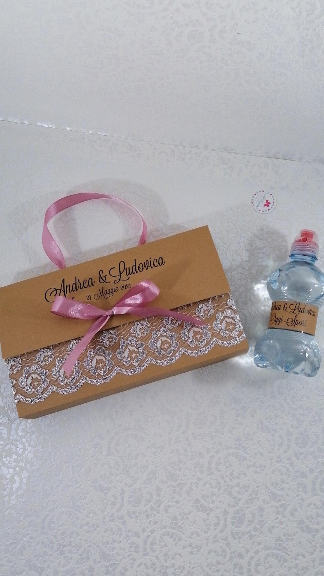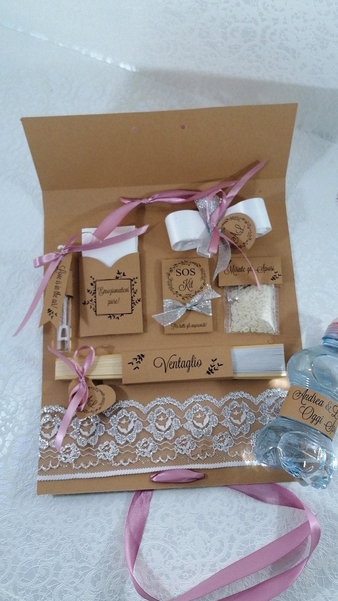 Un wedding bag set diverso dal solito con uno stile piu rustico ma reso glamour dal luccichio del nastro bianco e argento lame'